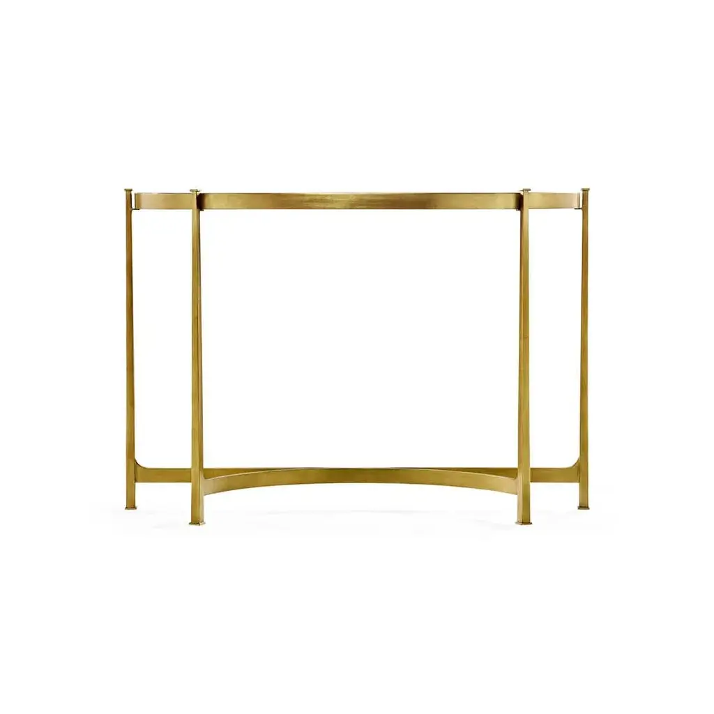 Crafted from wrought iron, it features an antique gilded finish and a stunning églomisé top. With dimensions of 48.25" W x 14" D x 33.5" H, this console table is the perfect size to fit into any room. Not only is it visually stunning, but it's also highly functional. The sturdy construction ensures it withstands daily wear and tear while maintaining its striking appearance. Elevate your space with the Art Deco Gilded Demi Lune Console Table and order now to experience its beauty for yourself. Dimensions: 48.25" W x 14" D x 33.5" H