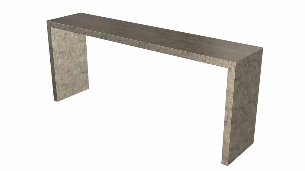 Alison Spear designed this elegant and minimal table for Stephanie Odegard during their trip together to Rajasthan, India. The craftsmen create patterns using different types of hammerings in the metal sheets clad over teak-wood structure.Crafted with utmost care and attention to detail, these Rectangular Console Tables are made to order and are available in twelve metal clad finishes, ensuring that you can choose the perfect one to match your individual style and taste. The use of high-quality materials and expert craftsmanship ensure that each Art Deco Rectangular Console Table is not only beautiful but also a true piece of art.The Straight legs and side arms of this Art Deco Rectangular Console Table are hand carved from solid pieces of teak. Pattern makers trace and cut complex forms that will cover the chair in a skin of copper, white bronze, brass or antiqued white bronze The metal finishes will tarnish over time. Regular non-abrasive household metal polishes can be used to restore the original luster.Overall, if you're looking for a piece of furniture that combines luxury, comfort, and style, then the Art Deco Rectangular Console Table is an excellent choice. With its distinctive curved profile and multiple finish options, this Chair set is sure to elevate the look of any room it is placed in, and be a beloved addition to your home for years to come.The images shown in this listing are shot in different lighting conditions and/or are 3D illustrations. We encourage our customers to please request a sample or a full sample set of 12 finishes so that they can experience the finish first hand. Art deco Industrial and Work Console Tables Antique Bronze Fine Hammered by Alison SpearSize- 72"x 16"x 30"HMaterials - Antique Bronze, Metal sheet, Teak, Wood, MetalTechniques: Hand-Crafted, Hand-Carved, Metal Work, Wood Work, Metal Wrapping, PolishedPlease note that moisture in air, sudden change in temperature and natural movement of wood over time causes the metal to wrinkle or bubble up. We use well seasoned, reclaimed teak and high quality marine grade MDF (wherever technically possible) to avoid and delay the mentioned changes. However a perfect stability of metal cannot be guaranteed. Please note that our smooth finish metal clad pieces will have some unavoidable tool marks. This is proof that everything is done by hand. The smooth finish will not come out like a machine made perfect surface and the master artisan will do their best to make it look as good/clean/stable/perfect as he possibly can.The antique white bronze finish is hand done by using an acidic chemical over the white bronze finish to recreate a natural patination. Like with the natural patination of silver, copper, or brass, the final result and color uniformity of the patina cannot be guaranteed. The goal of this finish is to achieve rainbow-like shades with dull, shiny, cloudy, and streaky patches to give an illusion of antiquing. Please note:None of our metal clad pieces are treated with a protective “finish” thus enabling the items to age naturally over time. We will of course polish them well before we pack them. a) Copper oxidizes faster than the other metals. In six to twelve months it will most likely lose its shine and will gradually turn to different shades of brown and/or green/blue. This aging process and its effect is referred to as verdigris. After a year the piece should not change much more. Copper does not rust, but does require periodic cleaning in order to retain its original shine if that the preferred option. ('BRASSO' or any known copper polish can be used to polish copper).b) Brass retains its shine for far longer than others, but will tarnish if not cleaned on occasion. ('BRASSO' is made to polish brass).c) White bronze, has the least tendency to show age or tarnish. If kept in a controlled climate, this metal will hold its shine for years. It can be cleaned with a cleanser and polished with a cloth. d) The antiqued white bronze finish will react with the natural elements the fastest in the beginning but it too will stop reacting and will settle down in a stable state like copper after 6-12 months. Since it is already antiqued and looked like it is tarnished, as described in an earlier message, this fast reaction will not change the over all look. In that way this surface is most forgiving. The images shown in this listing are shot in different lighting conditions and/or are 3D illustrations. We encourage our customers to please request a sample or a full sample set of 12 finishes so that they can experience the finish first hand.