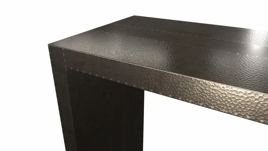 Alison Spear designed this elegant and minimal table for Stephanie Odegard during their trip together to Rajasthan, India. The craftsmen create patterns using different types of hammerings in the metal sheets clad over teak-wood structure.Crafted with utmost care and attention to detail, these Rectangular Console Tables are made to order and are available in twelve metal clad finishes, ensuring that you can choose the perfect one to match your individual style and taste. The use of high-quality materials and expert craftsmanship ensure that each Art Deco Rectangular Console Table is not only beautiful but also a true piece of art.The Straight legs and side arms of this Art Deco Rectangular Console Table are hand carved from solid pieces of teak. Pattern makers trace and cut complex forms that will cover the chair in a skin of copper, white bronze, brass or antiqued white bronze The metal finishes will tarnish over time. Regular non-abrasive household metal polishes can be used to restore the original luster.Overall, if you're looking for a piece of furniture that combines luxury, comfort, and style, then the Art Deco Rectangular Console Table is an excellent choice. With its distinctive curved profile and multiple finish options, this Chair set is sure to elevate the look of any room it is placed in, and be a beloved addition to your home for years to come.The images shown in this listing are shot in different lighting conditions and/or are 3D illustrations. We encourage our customers to please request a sample or a full sample set of 12 finishes so that they can experience the finish first hand. Art Deco Industrial and Work Console Tables in Antique Bronze Mid. Hammered by Alison SpearSize- 72"x 16"x 30"HMaterials - Antique Bronze, Metal sheet, Teak, Wood, MetalTechniques: Hand-Crafted, Hand-Carved, Metal Work, Wood Work, Metal Wrapping, PolishedPlease note that moisture in air, sudden change in temperature and natural movement of wood over time causes the metal to wrinkle or bubble up. We use well seasoned, reclaimed teak and high quality marine grade MDF (wherever technically possible) to avoid and delay the mentioned changes. However a perfect stability of metal cannot be guaranteed. Please note that our smooth finish metal clad pieces will have some unavoidable tool marks. This is proof that everything is done by hand. The smooth finish will not come out like a machine made perfect surface and the master artisan will do their best to make it look as good/clean/stable/perfect as he possibly can.The antique white bronze finish is hand done by using an acidic chemical over the white bronze finish to recreate a natural patination. Like with the natural patination of silver, copper, or brass, the final result and color uniformity of the patina cannot be guaranteed. The goal of this finish is to achieve rainbow-like shades with dull, shiny, cloudy, and streaky patches to give an illusion of antiquing. Please note:None of our metal clad pieces are treated with a protective “finish” thus enabling the items to age naturally over time. We will of course polish them well before we pack them. a) Copper oxidizes faster than the other metals. In six to twelve months it will most likely lose its shine and will gradually turn to different shades of brown and/or green/blue. This aging process and its effect is referred to as verdigris. After a year the piece should not change much more. Copper does not rust, but does require periodic cleaning in order to retain its original shine if that the preferred option. ('BRASSO' or any known copper polish can be used to polish copper).b) Brass retains its shine for far longer than others, but will tarnish if not cleaned on occasion. ('BRASSO' is made to polish brass).c) White bronze, has the least tendency to show age or tarnish. If kept in a controlled climate, this metal will hold its shine for years. It can be cleaned with a cleanser and polished with a cloth. d) The antiqued white bronze finish will react with the natural elements the fastest in the beginning but it too will stop reacting and will settle down in a stable state like copper after 6-12 months. Since it is already antiqued and looked like it is tarnished, as described in an earlier message, this fast reaction will not change the over all look. In that way this surface is most forgiving. The images shown in this listing are shot in different lighting conditions and/or are 3D illustrations. We encourage our customers to please request a sample or a full sample set of 12 finishes so that they can experience the finish first hand.