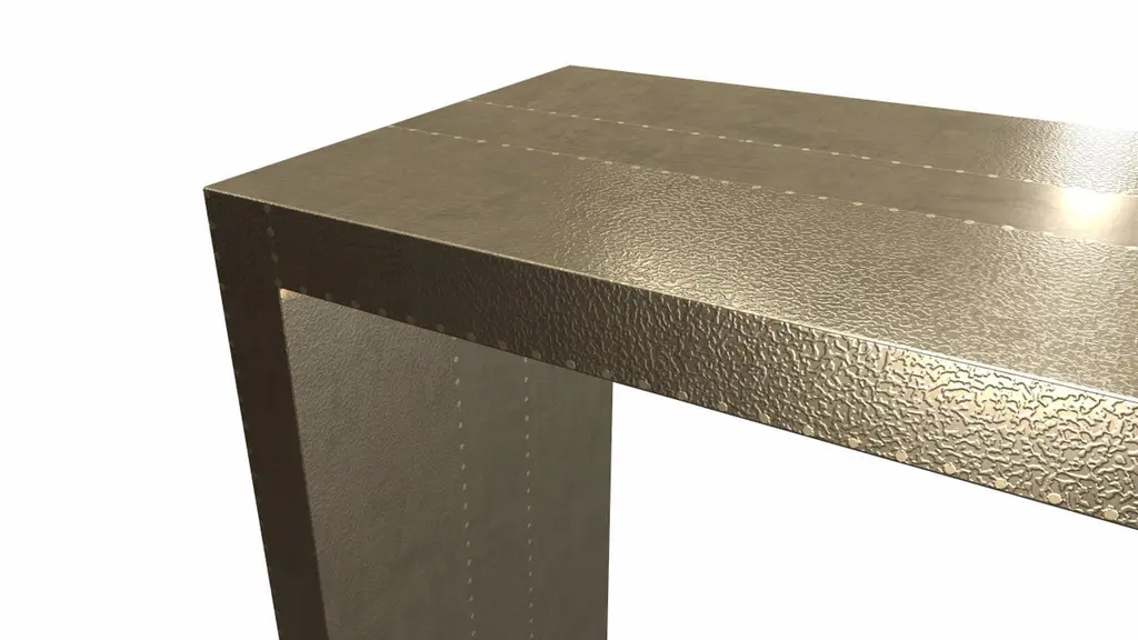 Alison Spear designed this elegant and minimal table for Stephanie Odegard during their trip together to Rajasthan, India. The craftsmen create patterns using different types of hammerings in the metal sheets clad over teak-wood structure.Crafted with utmost care and attention to detail, these Rectangular Console Tables are made to order and are available in twelve metal clad finishes, ensuring that you can choose the perfect one to match your individual style and taste. The use of high-quality materials and expert craftsmanship ensure that each Art Deco Rectangular Console Table is not only beautiful but also a true piece of art.The Straight legs and side arms of this Art Deco Rectangular Console Table are hand carved from solid pieces of teak. Pattern makers trace and cut complex forms that will cover the chair in a skin of copper, white bronze, brass or antiqued white bronze The metal finishes will tarnish over time. Regular non-abrasive household metal polishes can be used to restore the original luster.Overall, if you're looking for a piece of furniture that combines luxury, comfort, and style, then the Art Deco Rectangular Console Table is an excellent choice. With its distinctive curved profile and multiple finish options, this Chair set is sure to elevate the look of any room it is placed in, and be a beloved addition to your home for years to come.The images shown in this listing are shot in different lighting conditions and/or are 3D illustrations. We encourage our customers to please request a sample or a full sample set of 12 finishes so that they can experience the finish first hand. Art Deco Industrial and Work Console Tables in Copper Fine Hammered by Alison Spear for Stephanie OdegardSize- 72"x 16"x 30"HMaterials - Brass, Metal sheet, Teak, Wood, MetalTechniques: Hand-Crafted, Hand-Carved, Metal Work, Wood Work, Metal Wrapping, PolishedPlease note that moisture in air, sudden change in temperature and natural movement of wood over time causes the metal to wrinkle or bubble up. We use well seasoned, reclaimed teak and high quality marine grade MDF (wherever technically possible) to avoid and delay the mentioned changes. However a perfect stability of metal cannot be guaranteed. Please note that our smooth finish metal clad pieces will have some unavoidable tool marks. This is proof that everything is done by hand. The smooth finish will not come out like a machine made perfect surface and the master artisan will do their best to make it look as good/clean/stable/perfect as he possibly can.The antique white bronze finish is hand done by using an acidic chemical over the white bronze finish to recreate a natural patination. Like with the natural patination of silver, copper, or brass, the final result and color uniformity of the patina cannot be guaranteed. The goal of this finish is to achieve rainbow-like shades with dull, shiny, cloudy, and streaky patches to give an illusion of antiquing. Please note:None of our metal clad pieces are treated with a protective “finish” thus enabling the items to age naturally over time. We will of course polish them well before we pack them. a) Copper oxidizes faster than the other metals. In six to twelve months it will most likely lose its shine and will gradually turn to different shades of brown and/or green/blue. This aging process and its effect is referred to as verdigris. After a year the piece should not change much more. Copper does not rust, but does require periodic cleaning in order to retain its original shine if that the preferred option. ('BRASSO' or any known copper polish can be used to polish copper).b) Brass retains its shine for far longer than others, but will tarnish if not cleaned on occasion. ('BRASSO' is made to polish brass).c) White bronze, has the least tendency to show age or tarnish. If kept in a controlled climate, this metal will hold its shine for years. It can be cleaned with a cleanser and polished with a cloth. d) The antiqued white bronze finish will react with the natural elements the fastest in the beginning but it too will stop reacting and will settle down in a stable state like copper after 6-12 months. Since it is already antiqued and looked like it is tarnished, as described in an earlier message, this fast reaction will not change the over all look. In that way this surface is most forgiving. The images shown in this listing are shot in different lighting conditions and/or are 3D illustrations. We encourage our customers to please request a sample or a full sample set of 12 finishes so that they can experience the finish first hand.