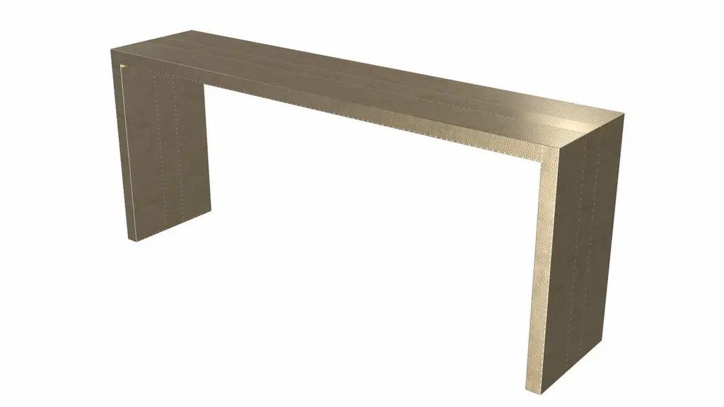 Alison Spear designed this elegant and minimal table for Stephanie Odegard during their trip together to Rajasthan, India. The craftsmen create patterns using different types of hammerings in the metal sheets clad over teak-wood structure.Crafted with utmost care and attention to detail, these Rectangular Console Tables are made to order and are available in twelve metal clad finishes, ensuring that you can choose the perfect one to match your individual style and taste. The use of high-quality materials and expert craftsmanship ensure that each Art Deco Rectangular Console Table is not only beautiful but also a true piece of art.The Straight legs and side arms of this Art Deco Rectangular Console Table are hand carved from solid pieces of teak. Pattern makers trace and cut complex forms that will cover the chair in a skin of copper, white bronze, brass or antiqued white bronze The metal finishes will tarnish over time. Regular non-abrasive household metal polishes can be used to restore the original luster.Overall, if you're looking for a piece of furniture that combines luxury, comfort, and style, then the Art Deco Rectangular Console Table is an excellent choice. With its distinctive curved profile and multiple finish options, this Chair set is sure to elevate the look of any room it is placed in, and be a beloved addition to your home for years to come.The images shown in this listing are shot in different lighting conditions and/or are 3D illustrations. We encourage our customers to please request a sample or a full sample set of 12 finishes so that they can experience the finish first hand. Art Deco Industrial and Work Console Tables Mid. Hammered in Brass by Alison SpearSize- 72"x 16"x 30"HMaterials - Brass, Metal sheet, Teak, Wood, MetalTechniques: Hand-Crafted, Hand-Carved, Metal Work, Wood Work, Metal Wrapping, PolishedPlease note that moisture in air, sudden change in temperature and natural movement of wood over time causes the metal to wrinkle or bubble up. We use well seasoned, reclaimed teak and high quality marine grade MDF (wherever technically possible) to avoid and delay the mentioned changes. However a perfect stability of metal cannot be guaranteed. Please note that our smooth finish metal clad pieces will have some unavoidable tool marks. This is proof that everything is done by hand. The smooth finish will not come out like a machine made perfect surface and the master artisan will do their best to make it look as good/clean/stable/perfect as he possibly can.The antique white bronze finish is hand done by using an acidic chemical over the white bronze finish to recreate a natural patination. Like with the natural patination of silver, copper, or brass, the final result and color uniformity of the patina cannot be guaranteed. The goal of this finish is to achieve rainbow-like shades with dull, shiny, cloudy, and streaky patches to give an illusion of antiquing. Please note:None of our metal clad pieces are treated with a protective “finish” thus enabling the items to age naturally over time. We will of course polish them well before we pack them. a) Copper oxidizes faster than the other metals. In six to twelve months it will most likely lose its shine and will gradually turn to different shades of brown and/or green/blue. This aging process and its effect is referred to as verdigris. After a year the piece should not change much more. Copper does not rust, but does require periodic cleaning in order to retain its original shine if that the preferred option. ('BRASSO' or any known copper polish can be used to polish copper).b) Brass retains its shine for far longer than others, but will tarnish if not cleaned on occasion. ('BRASSO' is made to polish brass).c) White bronze, has the least tendency to show age or tarnish. If kept in a controlled climate, this metal will hold its shine for years. It can be cleaned with a cleanser and polished with a cloth. d) The antiqued white bronze finish will react with the natural elements the fastest in the beginning but it too will stop reacting and will settle down in a stable state like copper after 6-12 months. Since it is already antiqued and looked like it is tarnished, as described in an earlier message, this fast reaction will not change the over all look. In that way this surface is most forgiving. The images shown in this listing are shot in different lighting conditions and/or are 3D illustrations. We encourage our customers to please request a sample or a full sample set of 12 finishes so that they can experience the finish first hand.