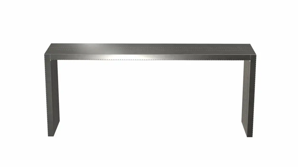 Alison Spear designed this elegant and minimal table for Stephanie Odegard during their trip together to Rajasthan, India. The craftsmen create patterns using different types of hammerings in the metal sheets clad over teak-wood structure.Crafted with utmost care and attention to detail, these Rectangular Console Tables are made to order and are available in twelve metal clad finishes, ensuring that you can choose the perfect one to match your individual style and taste. The use of high-quality materials and expert craftsmanship ensure that each Art Deco Rectangular Console Table is not only beautiful but also a true piece of art.The Straight legs and side arms of this Art Deco Rectangular Console Table are hand carved from solid pieces of teak. Pattern makers trace and cut complex forms that will cover the chair in a skin of copper, white bronze, brass or antiqued white bronze The metal finishes will tarnish over time. Regular non-abrasive household metal polishes can be used to restore the original luster.Overall, if you're looking for a piece of furniture that combines luxury, comfort, and style, then the Art Deco Rectangular Console Table is an excellent choice. With its distinctive curved profile and multiple finish options, this Chair set is sure to elevate the look of any room it is placed in, and be a beloved addition to your home for years to come.The images shown in this listing are shot in different lighting conditions and/or are 3D illustrations. We encourage our customers to please request a sample or a full sample set of 12 finishes so that they can experience the finish first hand. Art Deco Industrial and Work Tables Rectangular Console in Smooth White Bronze by Alison SpearSize- 72"x 16"x 30"HMaterials - White Bronze, Metal sheet, Teak, Wood, MetalTechniques: Hand-Crafted, Hand-Carved, Metal Work, Wood Work, Metal Wrapping, PolishedPlease note that moisture in air, sudden change in temperature and natural movement of wood over time causes the metal to wrinkle or bubble up. We use well seasoned, reclaimed teak and high quality marine grade MDF (wherever technically possible) to avoid and delay the mentioned changes. However a perfect stability of metal cannot be guaranteed. Please note that our smooth finish metal clad pieces will have some unavoidable tool marks. This is proof that everything is done by hand. The smooth finish will not come out like a machine made perfect surface and the master artisan will do their best to make it look as good/clean/stable/perfect as he possibly can.The antique white bronze finish is hand done by using an acidic chemical over the white bronze finish to recreate a natural patination. Like with the natural patination of silver, copper, or brass, the final result and color uniformity of the patina cannot be guaranteed. The goal of this finish is to achieve rainbow-like shades with dull, shiny, cloudy, and streaky patches to give an illusion of antiquing. Please note:None of our metal clad pieces are treated with a protective “finish” thus enabling the items to age naturally over time. We will of course polish them well before we pack them. a) Copper oxidizes faster than the other metals. In six to twelve months it will most likely lose its shine and will gradually turn to different shades of brown and/or green/blue. This aging process and its effect is referred to as verdigris. After a year the piece should not change much more. Copper does not rust, but does require periodic cleaning in order to retain its original shine if that the preferred option. ('BRASSO' or any known copper polish can be used to polish copper).b) Brass retains its shine for far longer than others, but will tarnish if not cleaned on occasion. ('BRASSO' is made to polish brass).c) White bronze, has the least tendency to show age or tarnish. If kept in a controlled climate, this metal will hold its shine for years. It can be cleaned with a cleanser and polished with a cloth. d) The antiqued white bronze finish will react with the natural elements the fastest in the beginning but it too will stop reacting and will settle down in a stable state like copper after 6-12 months. Since it is already antiqued and looked like it is tarnished, as described in an earlier message, this fast reaction will not change the over all look. In that way this surface is most forgiving. The images shown in this listing are shot in different lighting conditions and/or are 3D illustrations. We encourage our customers to please request a sample or a full sample set of 12 finishes so that they can experience the finish first hand.