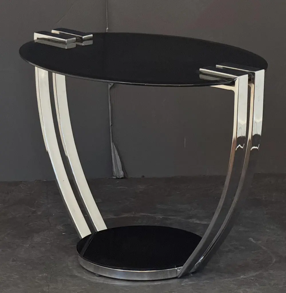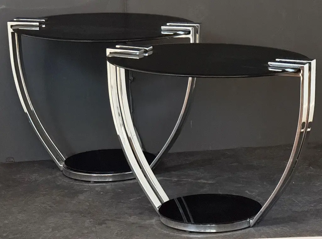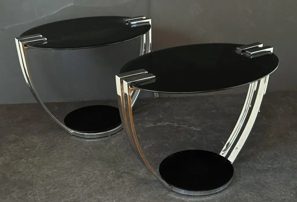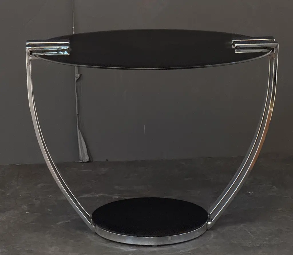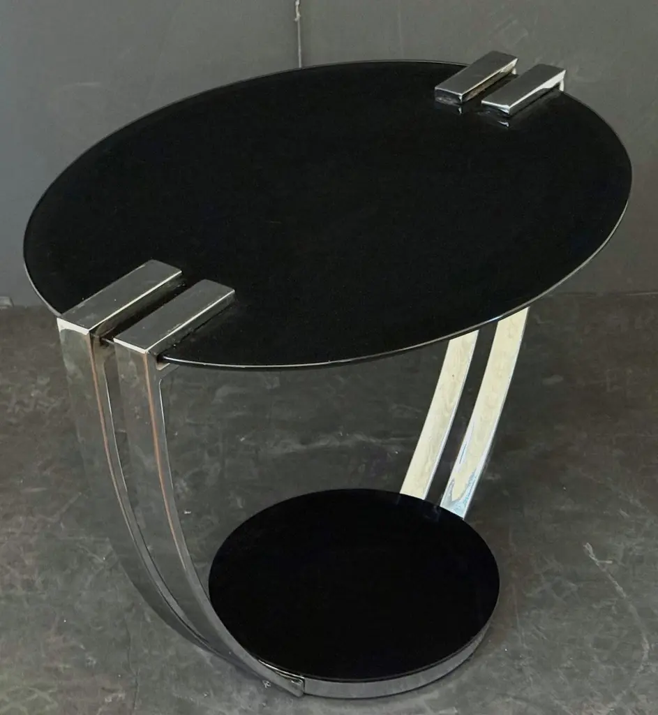 A pair of Art Deco coffee table or low stands (end tables or side tables) - each table featuring an elegant chromed steel frame and oval black glass top with black acrylic under-tier, from an original design by the celebrated Austrian artist, Josef Hoffmann, first produced between the end of the 1920s and the first years of the 1930s.Two Available - Individually Priced - $3895 Each TableJosef Hoffmann (1870 - 1956) was an Austrian artist and designer who co-founded the Wiener Werkstätte. He studied at the Higher State Crafts School in Brno, and then worked with the local military planning authority in Germany. He also studied at the Academy of Fine Arts of Wien with Karl Freiherr von Hasenauer and Otto Wagner, graduating with a Prix de Rome in 1895.