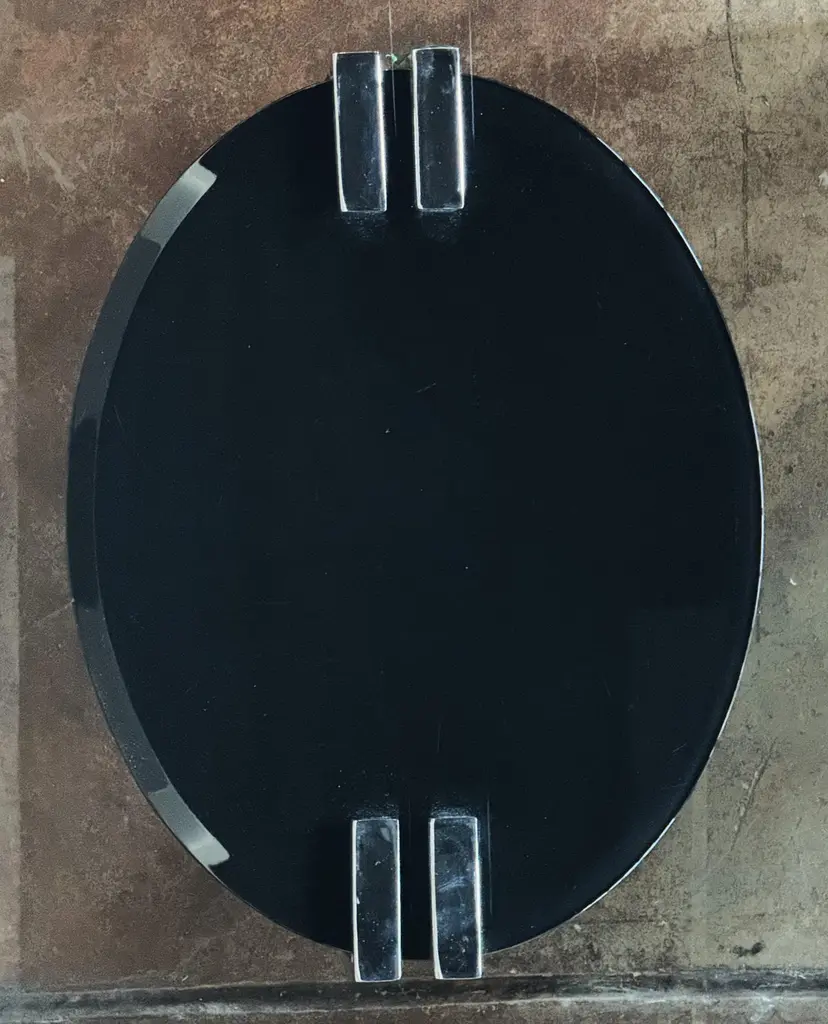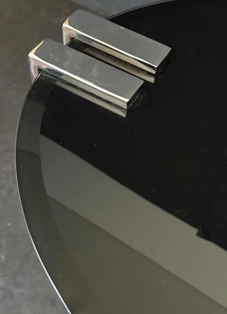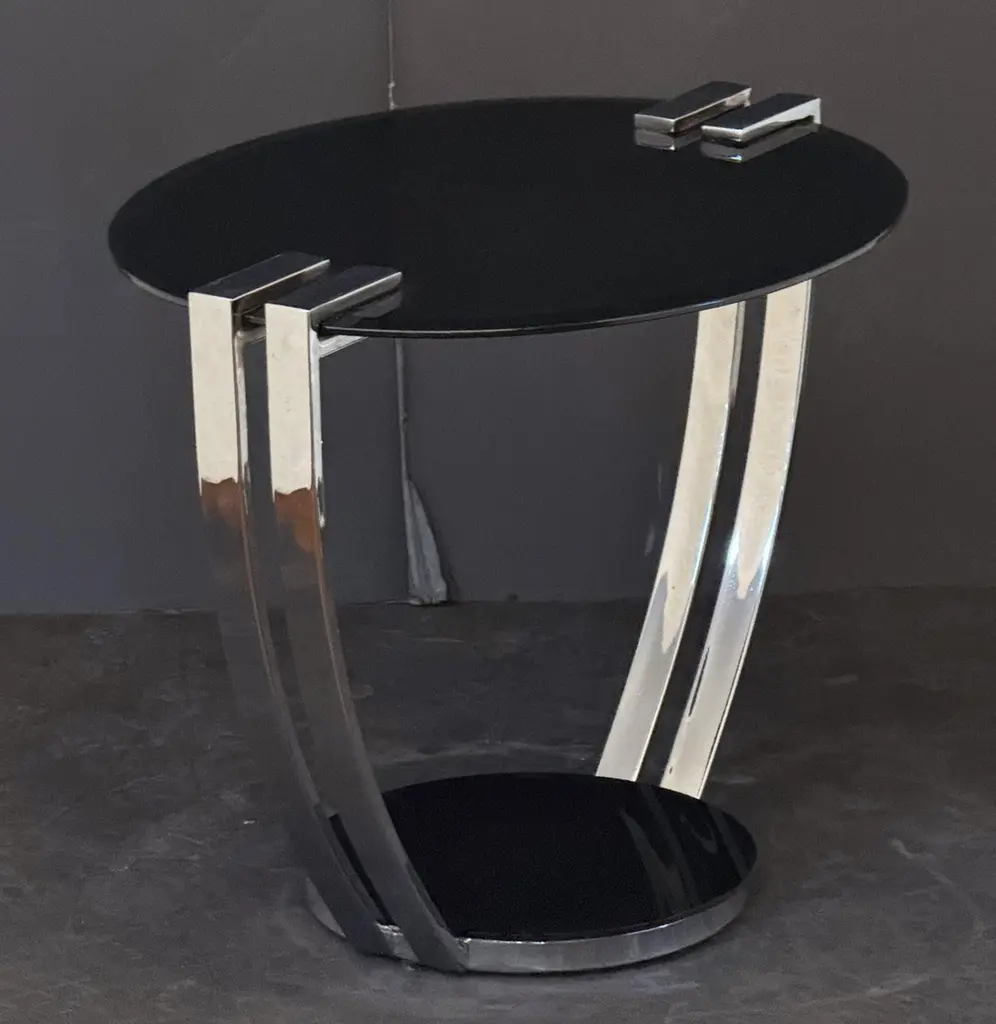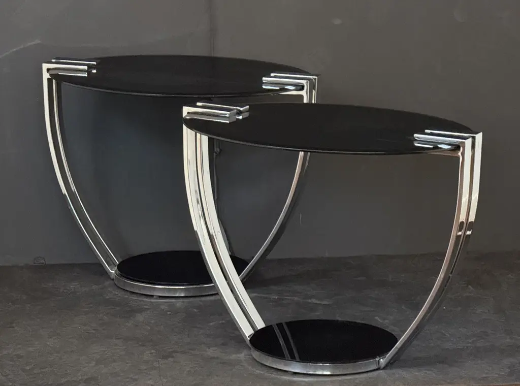 A pair of Art Deco coffee table or low stands (end tables or side tables) - each table featuring an elegant chromed steel frame and oval black glass top with black acrylic under-tier, from an original design by the celebrated Austrian artist, Josef Hoffmann, first produced between the end of the 1920s and the first years of the 1930s.Two Available - Individually Priced - $3895 Each TableJosef Hoffmann (1870 - 1956) was an Austrian artist and designer who co-founded the Wiener Werkstätte. He studied at the Higher State Crafts School in Brno, and then worked with the local military planning authority in Germany. He also studied at the Academy of Fine Arts of Wien with Karl Freiherr von Hasenauer and Otto Wagner, graduating with a Prix de Rome in 1895.