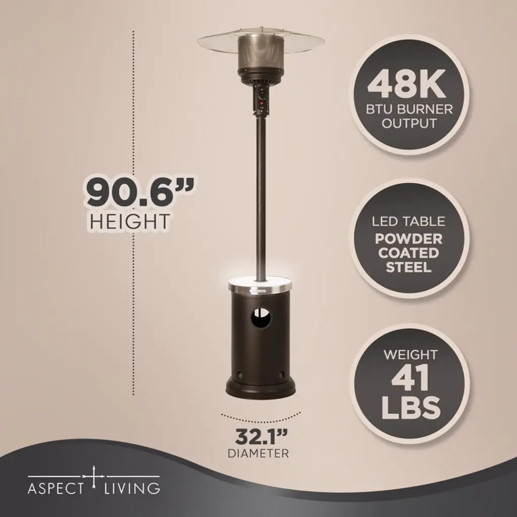 Aspect Living Patio Heater With Led Table 48,000 Btu Output Electronic Ignition System, With Wheel, Portable Outdoor Propane Patio Heater Mocha Finish