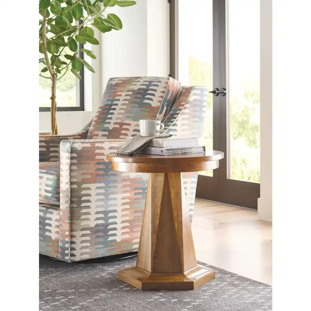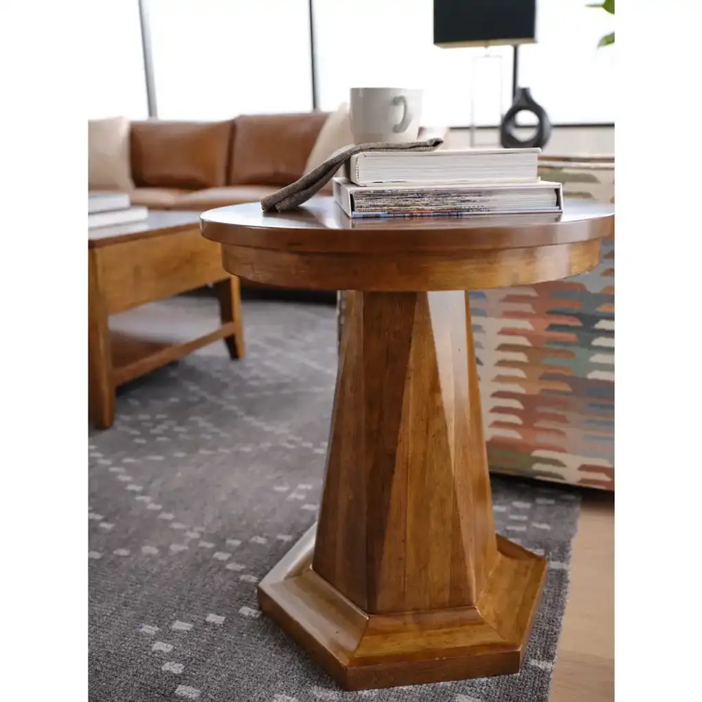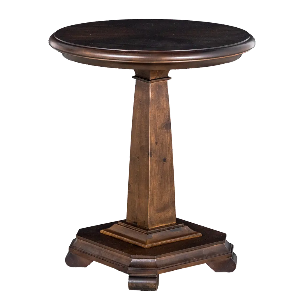 The Array Round Chairside Table from the Aspire Collection embodies refined craftsmanship in solid cherry wood. Named for its distinctive profiled posts that showcase the wood's natural beauty, this elegant accent piece brings sophisticated functionality to any living space. The table's graceful round design houses a full-depth drawer, masterfully framed by the collection's signature architectural details. Solid wood end-panels and custom inset hardware complete the look with understated elegance, while genuine solid wood construction ensures lasting durability. This transitional masterpiece proves that timeless design can be both beautiful and practical, offering the perfect perch beside your favorite chair.