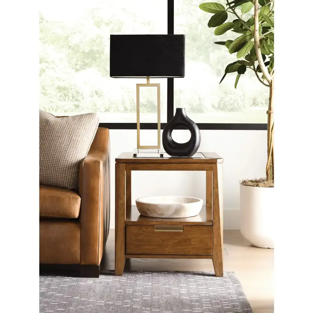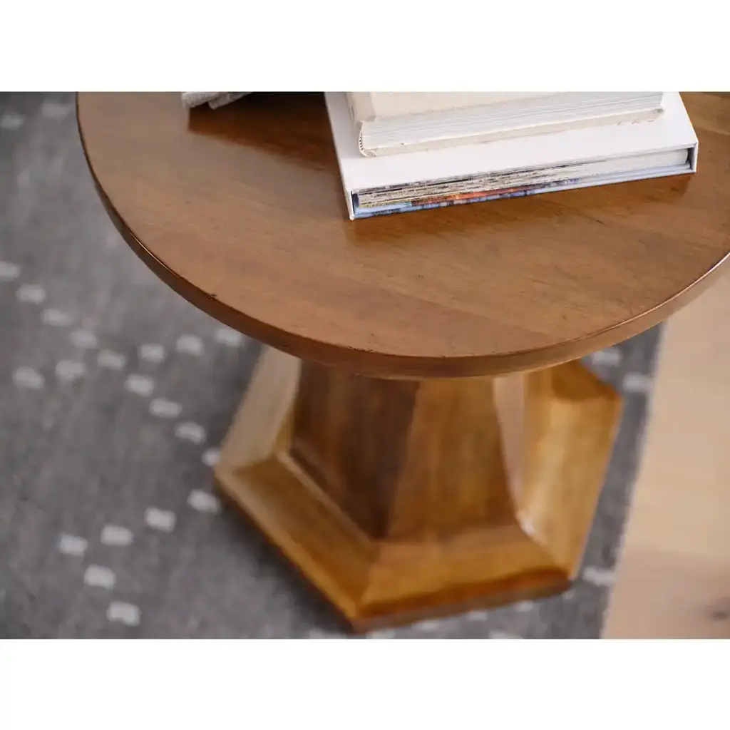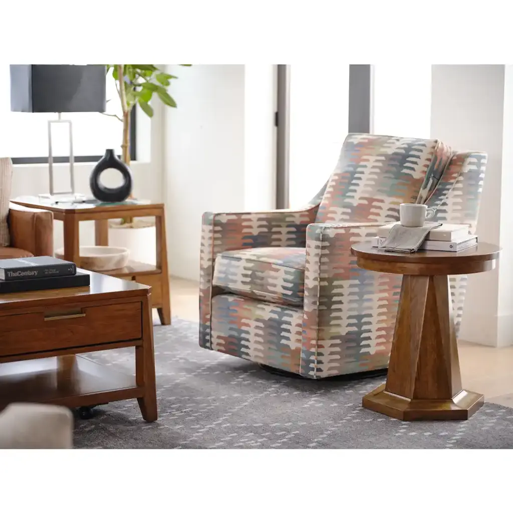 The Array Round Chairside Table from the Aspire Collection embodies refined craftsmanship in solid cherry wood. Named for its distinctive profiled posts that showcase the wood's natural beauty, this elegant accent piece brings sophisticated functionality to any living space. The table's graceful round design houses a full-depth drawer, masterfully framed by the collection's signature architectural details. Solid wood end-panels and custom inset hardware complete the look with understated elegance, while genuine solid wood construction ensures lasting durability. This transitional masterpiece proves that timeless design can be both beautiful and practical, offering the perfect perch beside your favorite chair.