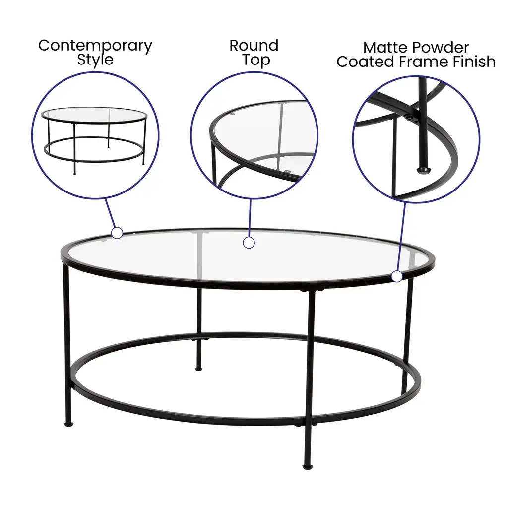 Astoria Collection Round Coffee Table - Modern Glass Coffee Table With Metal Frame