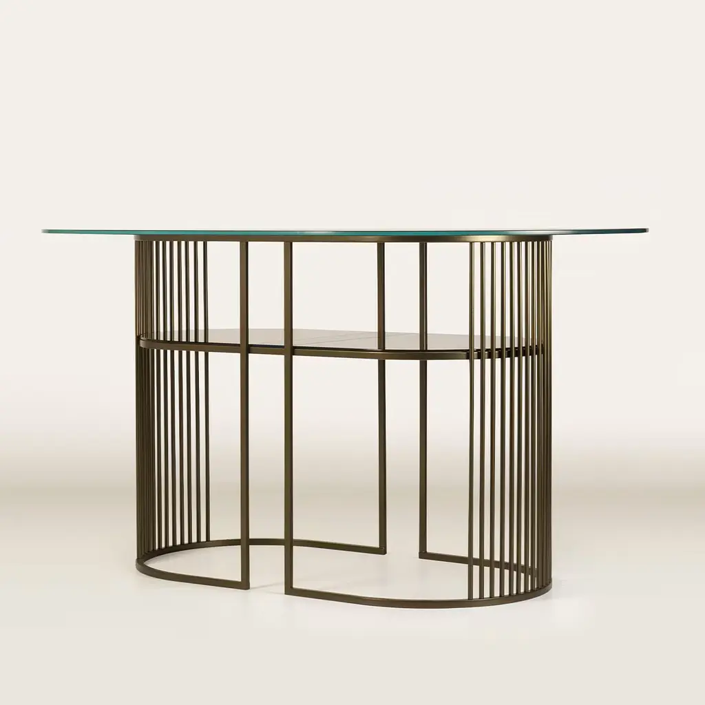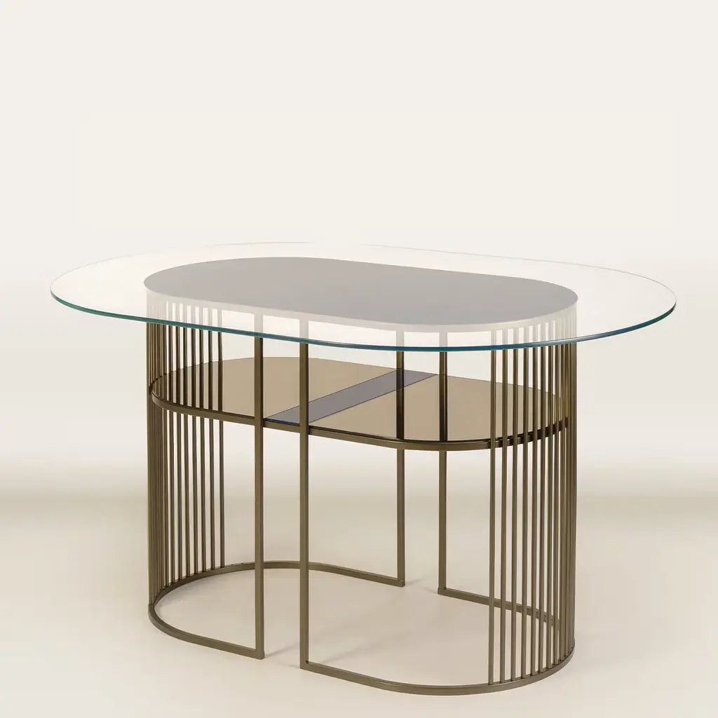 A testament to traditional craftsmanship, this oval table will make for a stately and elegant accent to both private and public interiors of refined inspiration. Part of the Back to Bronze Collection, it is handmade of steel finished with bronze powder paint, and features a glass shelf and top, both made of back-lacquered tempered glass. Please consult the Concierge for further details.