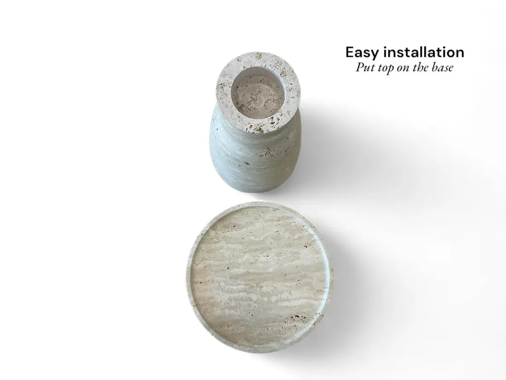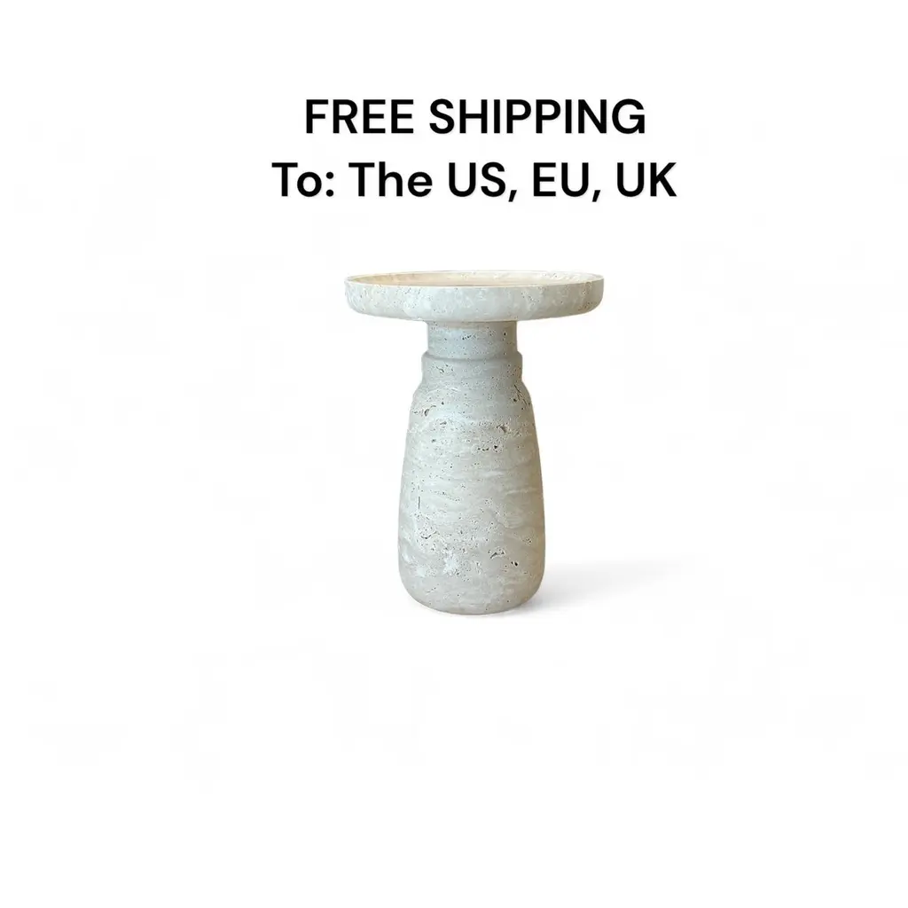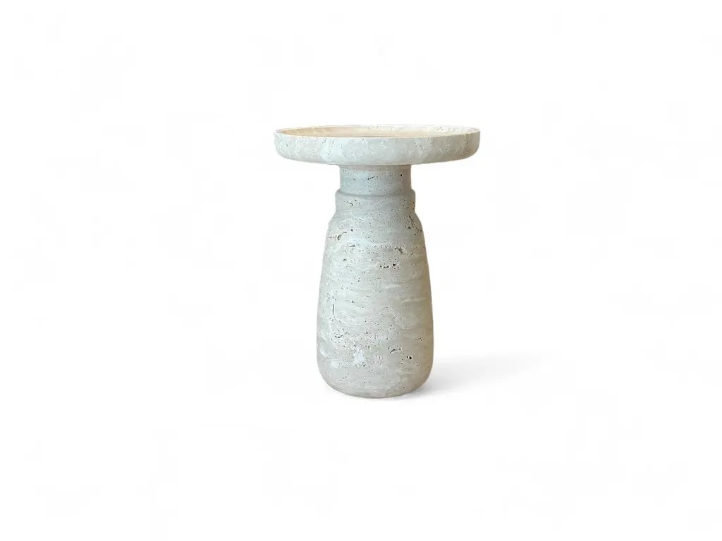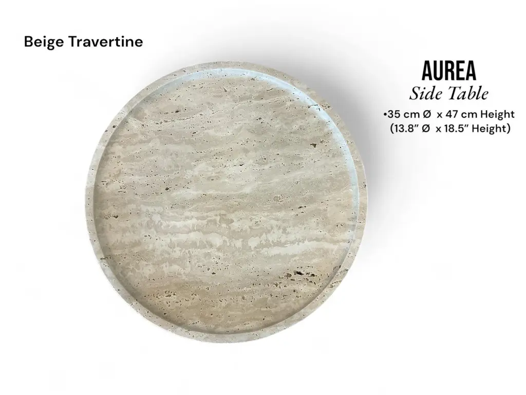 ‘Aurea’ Side Table by HAAND, crafted from premium beige travertine stone. This exquisite piece measures 13.8 inches in diameter and 18.5 inches in height, with a substantial weight of 80 lbs.The Aurea Side Table is a testament to superior design and craftsmanship, embodying HAAND’s commitment to quality. Its honed finish and exceptionally smooth surface give it a luxurious feel—like touching velvet.Its sleek, modern silhouette and natural stone finish make it a versatile addition to any living space. While it functions beautifully as a side table, its versatility extends beyond this. Use it as:1.A Statement Piece: Place it in your living room to hold decorative items like vases, sculptures, or candles, enhancing your room’s aesthetic.2.A Nightstand: Its sturdy design makes it perfect for a bedroom nightstand, providing ample space for a lamp, books, and a glass of water.3.An Accent Table: Ideal for your office or hallway, where it can display art pieces, houseplants, or serve as a convenient spot for your keys and mail.4.A Plant Stand: Elevate your indoor garden by using it as a stylish plant stand, showcasing your favorite plants in a unique way.5.A Patio Table: Its robust construction allows it to be used outdoors, making it a great option for a patio or balcony table, perfect for holding drinks and snacks during gatherings.With its enduring elegance, velvet-like touch, and robust construction, the Aurea Side Table promises to be a timeless addition to your home decor, seamlessly blending function and style.For custom size requests, please send us a message.