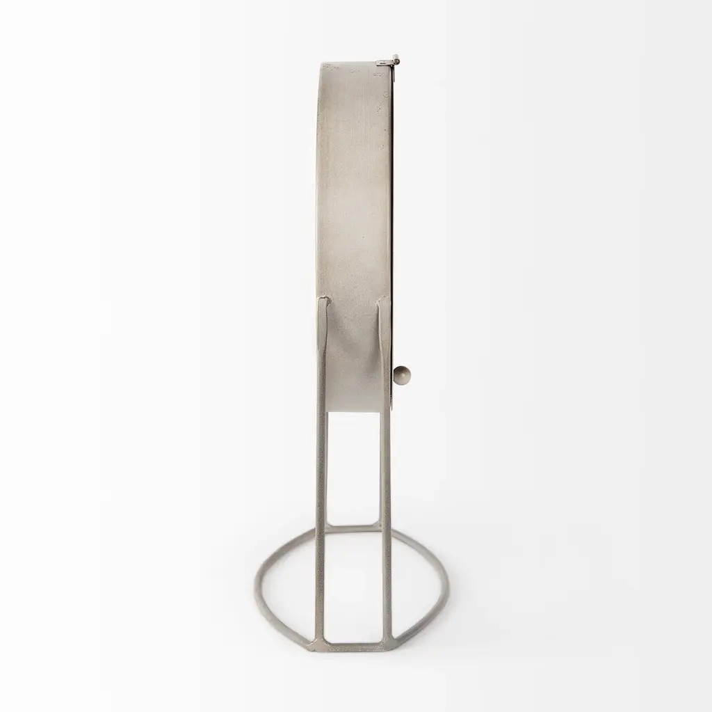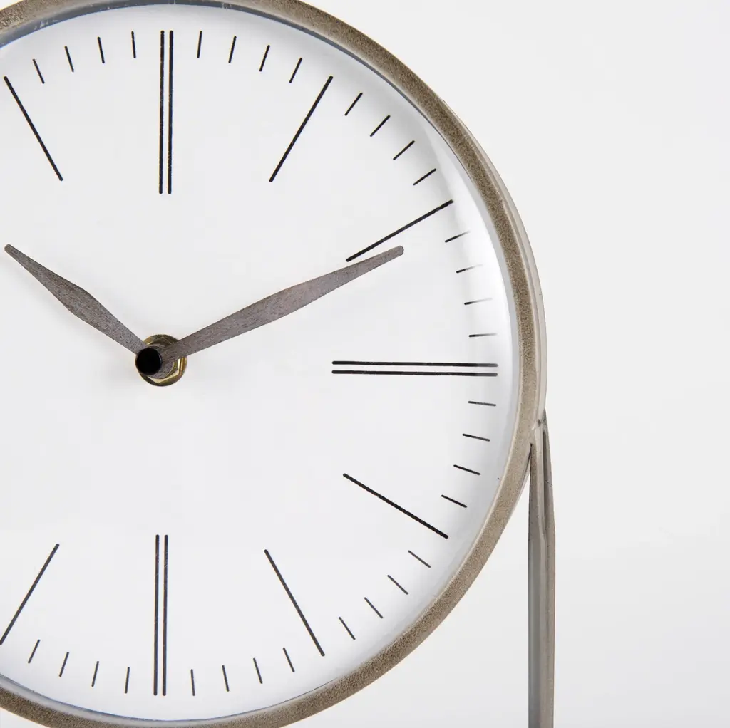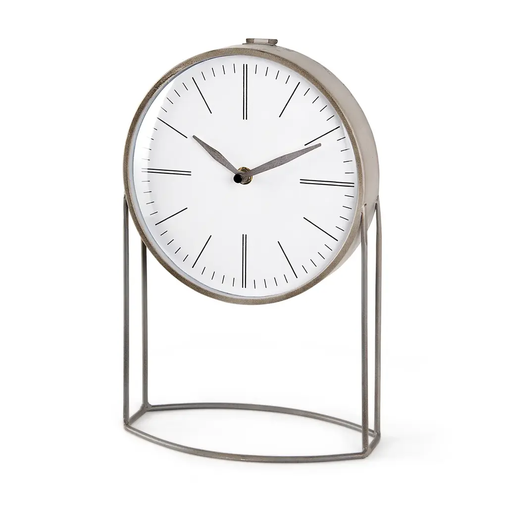 Tastefully designed, the Aurus matte-grey metal clock is a stylish accent with a minimalistic face and clean markings, equipped with a quartz movement for accurate timekeeping. The table clock requires a single AA battery for operation.