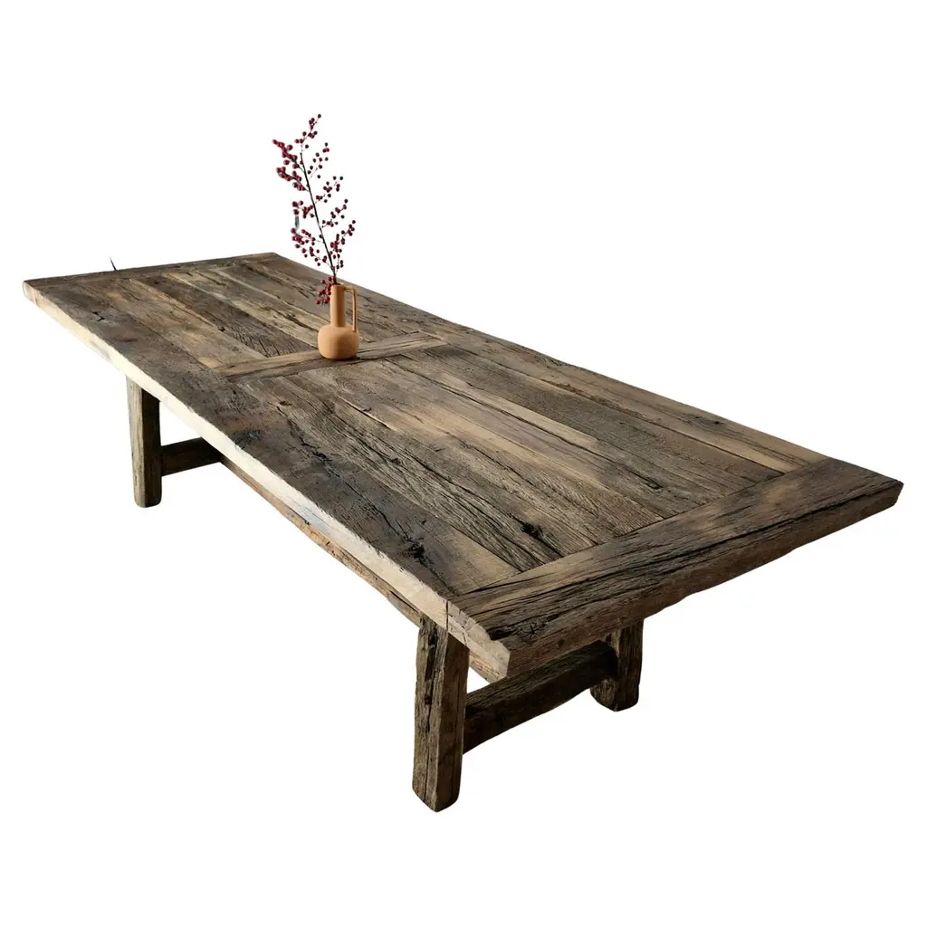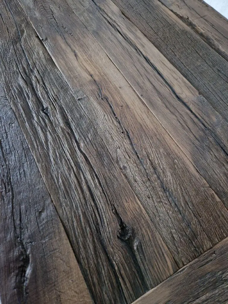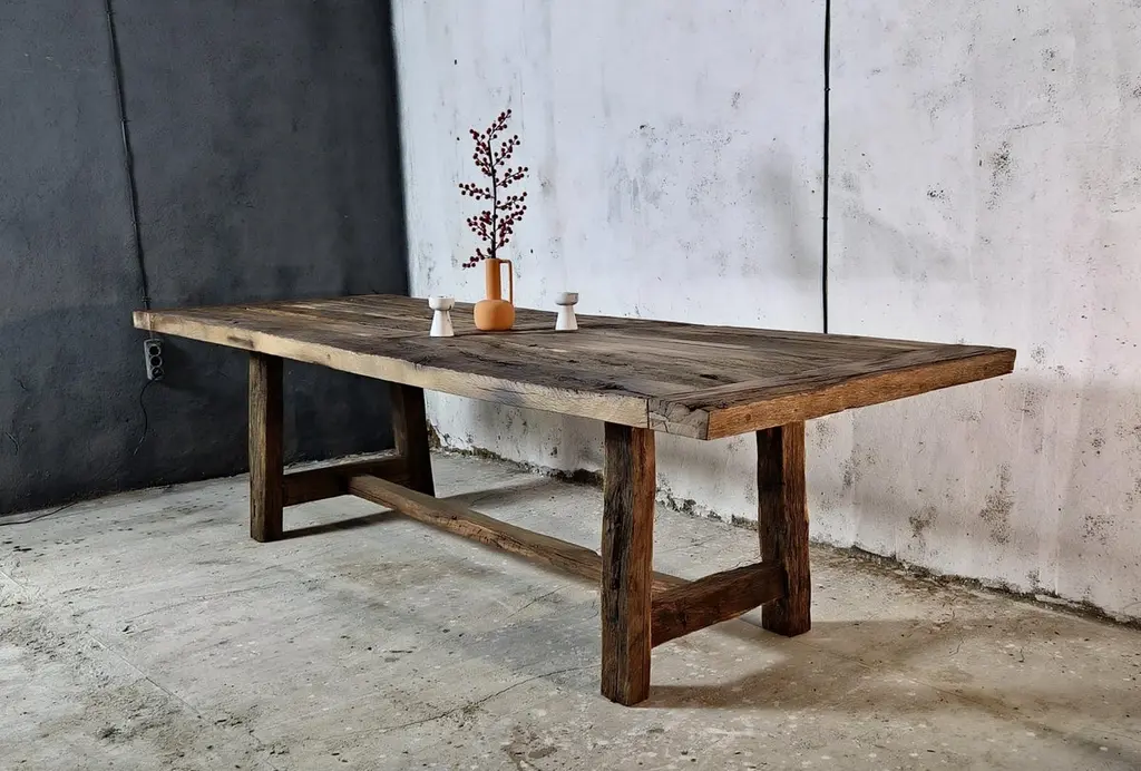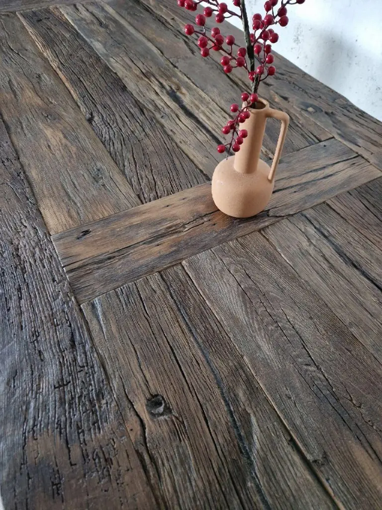 Country Antique Table Made from Rare Barn Oak Boards by Sergio Vulpe!! If you need a 3D model, just let us know !!A Table That Carries Time ItselfCrafted from authentic 19th-century barn oak, this reclaimed country table is more than just a piece of furniture — it’s a preserved fragment of rural history. Every board bears the quiet marks of age: sun-cracks, nail holes, and grain shaped by decades of wind, weather, and work.Hand-built using traditional joinery, it respects the original soul of the wood while offering clean, timeless proportions that suit both rustic and contemporary interiors.There’s no imitation here — just true reclaimed oak, shaped with intention, strength, and restraint. It doesn’t try to be perfect. That’s what makes it powerful. The actual product may slightly differ from the one shown in the photos.