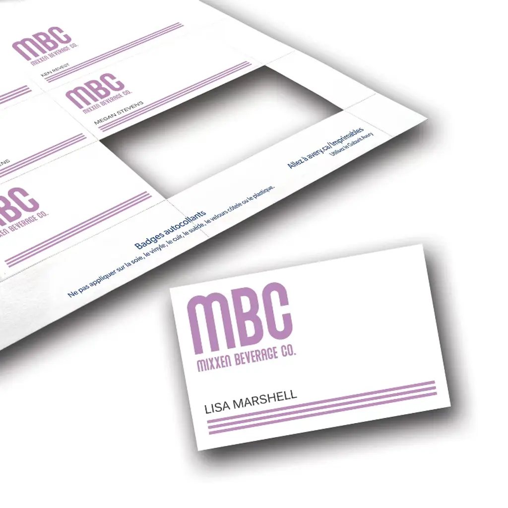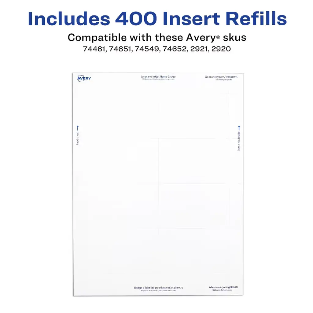Quickly and easily create professional name tags from the convenience of your home or workplace with Avery 5390 name badge inserts. This refill pack of 400 blank name tag inserts is perfect for creating personalized name badges for company meetings, conferences, trade shows, and other professional gatherings, as well as class reunions, wedding showers, baby showers, and other social events. Importing names, job titles, and company logos is fast and easy with Avery Design & Print Online, our easy-to-use software with hundreds of available Avery templates and designs. The 8.5" x 11" insert sheets are optimized for both laser and inkjet printers and are micro-perforated for clean and easy separation. Make a great first impression at your next event with these customizable name tag inserts designed to fit Avery Badge Holders 74549, 74461, 74652, 74651, 74457, and other name badges up to 3” x 4”.