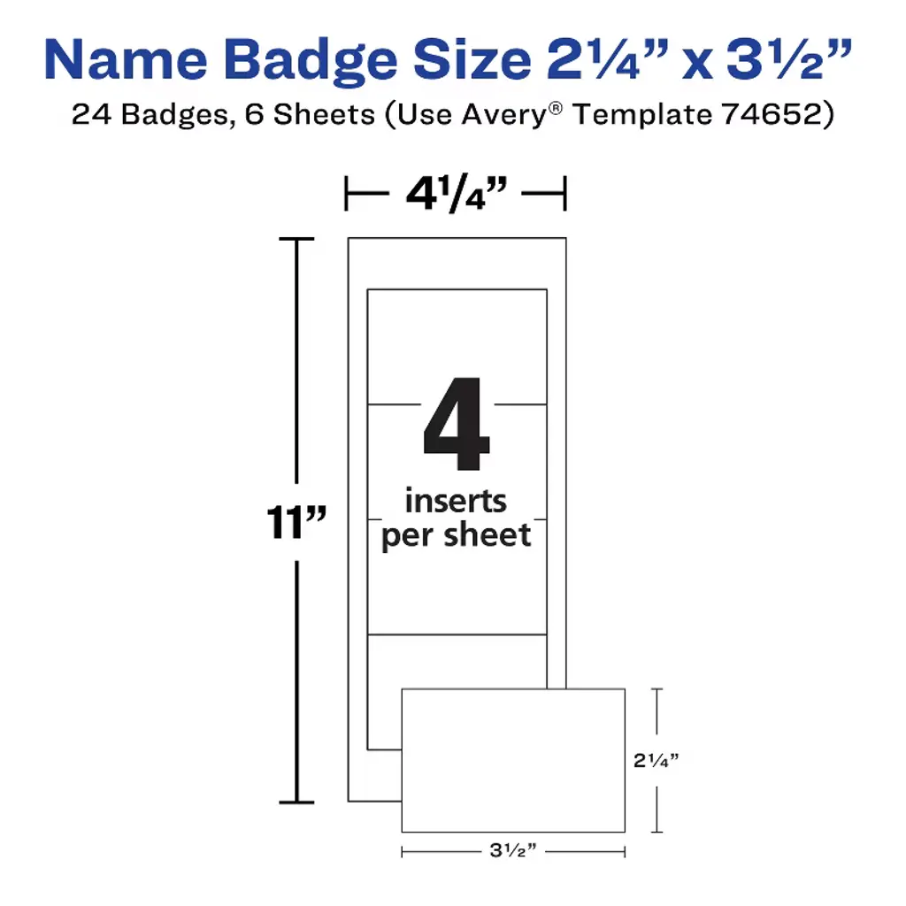 Create professional custom name tags quickly and easily with Avery 74652 name badges with pins. This 24-pack includes badge holders with no-snag pins that secure them in place, making them perfect for professional and social gatherings like meetings, trade shows, company mixers, reunions, meet-ups and more. The soft yet durable plastic name badge holders are reusable and feature a pocket-style design for easy loading and unloading. Effortlessly create custom name tags with company names, personal titles, logos, and more using templates and designs available at Avery Design & Print Online. Try it out on the Avery website and print with your laser or inkjet printer. The premium-quality white cardstock inserts feature ultra-fine perforations to eliminate rough edges for a high-quality, professional look. Ideal for permanent or temporary identification, these customizable name badges can be used as staff ID badges, business meeting badges, conference name tags, kids ID cards, and more.
