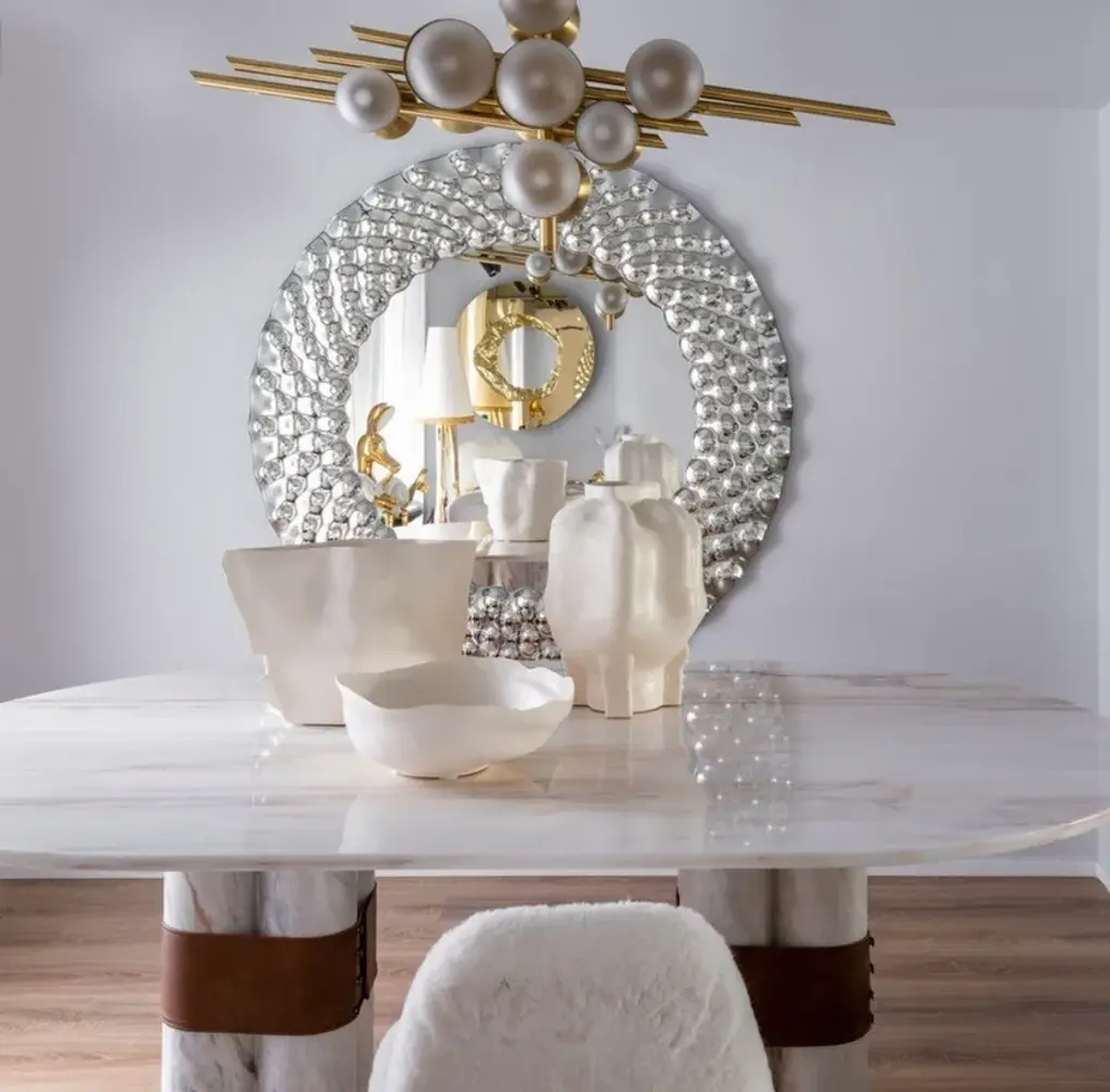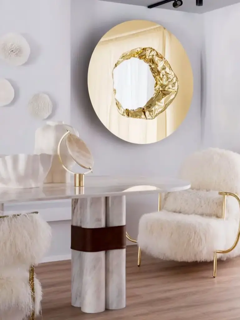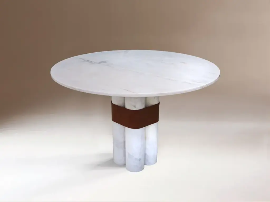Axis is an oval table made of Estremoz White Marble and Eco leather.Its base formed by a single thin block resembling round columns and its round top create an almost architectural balance. It also has a final and unexpected touch thanks to the handmade eco leather belt that embrace the structure.