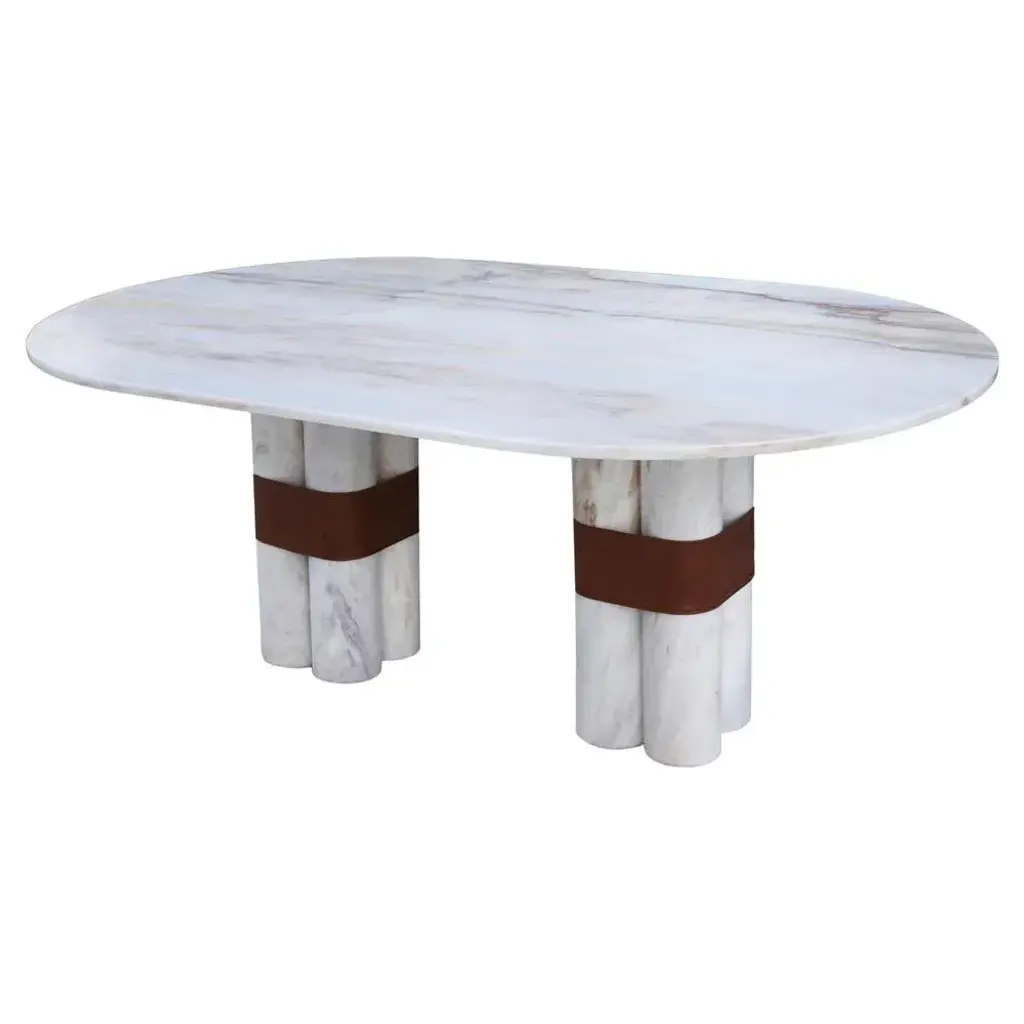 Axis oval table by Dovain Studio Dimensions: H 79 x Ø 200 cm. Materials: Estremoz white marble, eco leather. Dovain Studio Creative direction by Sergio Prieto, a Spanish artist-designer who was born in Talavera de la Reina in 1994. He dedicated himself to the world of painting professionally since he was 10 years old, and at 18 he began to study design. He has been working in different countries around the world, like China, Índia, France, Italy, Spain and Portugal, collecting experiences and knowledge that shaped his artistic vision from an early age. Now, he lives and works in Lisbon. One of his work’s priorities is the search for the expressive language of objects, creating emotions in those who see and feel his pieces. His artistic vision is printed on each piece of Dovain Studio bringing art, decoration and design, all together within the context of contemporary design culture.