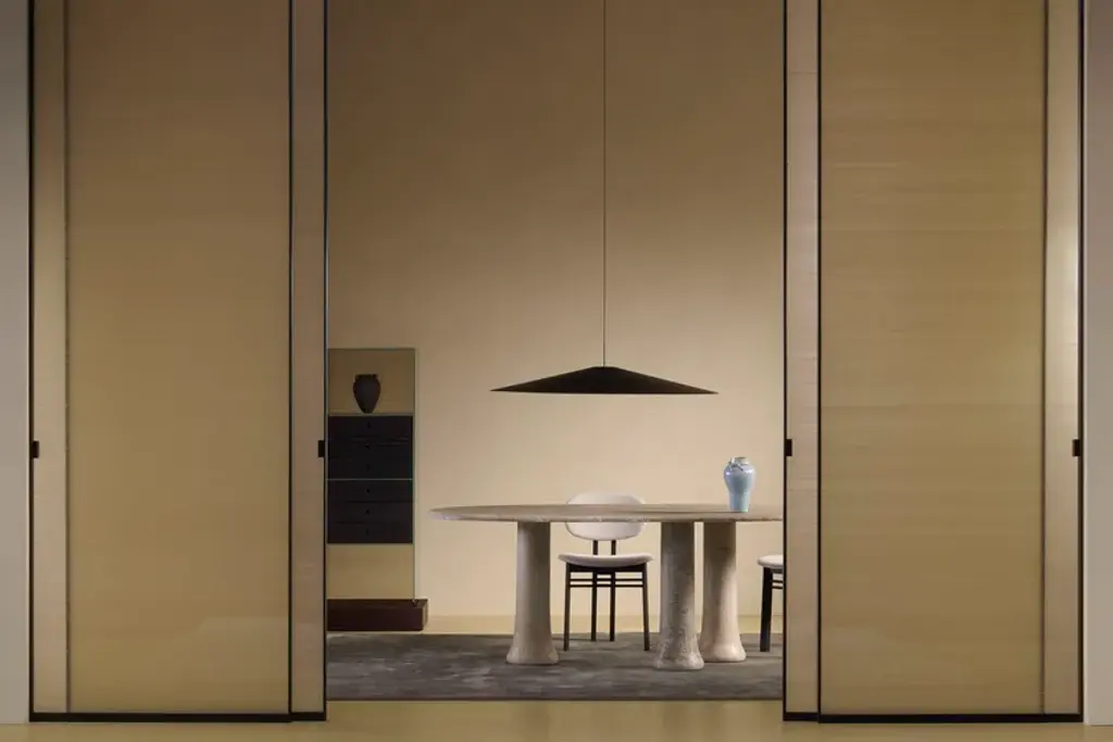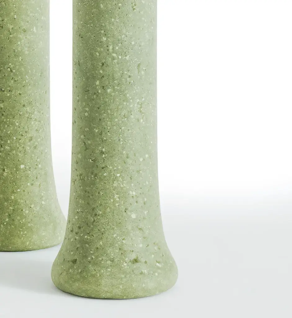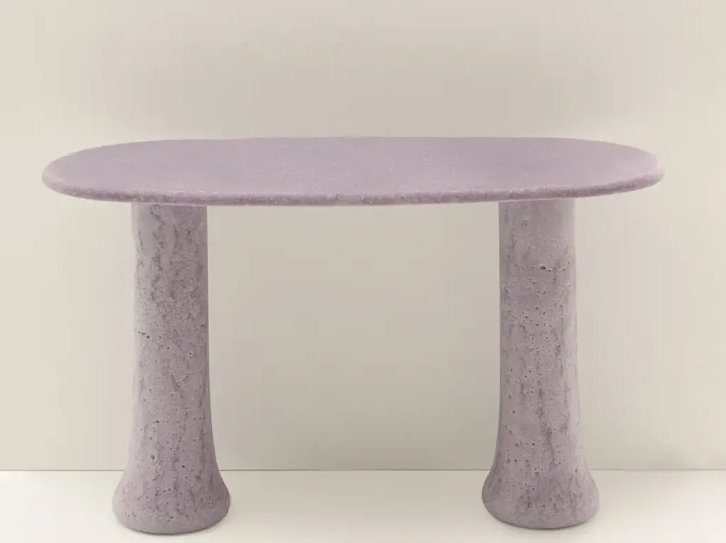 Babar is a table made of a special conglomerate of 100% recycled glass grit and glass shards.Series of round and oval high tables, low tables and console, made of a special 100% recycled glass grit, blended with polymers partly of plant origin and obtained from renewable sources. Each piece is hand-made and characterized by an irregular surface and geometry, featuring an organic and unique appearance. The legs are easily assembled and dismantled thanks to a practical system of metal plates. Available in five different colours, always slightly variable and not homogeneous: ice, jade, clay, honey and lavender.
