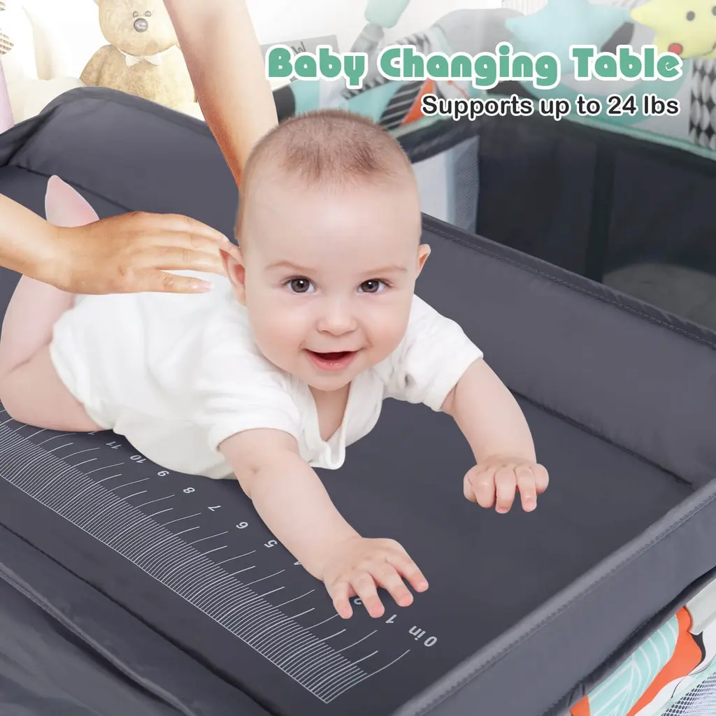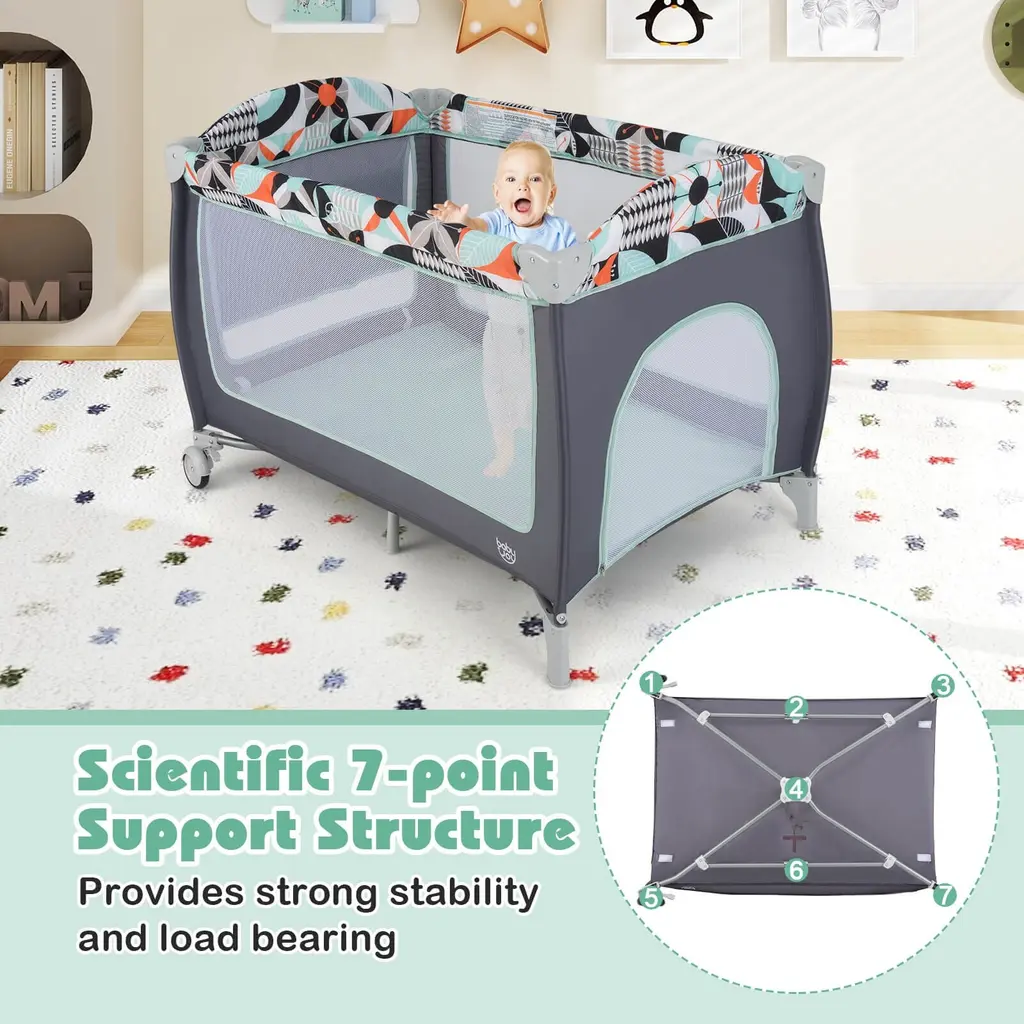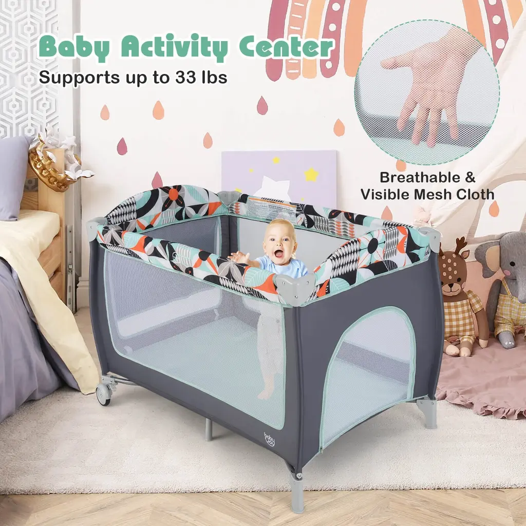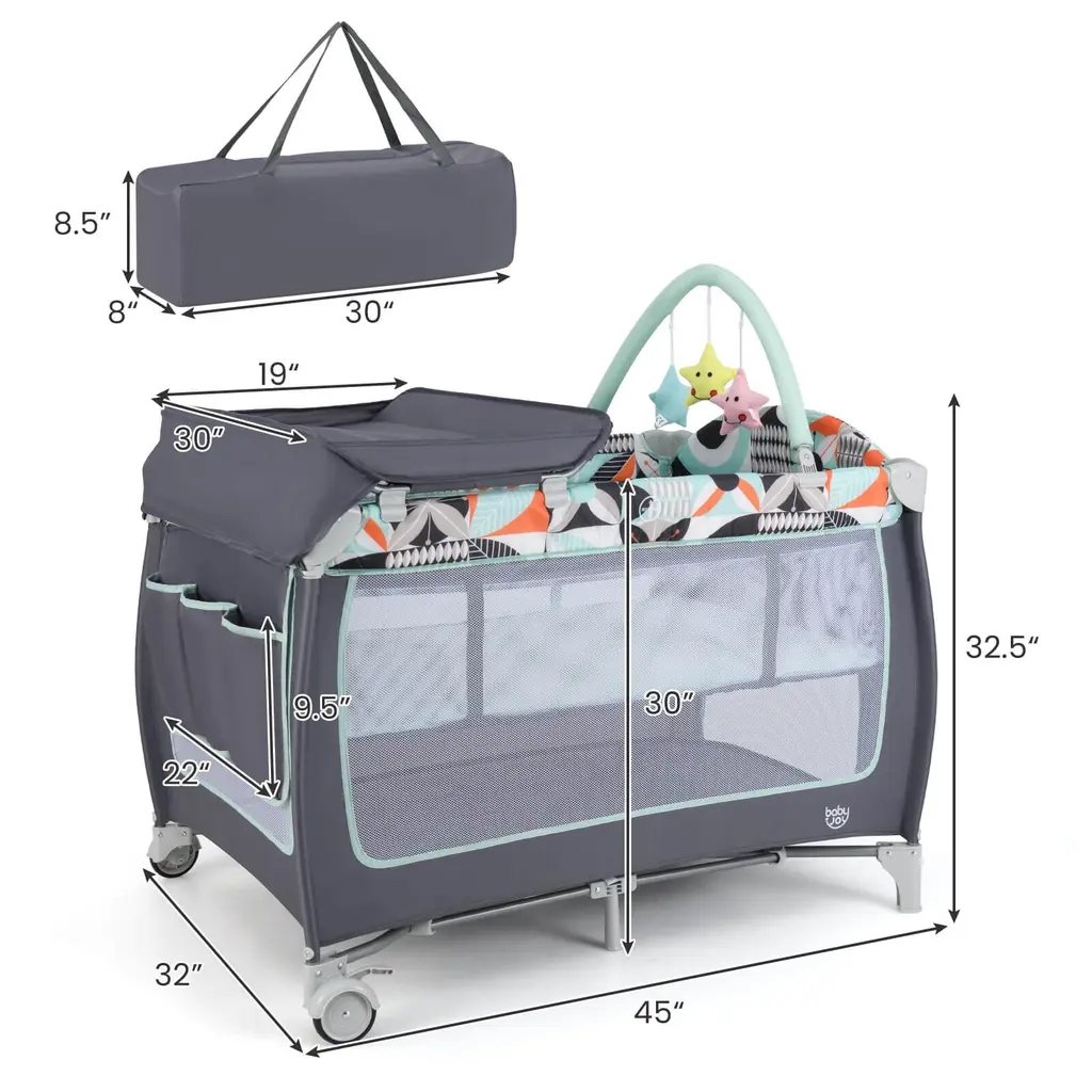 Our 3-in-1 baby playard is an ideal choice for newborns to sleep safely and have fun! Made of solid iron pipe frame and sturdy oxford cloth, this baby playard ensures great stability and long-lasting use. Combining a bassinet bed, diaper table and activity center, our baby playard can be used in various ways and can accompany the growth of your baby. The diaper table can help parents change diapers easily without bending over. And the soft mattress offers a comfortable space for babies to rest or sleep. The breathable mesh netting is high enough to keep the baby in place and ensures great visibility for parents to observe the baby at any time. The zippered side door offers baby easy access to the playpen. 3 cute toys can bring a lot of amusement to the baby while making them fall asleep quickly. There are 2 casters with brakes equipped for easy moving and relocation, and all corners are covered to protect babies. The folding design makes the playpen easy to store and carry.Feature0° inclined angle which is under 10 degrees makes it a qualified bassinet Multipurpose design includes baby playpen, changing table and bassinet No more bending over to change diaper or massage for babies Detachable and foldable design provides convenience in daily use Side door with a zipper offers baby easy access to the playpen Ventilated mesh walls with proper height ensure high safety 3 adorable star-shaped toys bring your baby great amusement The soft and thick mattress provides a comfortable sleeping space Large side storage bag to hold diapers, wipes and other baby stuff 7-point metal tube structure ensures great stability and load capacity 2 wheels with brakes increase safety and ensure easy movements A carrying bag is provided for easy storage and transportation Easy to assemble with detailed instructionsSpecificationColor: Pink/Grey/Strawberry Pink/Mint Green Material: Mesh, Oxford Cloth, Iron, Sponge Product Dimension: 43'' x 32'' x 32'' (L x W x H) Diaper Table Size: 28'' x 19'' (L x W) Weight Capacity of Basic Playpen: 33 lbs Weight Capacity of Diaper Table: 24 lbs Weight Capacity of Baby Bassinet: 22 lbs Net Weight: 23 lbs Applicable Age: 0-36 Months Package includes: 1 x Baby Playard 1 x Carrying Bag 1 x Instruction