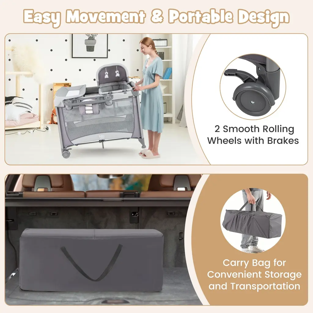 Our Costway unisex 5-in-1 portable baby playard is ideal to grow up with your baby! This baby playard comes with a changing table and a large storage basket, which provide great convenience for parents to change diapers or clothes for the baby. The waterproof & wear-resistant fabric is easy to wipe clean. The removable cradle with an adjustable canopy is perfect for the baby to have a sweet sleep while the hanging toys keep them entertained while awake. Besides, as your baby grows, it can transform into a playard after removing the mattress, cradle and diaper table. The 4-sided mesh netting with proper height provides good visibility and all-round protection. Plus, 2lockable wheels ensure smooth movement and added stability. The inclined angel is under 10 degrees, ensuring the safety of the baby.Thanks to the quick folding design, this baby pack and play can be set up in seconds for convenient use. Besides, you can take it anywhere with the included carry bag. Feature5-in-1 design meets various needs and makes parents' lives easier 7-point supporting structure and sturdy iron tubes ensure high sturdiness 4-sided mesh nettings ensure good ventilation and provide better visibility Waterproof and anti-wear fabric for easy maintenance& long lasting use The large storage basket is convenient to hold various baby products 2 adorable hanging toys to entertain your baby while awake 0° inclined angel is under 10 degrees, ensuring the safety of the baby The soft and removable mattress provides a cozy sleeping space Smooth round corners and safety belt for higher security 2 wheels with brakes ensure easy movement and stability Foldable design and carrying bag for easy storage and transportationSpecificationColor: Grey Material: Polyester Fabric, Sponge, Iron, PP Basic Baby Playard Size: 43.5'' x 31'' x 31'' (L x W x H) Diaper Table Size: 31.5'' x 20'' (L x W) Cradle Size: 30'' x 18'' x 21.5'' (L x W x H) Mattress Size: 40'' x 27'' (L x W) Folding Size: 31'' x 10'' x 10.5'' (L x W x H) Weight Capacity of Basic Playpen: 33 lbs Weight Capacity of Baby Bed: 22 lbs Weight Capacity of Changing Table: 22 lbs Weight Capacity of Cradle: 22 lbs Net Weight: 34.5 lbs Applicable Age: 0-36 Months (Baby Playard) 0-6 Months (Baby bed) Package Includes: 1 x Basic Baby Playard 1 x Diaper Changing Table 1 x Cradle with 2 Hanging Toys 1 x Mattress 1 x Storage Basket 1 x Carrying Bag 1 x Instruction