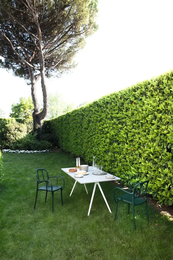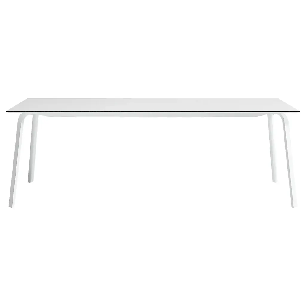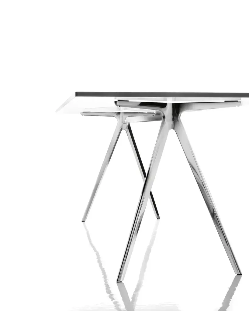 Table.Material: legs in die-cast aluminium polished or painted in polyester powder. Crosspiece in aluminium polished or painted in polyester powder. Top in transparent or mass coloured glass, in Italian ardesia slate, in quartzite or in MDF. Versions for outdoor use available.