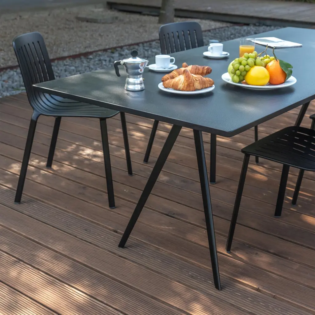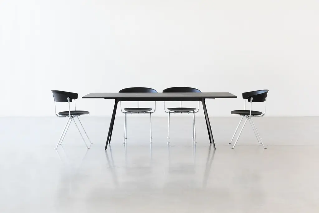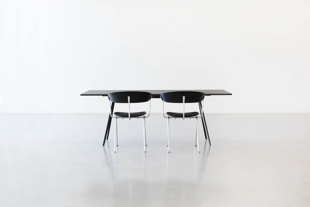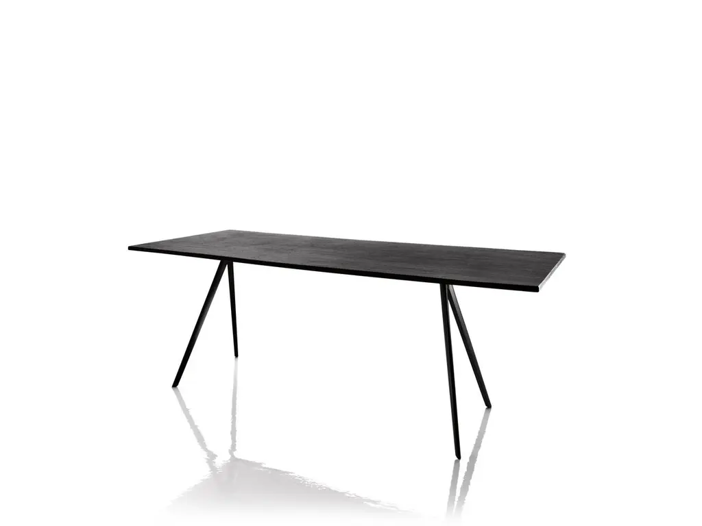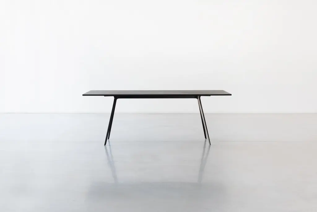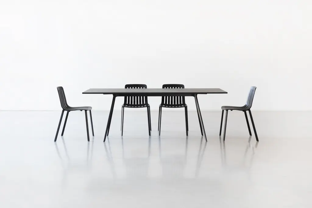 Baguette is a rectangular, large table in two parts. An opaque top rests on a highly resistant yet delicate aluminium base.We focused our attention on the structure of the project to use the less aluminium material as possible.The effect is visual as it brings an additional graphical feature to the table: the heavy top is only supported by four chopstick-looking feet.Material: legs in die-cast aluminium polished or painted in polyester powder. Crosspiece in aluminium polished or painted in polyester powder.Tops in tempered glass, in Italian ardesia slate, in MDF, in American walnut, in Carr- ara marble or in veneered Fenix with ABS edges (only for Baguette desk version). Versions for outdoor use also available.