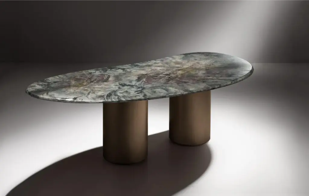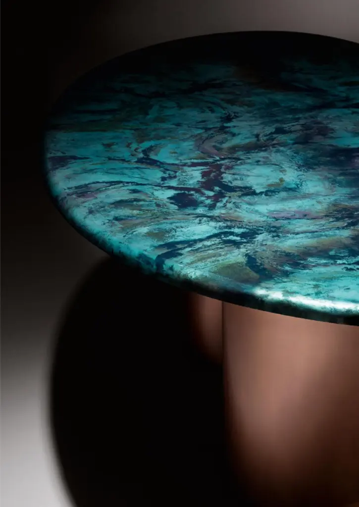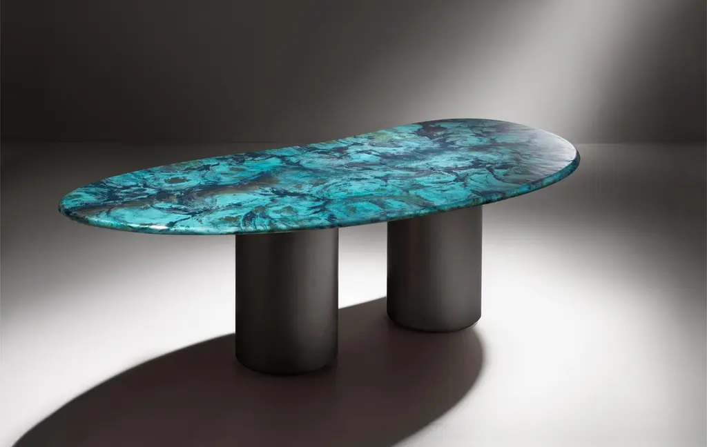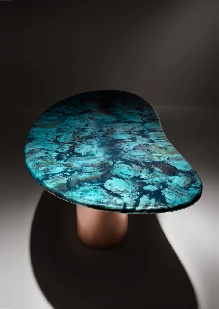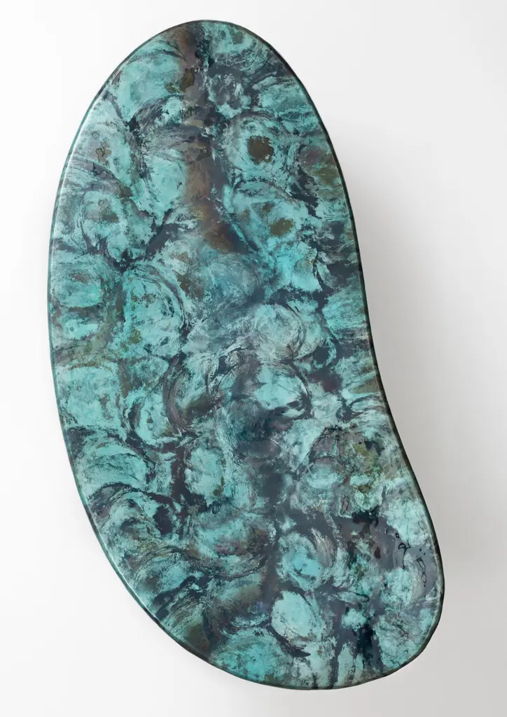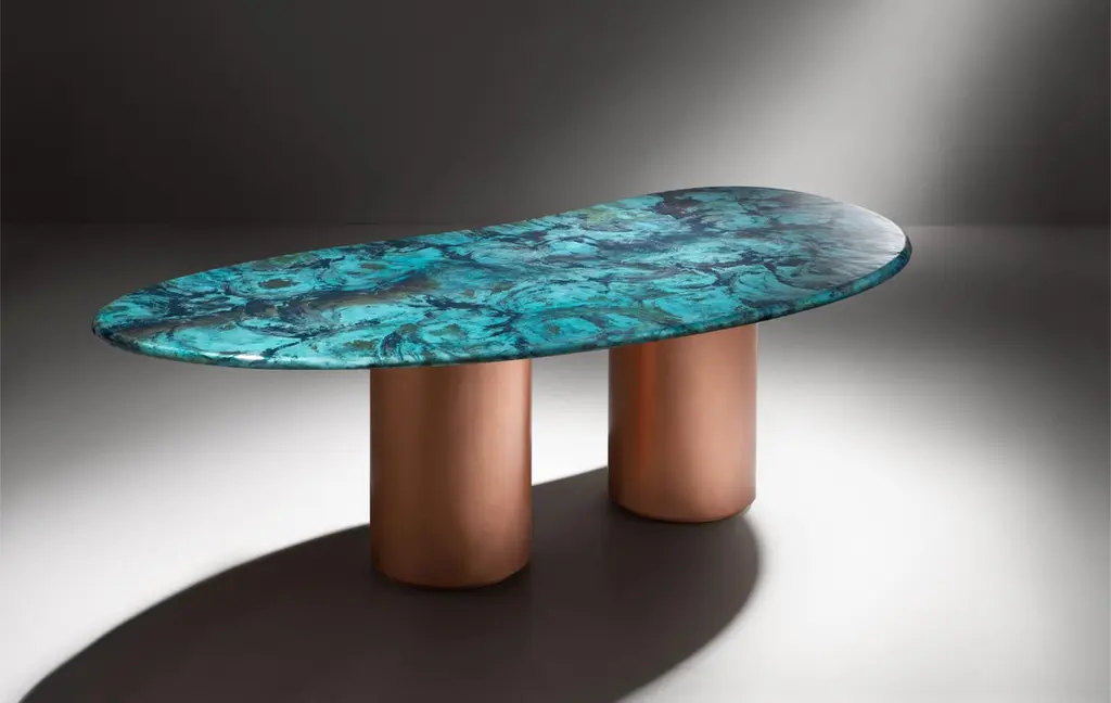 Baia Table by De CastelliDimensions: W 240 x D 120 x H 75 cmMaterials: Matt DeNuance Forest Copper, OtherOther versions of this piece are available. Please contact us for any request.Large table characterized by an organic shape, inspired by the landscapes of the Venetian lagoon sea: the infinite variations given by the waves and the currents come to life in the evocative declinations of the DeNuance lagoon finish, with its many shades of light blue and green. The base, formed by two cylindrical copper elements, supports the large top with the sinuous line. The result is a sculptural table, an iconic object that becomes the protagonist of the environment: Baia is almost a piece of art, the power and beauty of nature.DE CASTELLI“HARD COUTURE”Faithful to its decision to reinstate the special role of metal in design and experimentation, De Castelli infuses artisan ideas and workmanship into industrial processes, leading to entirely original results. The encounter with design inspires an approach to materials founded upon respect for their potential, be it hidden or obvious, which emerges slowly in a collection of pieces that, despite being part of a series, remain unique.Unique not only for the hand that has created them, but also for the singular cultural path that focuses on the aesthetic (and not just practical) value of the primordial material with which De Castelli shapes living spaces.A BESPOKE APPROACHEach object, even in the repetition of form, is a creative act in and of itself, one that incorporates a heritage of constantly-evolving expertise and research. The equation that relegates ‘cold’ metals to the margins of furnishing projects is thus overturned, bringing iron, brass and copper, in their infinite variations and finishes, to the centre of an entirely renewed stage, allowing them to finally shine with their own light.SUSTAINABILITYDe Castelli has always been committed to making the entire production cycle increasingly sustainable, aware that metal, the material with which its business identifies itself, is precious and must be treated with care, without waste.PEOPLE FIRSTThe wide spaces of the De Castelli headquarters in Crocetta del Montello (TV) allow those who work to enjoy environments where order, cleanliness and safety are always maintained and guaranteed. An attitude of attention and respect for people that has led to the shared ethical code.