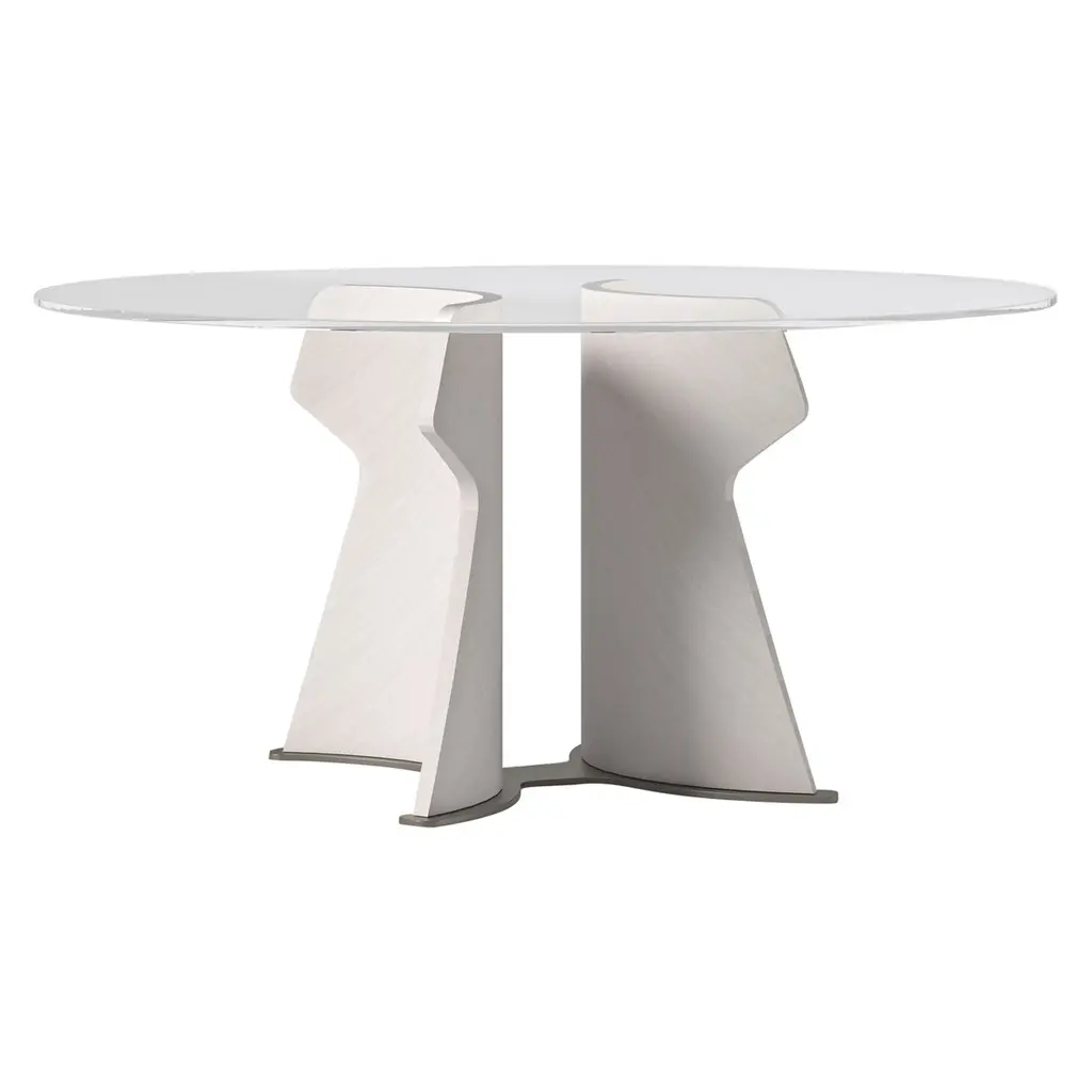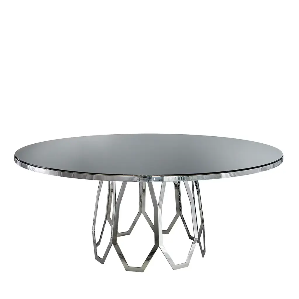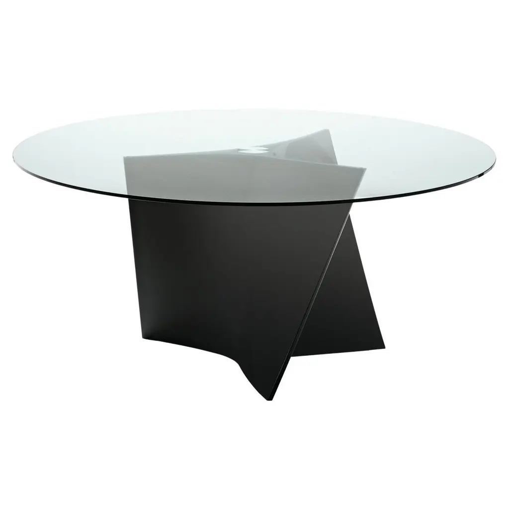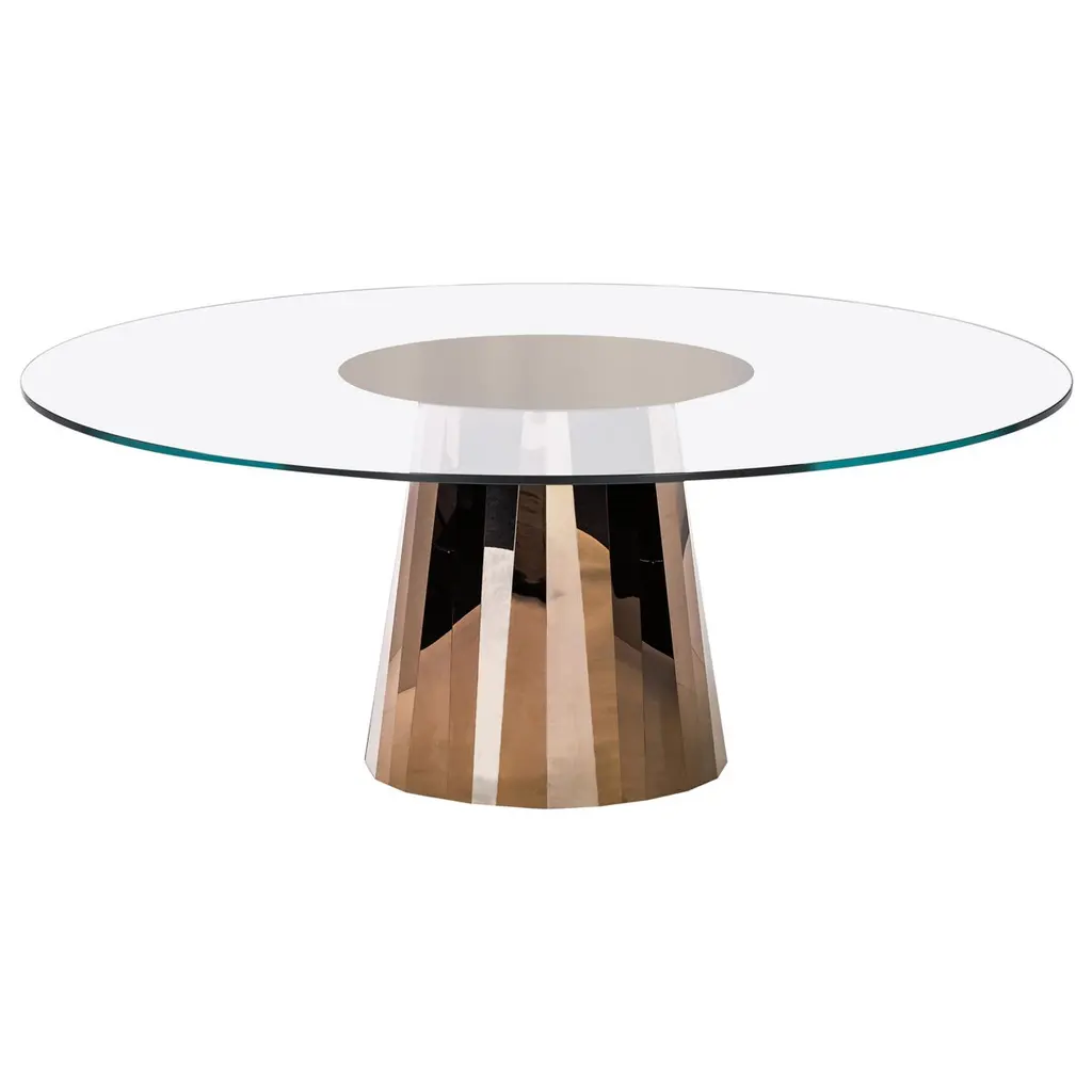 Bakkarat is a table that enhances crystal, both in its simplest and most complex forms. The extra clear glass tabletop creates an elegant contrast with the base formed by two sculptured crystal elements. These are made by cutting and then hand-bonding the glass.Size: 200 x 100 x h 75 cm220 x 100 x h 75 cm240 x 100 x h 75 cmØ110 x h 75 cmØ120 x h 75 cmØ130 x h 75 cmØ140 x h 75 cm