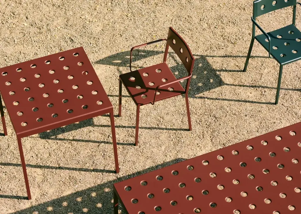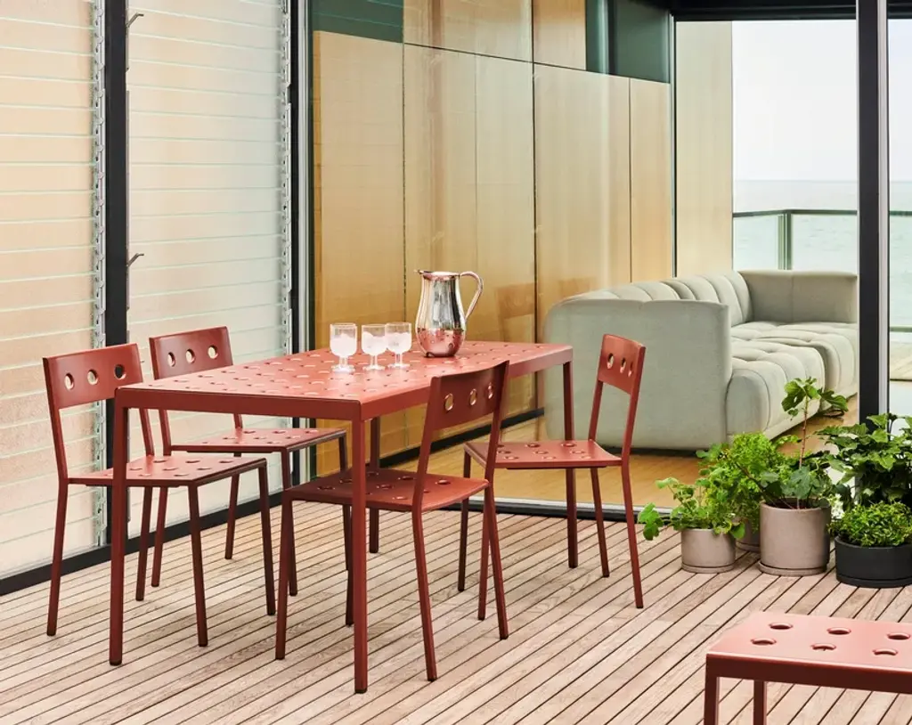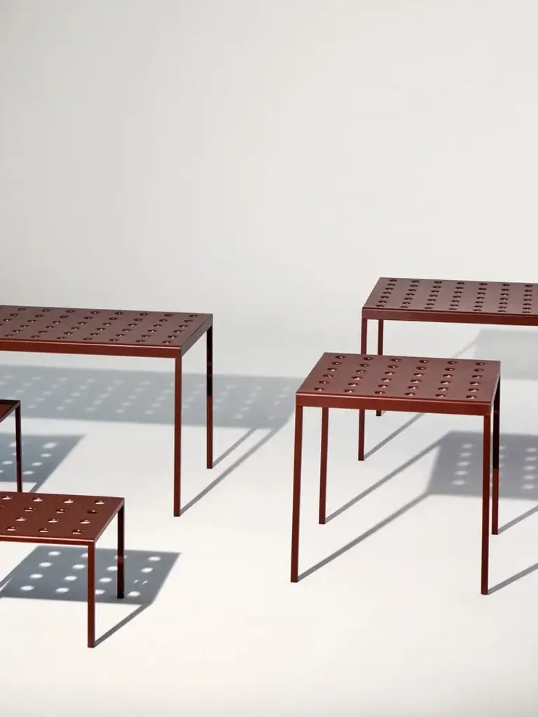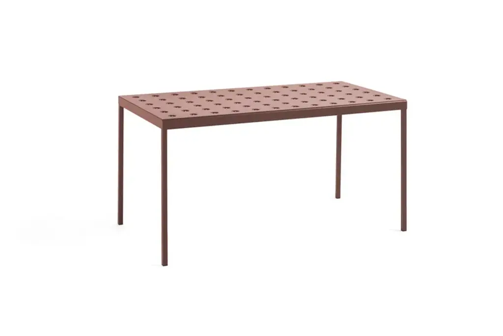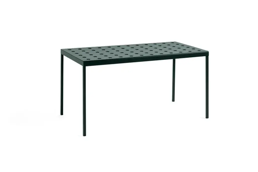Balcony, designed by Ronan & Erwan Bouroullec for HAY, is a rectangular table for the outside, with simple and square lines, characterized by holeson the surfaces that not only define the design but also reinforce the top. Balcony is suitable for all types of spaces, from small balconies and terraces to gardens and other larger outdoor areas.Made of powder coated steel with an outdoor primer for optimal strength and durability, Balcony is available in a number of different color options.Available in 5 finishes:- Anthracite power coated steel (RAL 9011)- Iron red powder coated steel (RAL 8015)- Desert green powder coated steel (RAL 140 50 05)- Dark forest powder coated steel (RAL 180 20 05)- Chalk beige powder coated steel (RAL 075 80 10