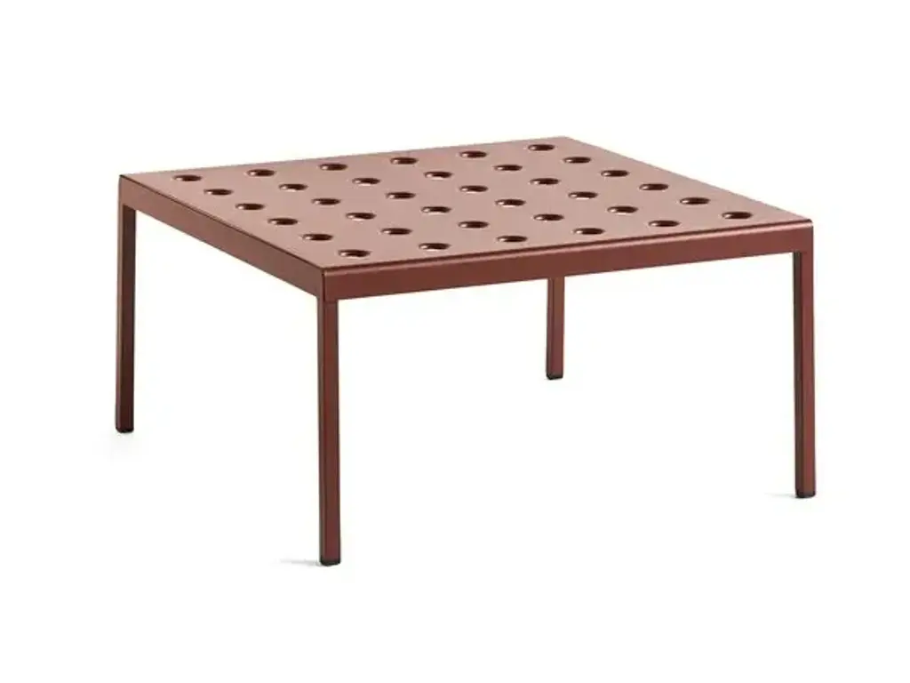 HAY’s low Balcony table is part of a clever collection of outdoor furniture designed by the Bouroullec brothers. Made of thin steel sheet, the elegant Balcony tables are incomparably light and easy to move – a perfect addition to the balcony, garden or patio. The sturdy Balcony table can also be used as an extra seat. Featuring a weather-resistant coating the Balcony collection is as carefree as it looks. The round holes pressed through the steel plate provide multiple functions: they add character and softness to the geometrical design and allow rainwater to drain off the table's surface, while also strengthening the structure of the furniture.