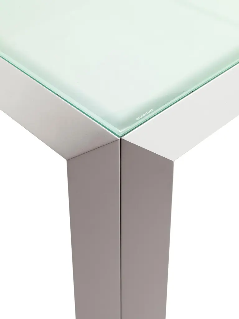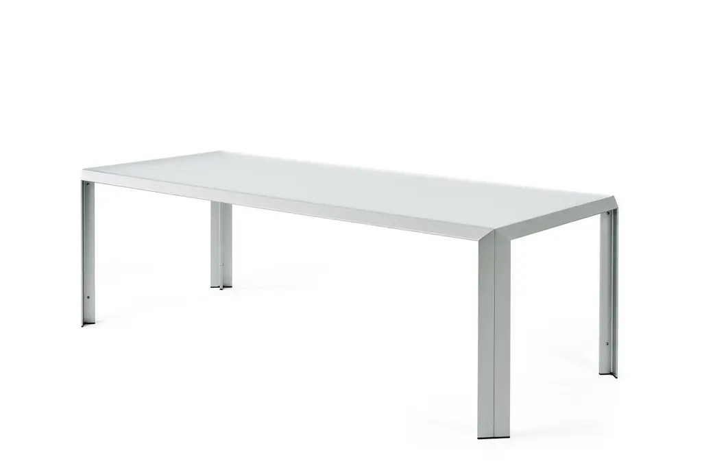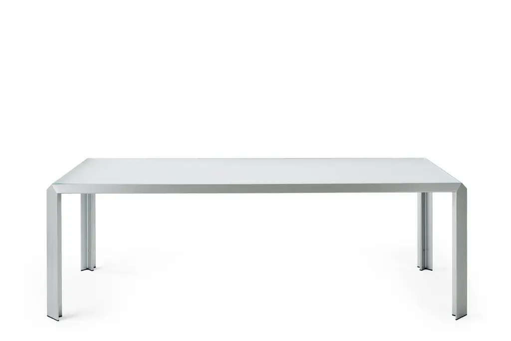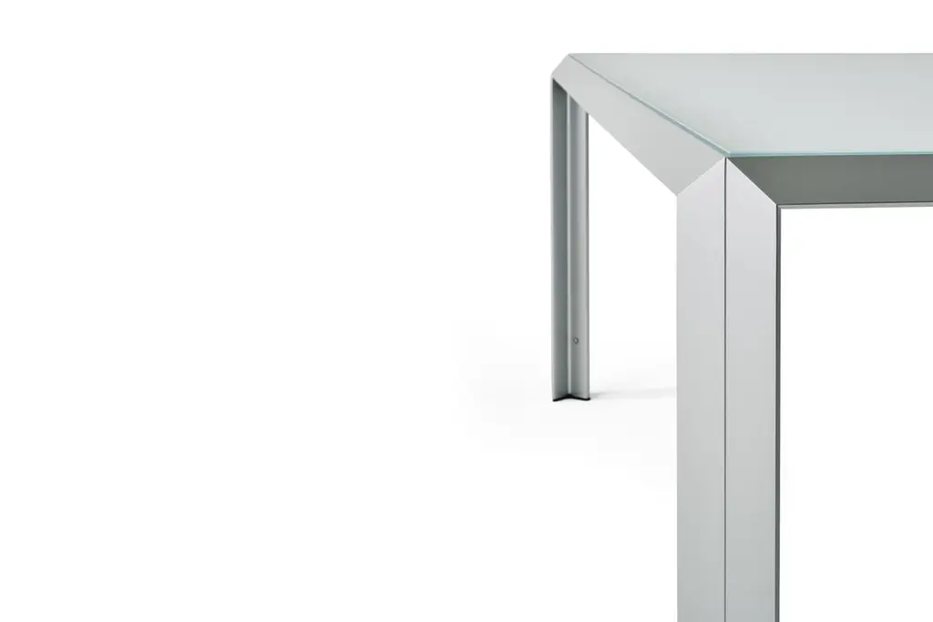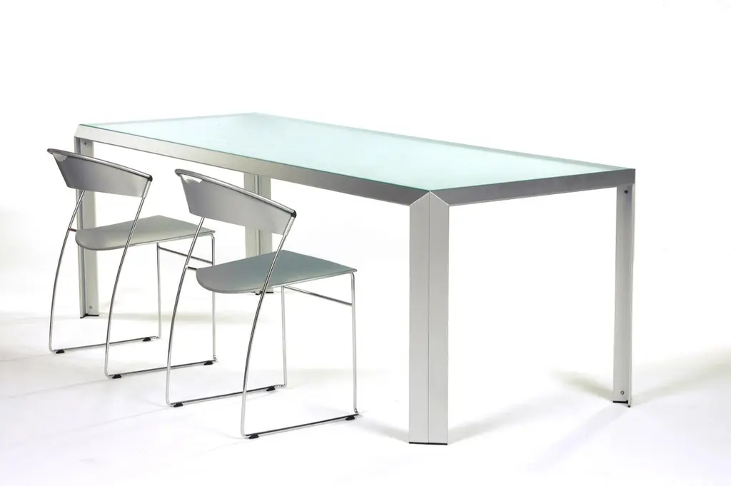 To design an essential table that stands out for its details. What might seem like a contradiction in terms - the essential and the distinctive detail - has been resolved by Mangiarotti by means of the simple combination of two “L” shaped extrusions that become a “T” with a single 45° cut: the table as a child would draw it is thus transformed into a visually refined and suspended object, and a structurally solid, light product.System of square and rectangular tables. Structure in extruded satined aluminium. The tops, with bevelled borders, are inserted flush with the structure and are available in the versions: in 12 mm translucent tempered acid-etched crystal.Angelo Mangiarotti, Milanese architect and designer, graduated from the Politecnico di Milano in 1948, leaving a significant mark on 20th-century Italian design. Renowned for the balance between form and function, he collaborated with prestigious companies, contributing to the success of modern Italian design. Among his notable architectural works are the skyscraper in Niguarda, Milan, and the church of San Giovanni Battista in Augusta. His minimalist approach and attention to construction precision are also reflected in furniture and everyday objects, which have become design icons. Mangiarotti was a member of the ADI (Association for Industrial Design), emphasizing his commitment to shaping the landscape of Italian industrial design.