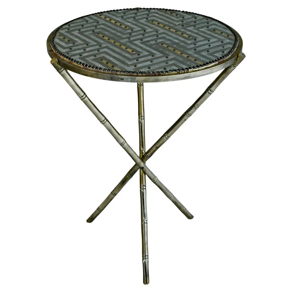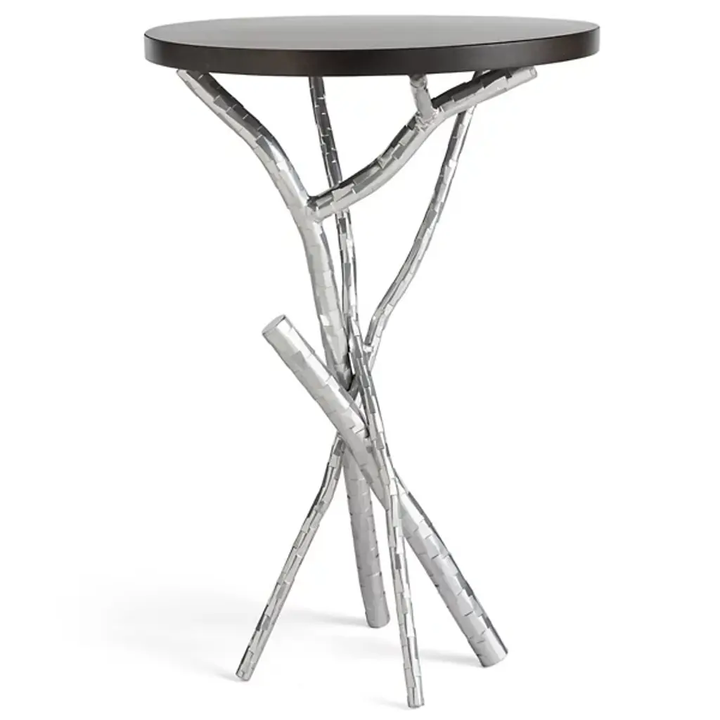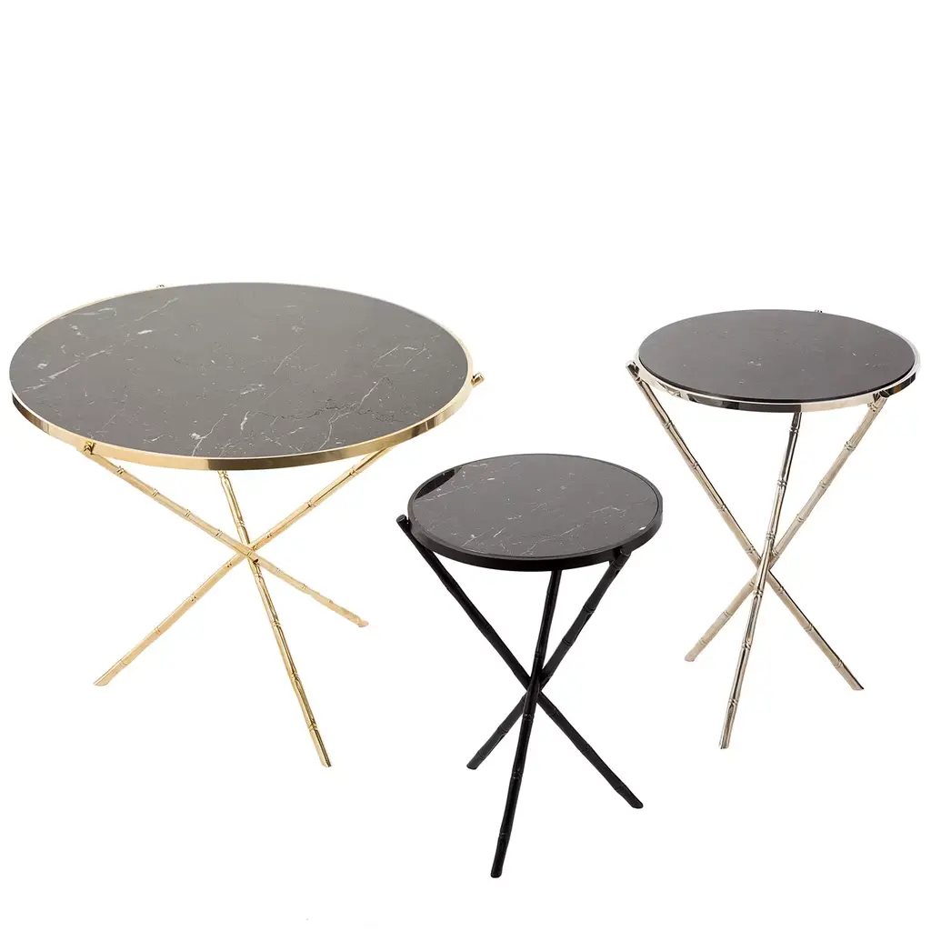This simple table's Black Marquina Marble top is held up by three legs using a sand cast technique, in natural brass with a nickel finish. The legs add a naturalistic aspect to this modern table with their forms resembling bamboo.