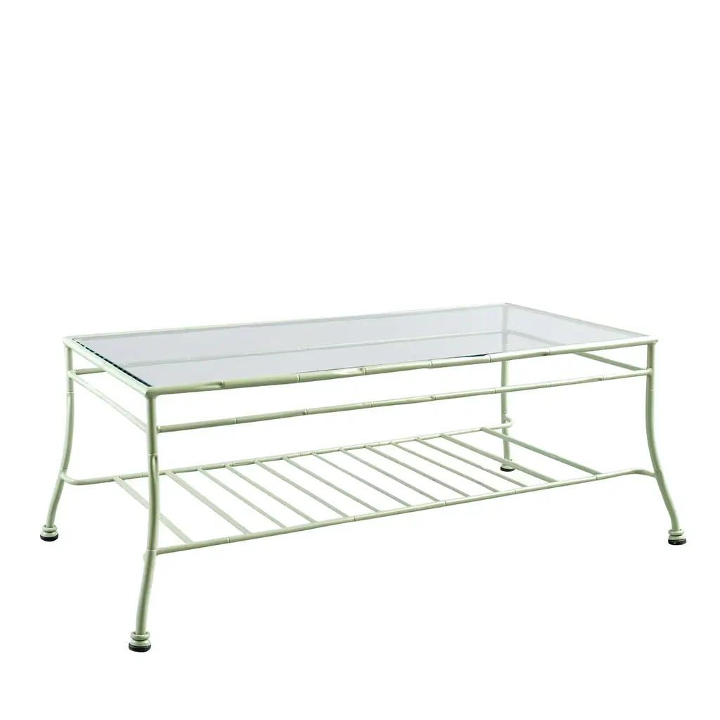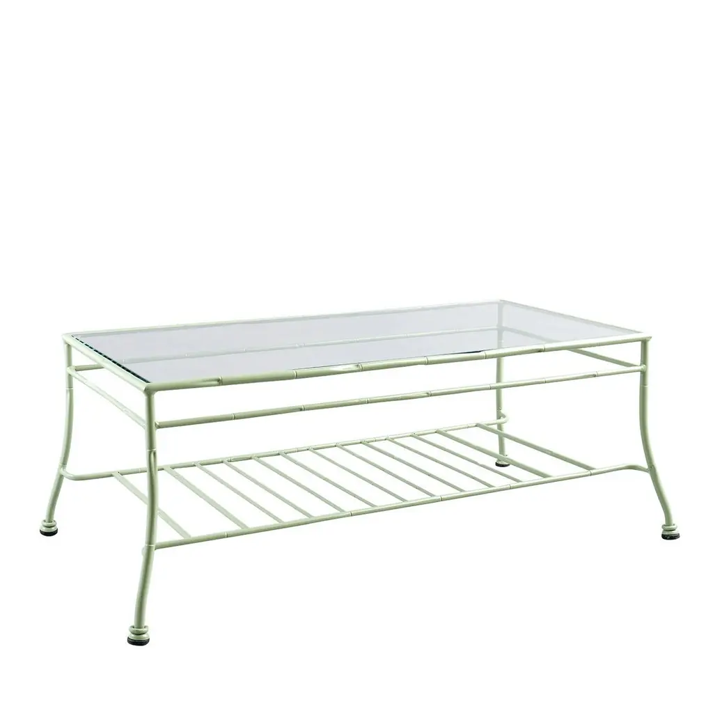 This functional yet classically stylish table is handcrafted in Florence by Officina Ciani. Part of their signature Bamboo Collection, this elegant piece features a rectangular frame with gently curved legs and a bottom shelf, all fashioned of stainless steel with a graceful engraving reproducing the texture of bamboo sticks. The glass top embellishes the refined forging of this exquisite table, which will make a perfect addition for both indoors and outdoors thanks to the special zinc-based powder protective coating.
