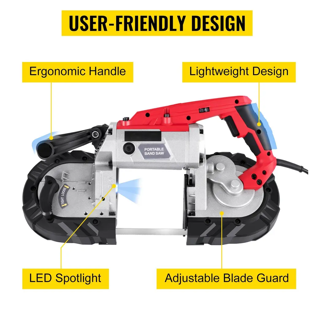 Huge Cutting Capacity: The cutting capacity of the band saw: without base: 4.7"x4.7" deep-cut capacity for rectangular stock, 5 in capacity for round stock. With base: 3.9"x3.2" deep-cut for rectangular stock, 3.93" for round stock. Powerful Motor: 1100W 10 amp powerful pure copper motor, designed with controlled power to withstand any jobsite application. Cutting Speed: 137.8-472.4ft/min, provides quick and smooth Cutting with no sparks and burrs. Ergonomics Design: Superior balance allows for more accurate cuts. Ergonomic soft grip back handle provides comfort during use. The saw blade guard can be adjusted to avoid the saw blade from jamming and sesecure without hurting your hands. Premium Bi-metal Blade: Our cordless bandsaw possesses a high-quality bi-metal blade. Tool-free blade changing lever loosens to allow for blade change, easy to disassemble (without base option). Simple Operation: 45°-90° Cutting with Removable Alloy Steel Base, The base can also be Swiveled angle from 0° - 45°. It is easy to disassemble. With this workbench base, you can keep the cutting material stable and secure (with base option). Extensive Use: This metal cutting bandsaw fits for cutting metal, steel, aluminum, and composite cable. Besides, It can be used for angle iron, PVC pipe, and any similar material. Package Content 1 x Band Saw 1 x Blade (without base option)/2 x Blades (with base option) 3 x Hex Keys