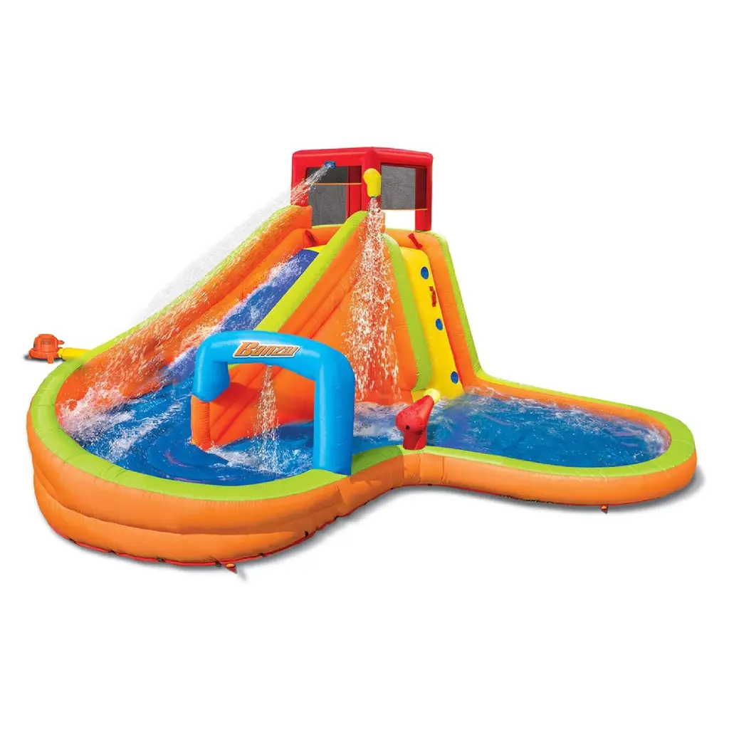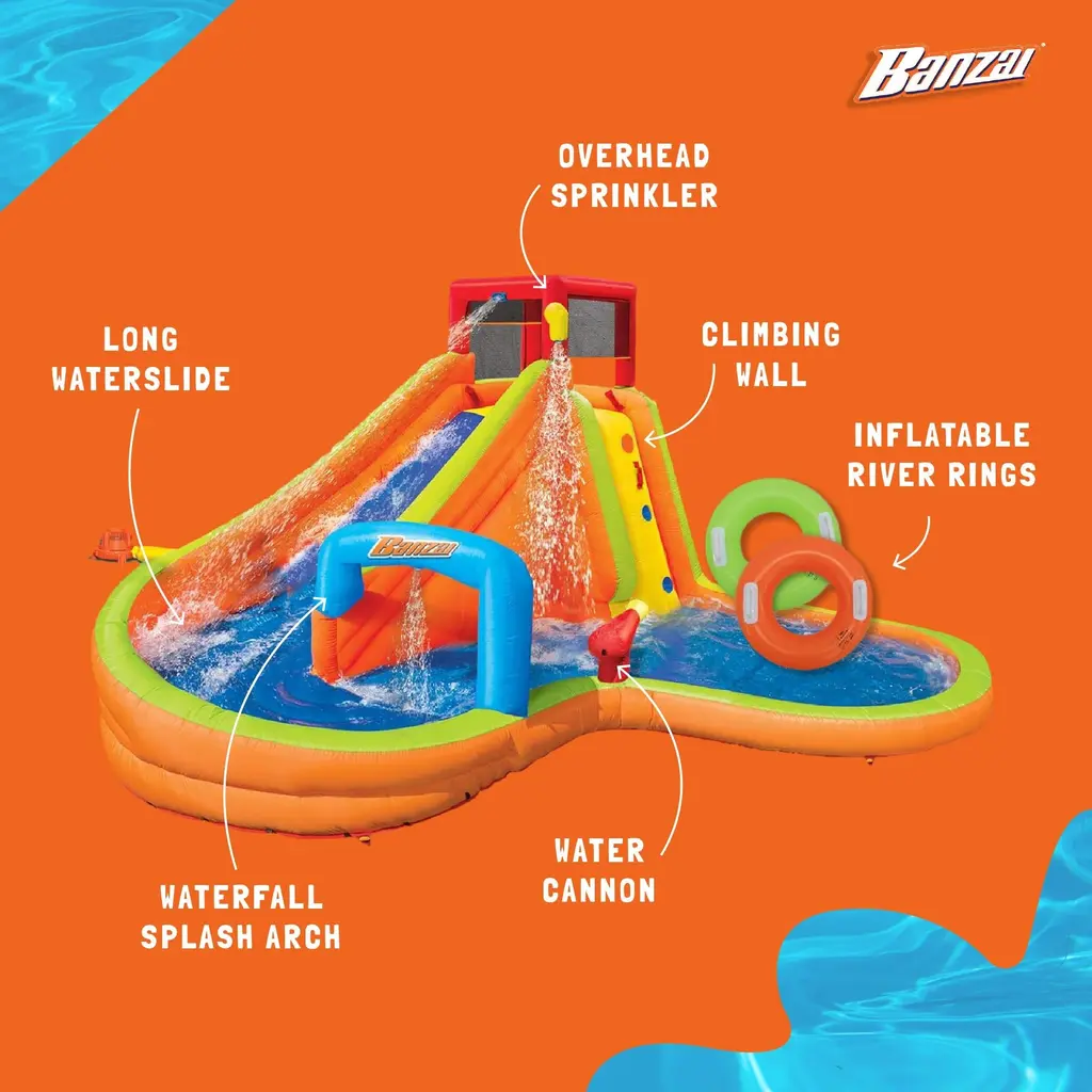 Bring the fun of the water park home to your own backyard with the Lazy River Inflatable Outdoor Adventure Water Park from Banzai, and get ready for hours of fun with your favorite people. Scale the climbing wall or blast your friends with the water cannon while racing to the top before securing back down the banked curvy slide and splashing into the swimming pool. Equipped with the water-blasting cannons are 2 river rings that are included for added fun as you slide down into the lazy river. This backyard adventure has everything your kids need to be entertained for hours. Use the included 2 anchor bags to ensure ultimate stabilization and safety of this water park. The heavy-duty construction is made to support up to 150 pounds at a time and will stand up to as much fun as you can throw at it. Enjoy a summer of fun by adding the Inflatable Adventure Water Park From Banzai to your backyard. Summer staycations have never been more fun than with the help of this gigantic inflatable water park Equipped with a scale climbing wall, curvy slide, additional sprinklers, water cannons, and swimming pool to provide hours of fun Slip and slide down the large slide using the 2 included inflatable river rings or sit in them while floating around the lazy river Includes a constant air blower motor that will get the water park blown up in just 3 minutes of time Made of heavy-duty PVC materials to ensure long-lasting use summer after summer; Supports up to 150 pounds Use the 2 anchor bags for ultimate stabilization and safety, and use the storage bag for a simple storage solution Recommended for kids 5 years and older Material: PVC Color: Multicolor Dimensions (L x W x H): 180 x 160 x 95 inches Weight: 55 pounds Manufacturer warranty: 60-day warranty for water slide and accessories, 180-day warranty for blower motor
