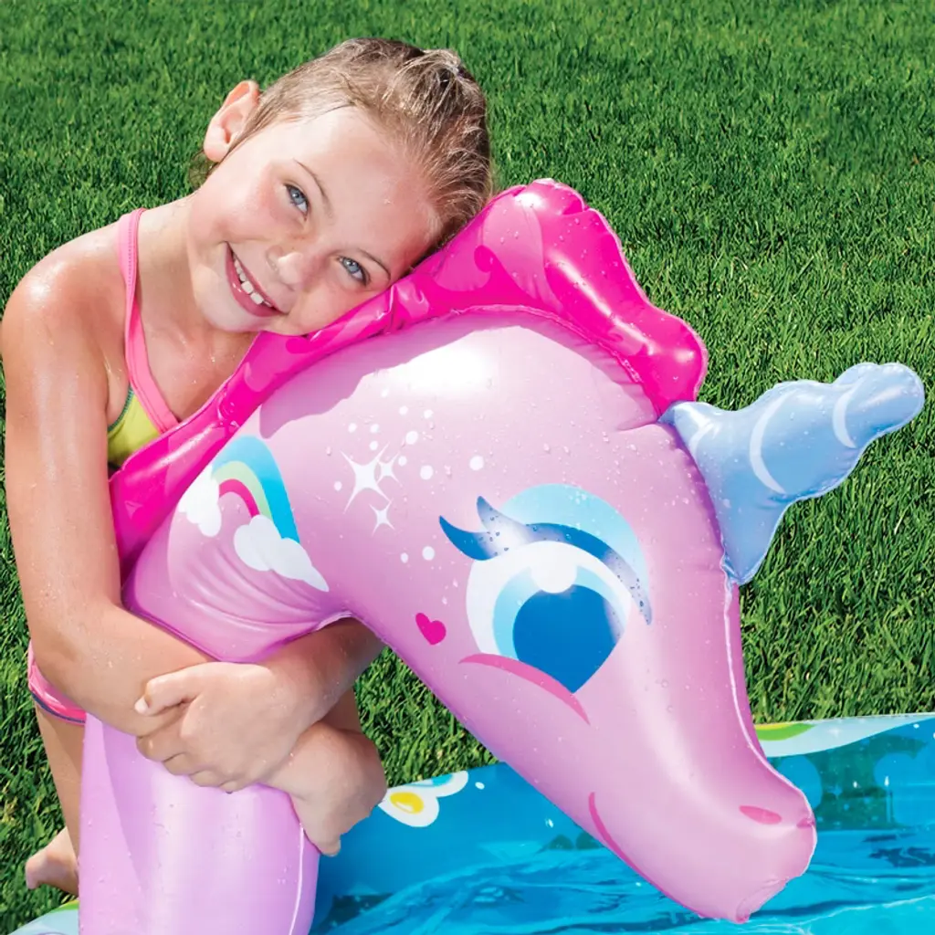 There's a Unicorn in your backyard! Go down the slide and splash into the sweetness of summer with the Spray N' Splash Unicorn pool! Little ones will love to splash and play with the magical unicorn and its water filled 5 ft diameter pool. It is constructed with durable PVC material for long lasting use!