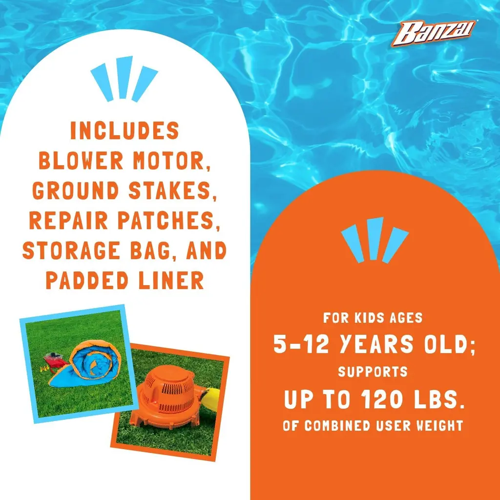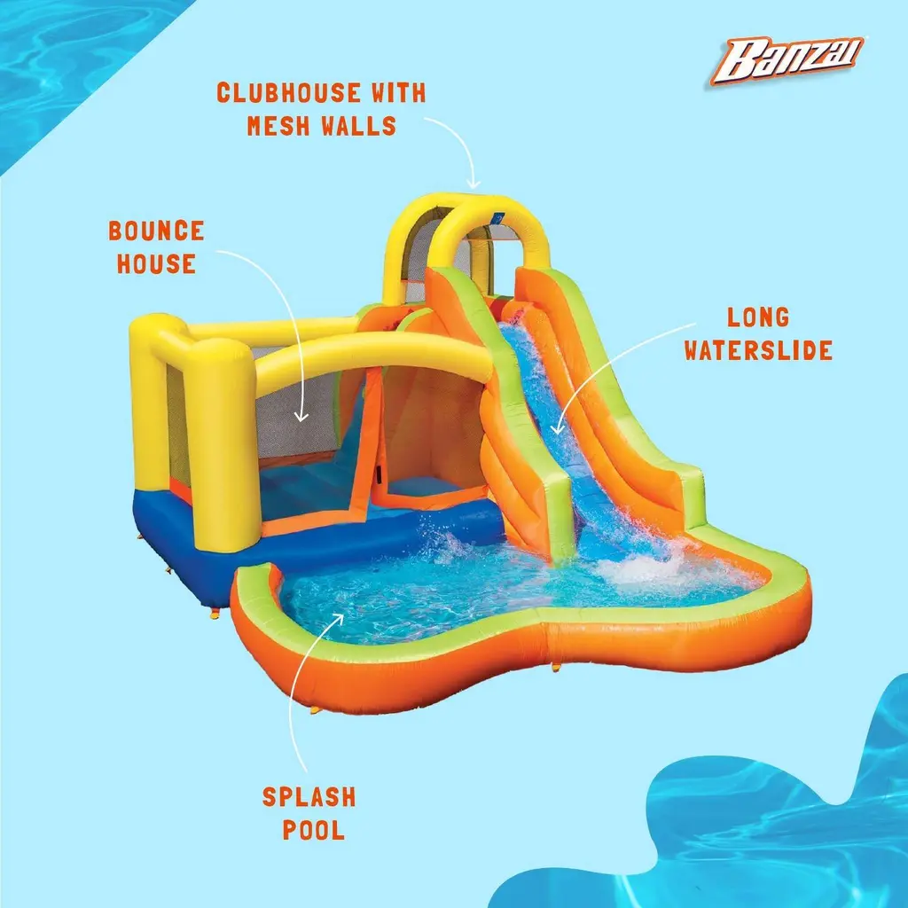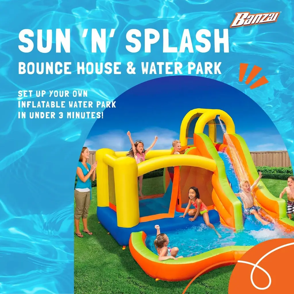Get ready for a summer of non-stop fun with the Banzai Sun 'N Splash Fun Inflatable Outdoor Backyard Bounce House. This amazing backyard water park features a bounce house, water slide, and splash pool to keep your kids active and entertained. Your little ones can jump and tumble in the spacious bouncing and jump area before climbing the wall and splashing into the pool. Simply attach a garden hose for endless outdoor fun and backyard playtime in the water. And if it's a bit too chilly for splashing, you can use this inflatable bounce house without water for dry play too. Set up this inflatable playhouse in a breeze, inflating in under 2 minutes with the included blower motor. It is also built to last summer after summer due to its heavy-duty Dura-Tech construction, which ensures strength and durability. This fantastic water park is compact in size and measures about 12 feet long, 9 feet wide, and 7 feet tall, with a bounce area that's 5 feet long and 4 feet wide. With it's size, this water playground does not need much space for unlimited fun. It's perfect for kids aged 5 to 12, supporting up to 120 pounds per child and a total weight of up to 150 pounds. Bring the waterpark to your backyard and let the Banzai Sun 'N Splash Fun Inflatable Outdoor Backyard Bounce House & Splash Park create endless summer memories for your friends and family. Entertain energetic kids all summer with the 2-in-1 inflatable backyard water park with a bounce house, water slide, splash pool, sprayer, and climbing wall Bounce house play center can be played in with water or dry for endless backyard fun Large inflatable water park measures 12 feet long, 9 feet wide, and 7 feet tall, with the bounce area measuring 5 feet long and 4 feet wide Built with heavy-duty Dura-Tech materials and a padded liner to ensure lasting strength and durability Included blower inflates water park in under 2 minutes, and water fills from any attached garden hose Equipped with a detachable water-spraying hose assembly above the slide to keep kids cool and refreshed Includes reliable ground stakes for ultimate stability, repair patches, and a convenient storage bag Recommended for kids ages 5 to 12 who weigh up to 120 pounds; Supports up to 150 pounds at once Material: PVC Color: Multicolored Dimensions (L x W x H): 144 x 108 x 89.04 inches Weight: 44.7 pounds