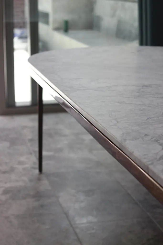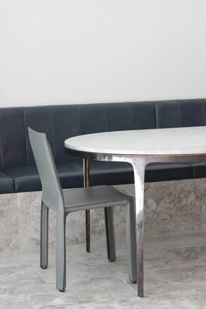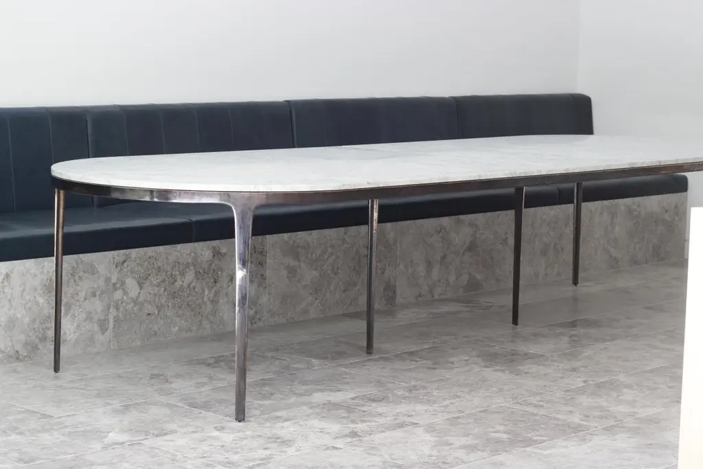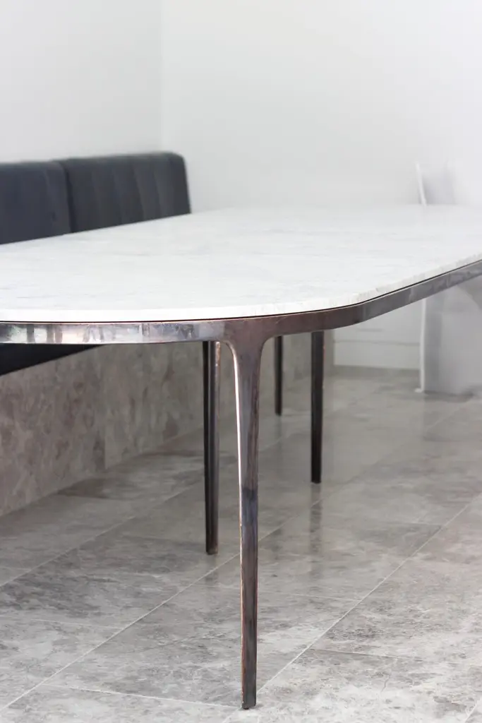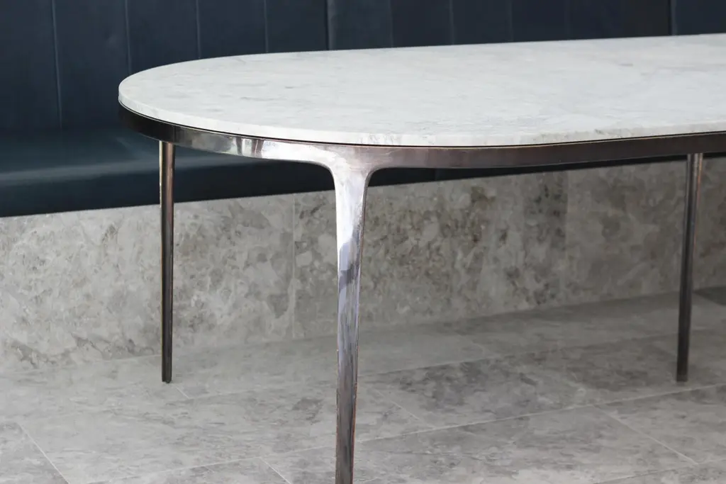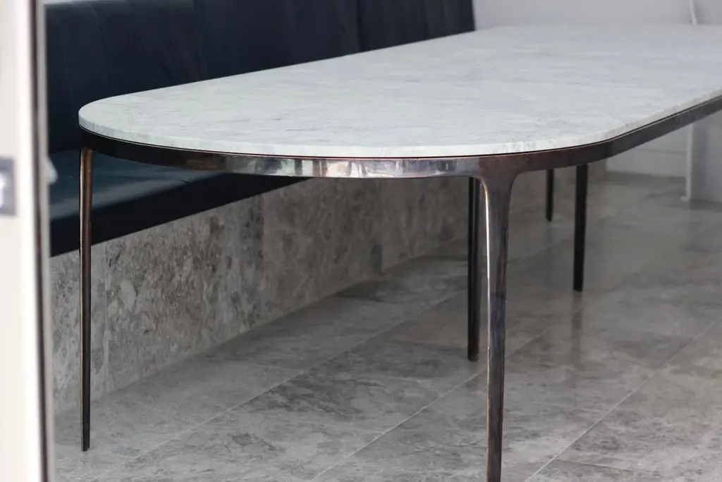 Designed by Daniel Barbera, the 'Bronze' table is a Minimalist oval table consisting of Classic geometry on the exterior merged with organic flowing underside. The four legged sandcast solid bronze base is hand finished to a smooth mirror polish, with the option of a satin or blackened bronze. This table base is mated to a super white marble stone top. Other varieties of timber and stone are also available. The dimensions of this one is 360 x 120 x 74cm high. Each of these tables are made by hand with love to order.Other sizes are available with widths at 60/80/100/120/140/160cm and lengths ranging from 120cm to 360cmDesigned and made in Australia.