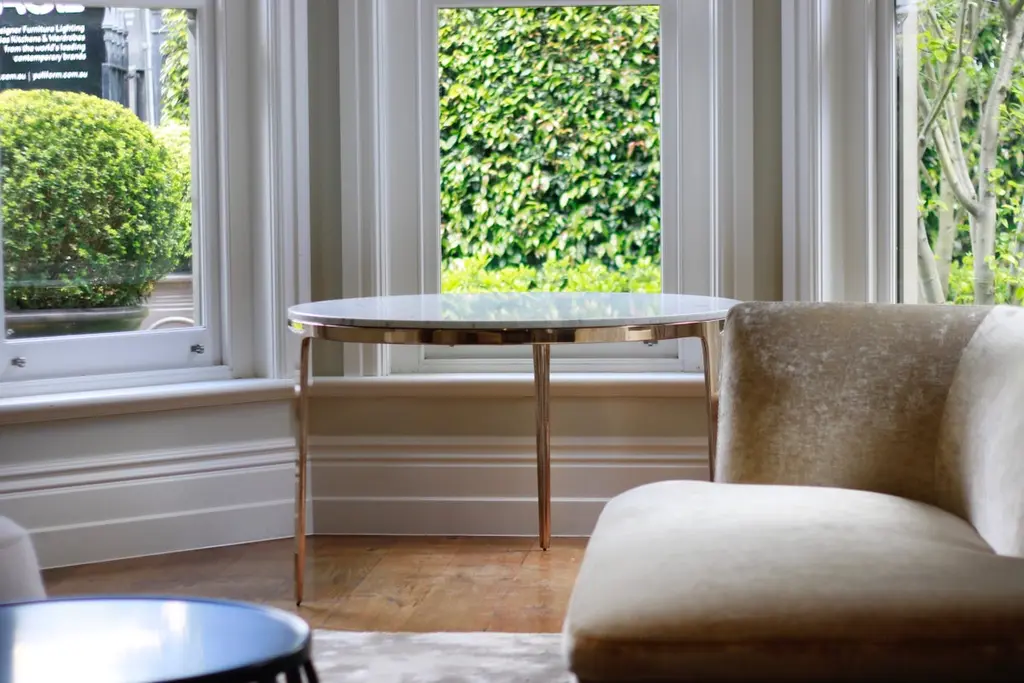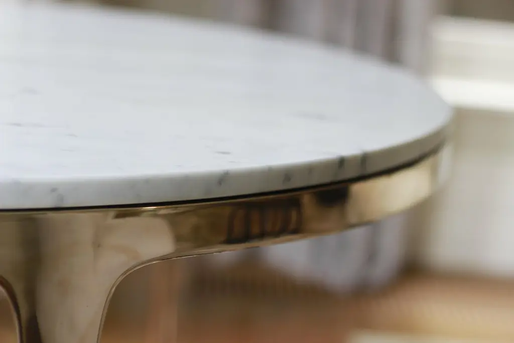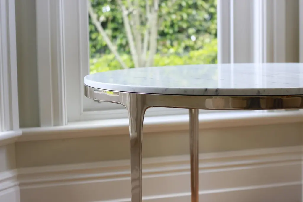 Designed by Daniel Barbera, the 'Bronze' table is a Minimalist round table consisting of Classic geometry on the exterior merged with organic flowing underside. The three legged cast solid bronze base is hand finished to a smooth mirror polish, with the option of a satin or blackened bronze. This table base is mated to a Bianco Carrara marble stone top with a honed finish. Other varieties of stone and timber are also available. The diameter is 120cm/47inch. Each of these tables are made by hand with love to order. Designed and made in AustraliaDiameters available:60cm, 80cm, 100cm, 120cm, 140cm, 160cm.