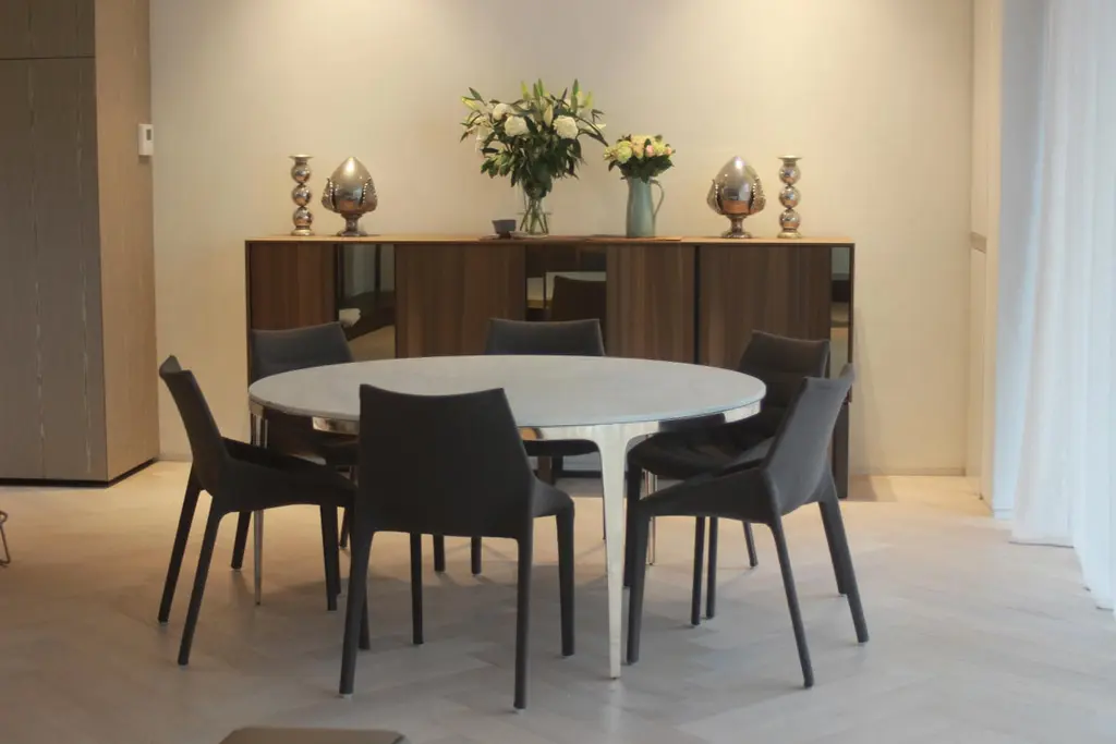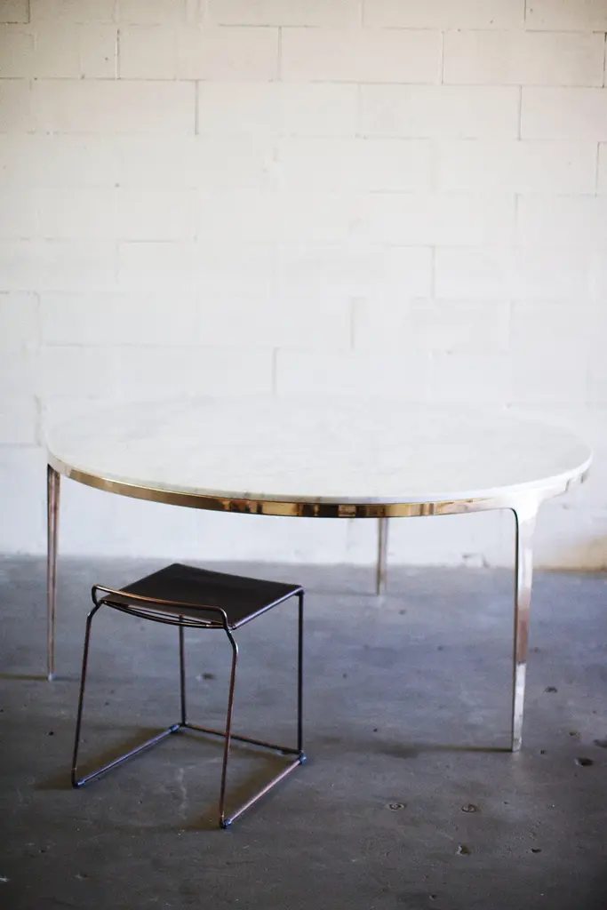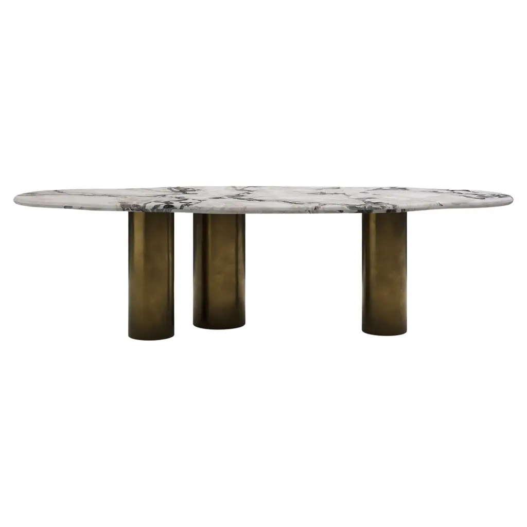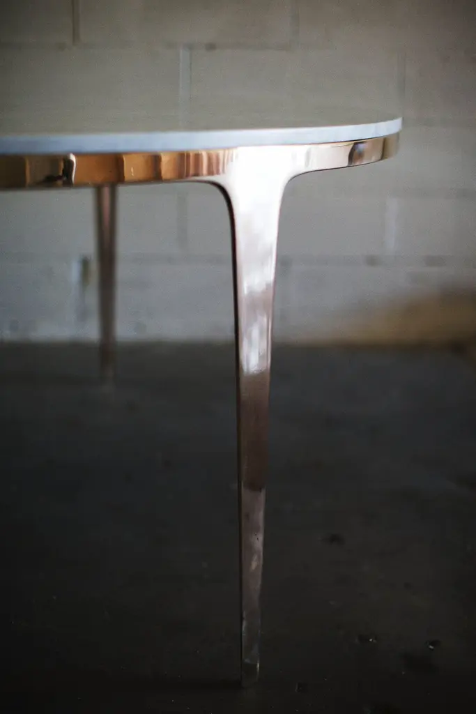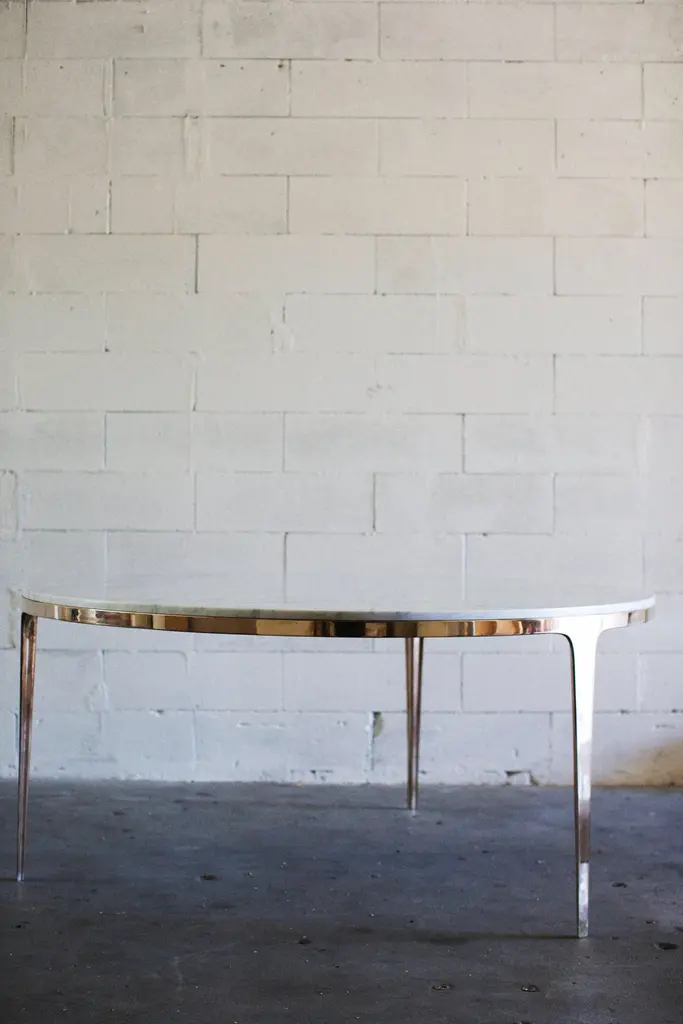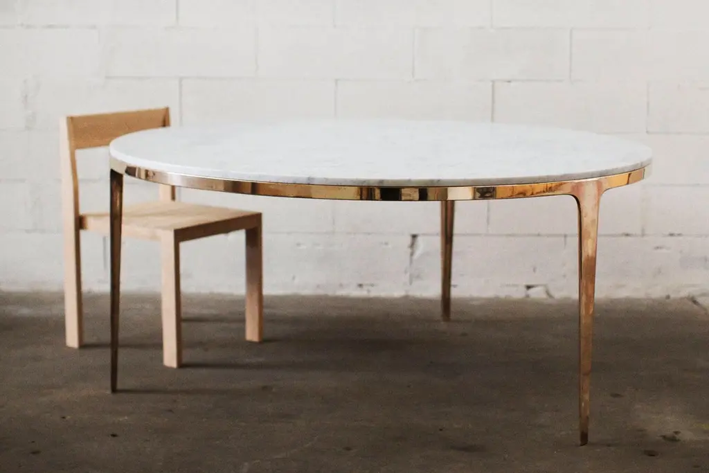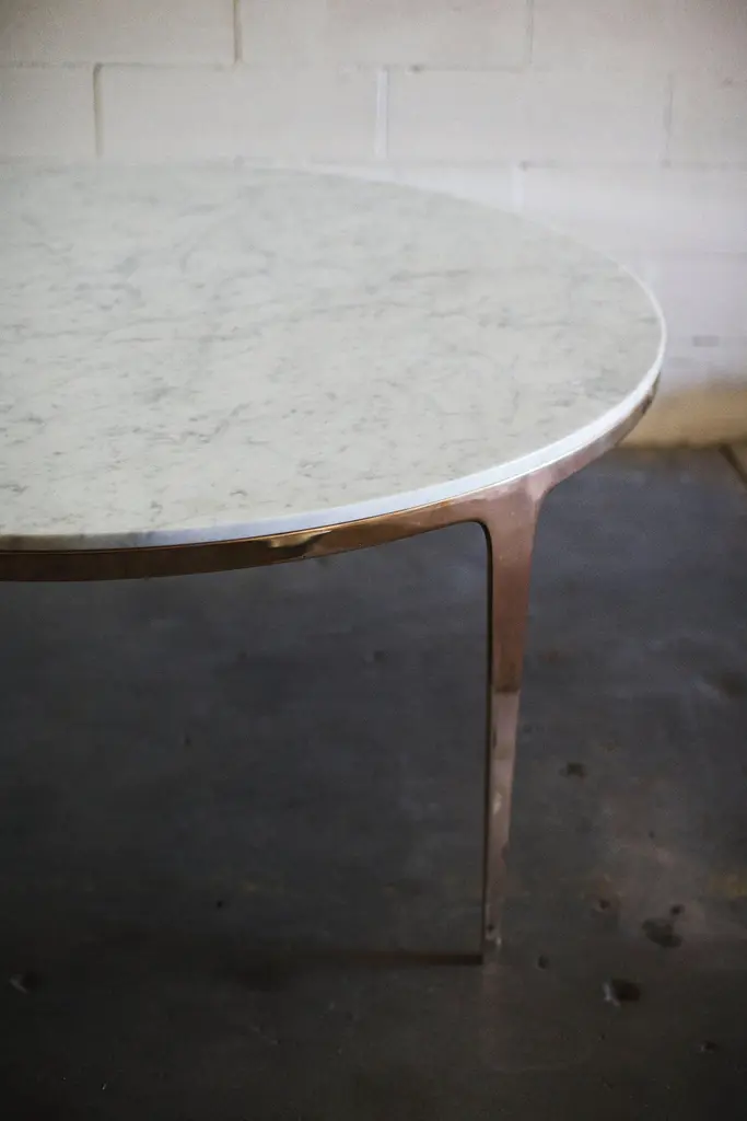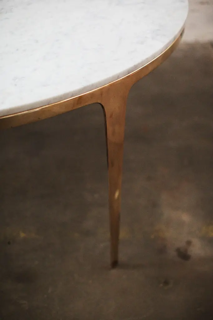 Designed by Daniel Barbera, the 'Bronze' table is a Minimalist round table consisting of Classic geometry on the exterior merged with organic flowing underside. The three legged cast solid bronze base is hand finished to a smooth mirror polish, with the option of a satin or blackened bronze. This table base is mated to a Bianco Carrara marble stone top with a honed finish. Other varieties of stone and timber are also available. The diameter is 160cm each of these tables are made by hand with love to order.Designed and made in AustraliaDiameters available:60cm, 80cm, 100cm, 120cm, 140cm, 160cm.