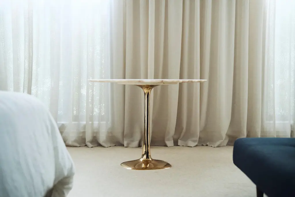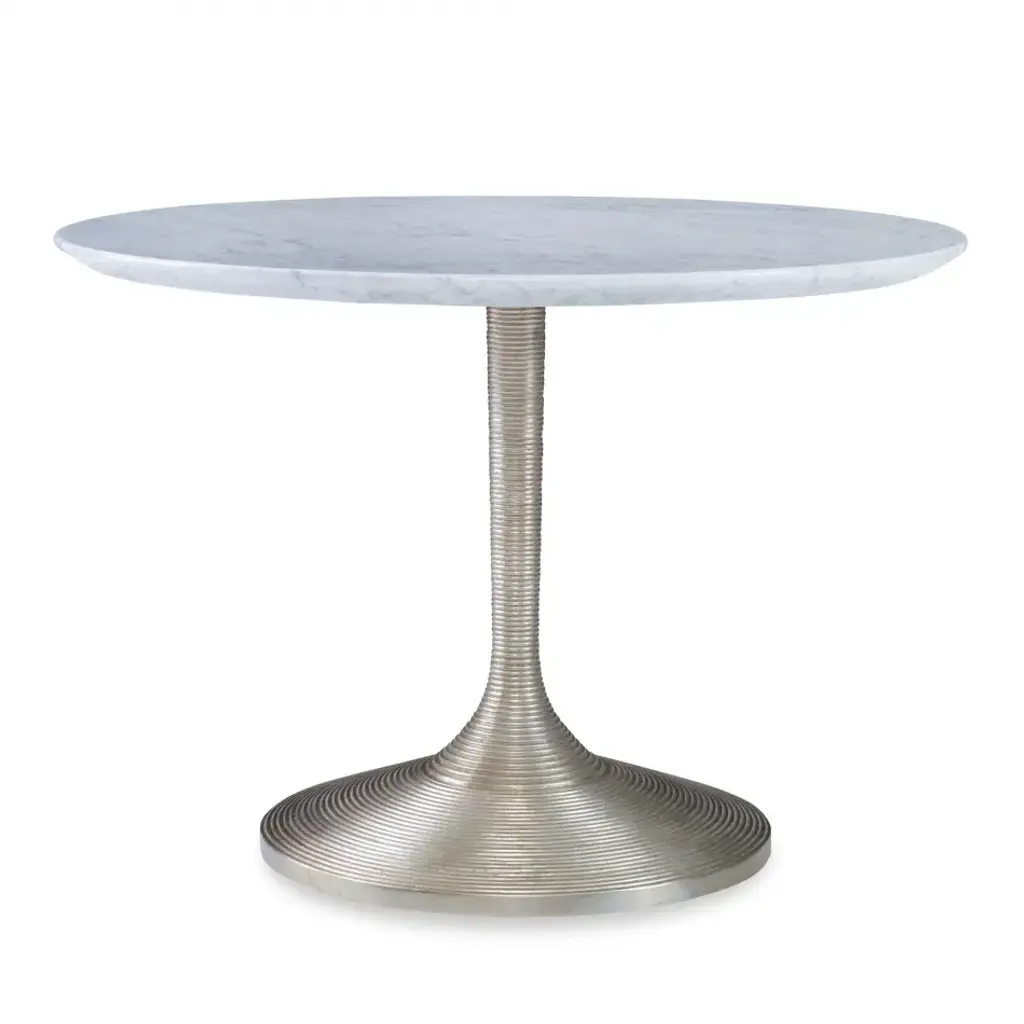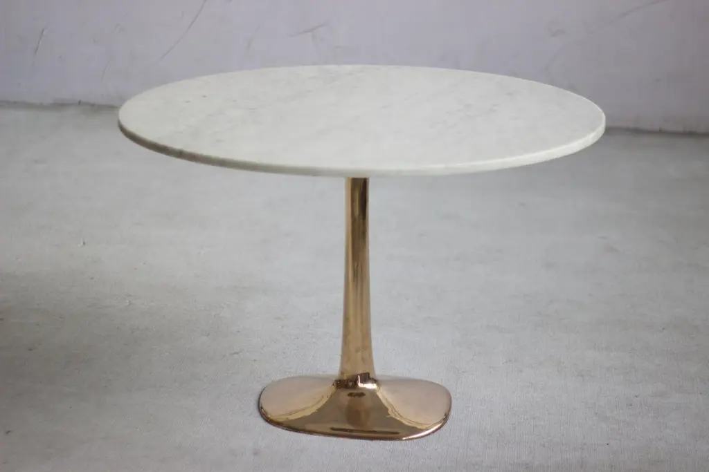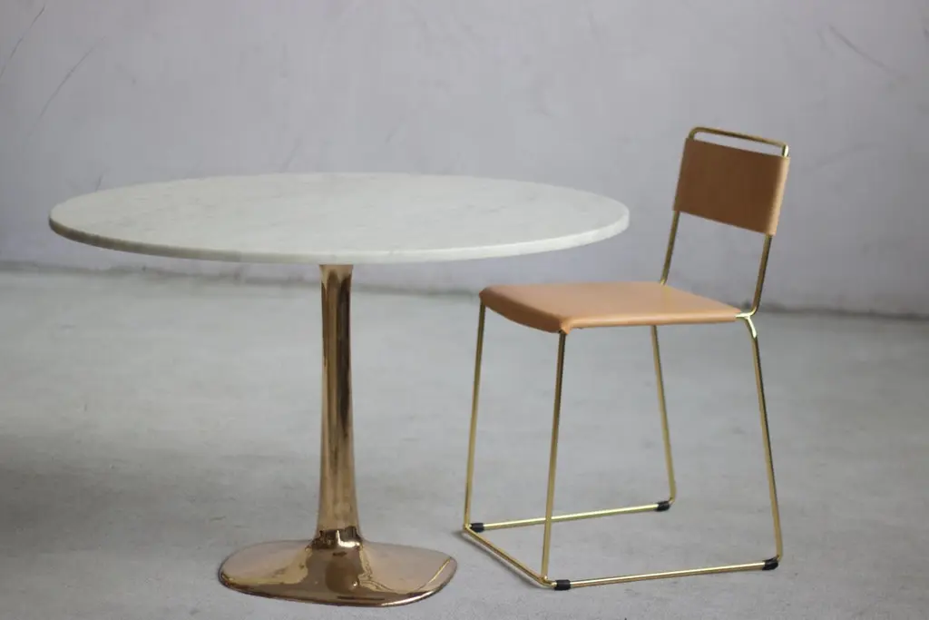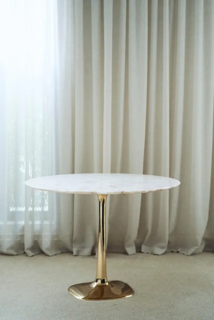 Designed by Daniel Barbera, the 'Molecule' table is pedestal table base, that has a range of sizes for different types of usage. The single solid bronze base is sandcast and worked to a smooth polished form, this can also be hand finished to a satin or blackened bronze. This table base is mated to a Bianco Carrara marble top. Other varieties of stone and timber are also available. The size of this Molecule base is the medium version with a stone measuring 110cm diameter. Each of these tables are made by hand with love to order.Designed and made in AustraliaSize range available:Round- 45-130cm diametersOval- 60-150cm heights between 40-74cmsmall medium large bases sizes to suit tabletop sizes above.