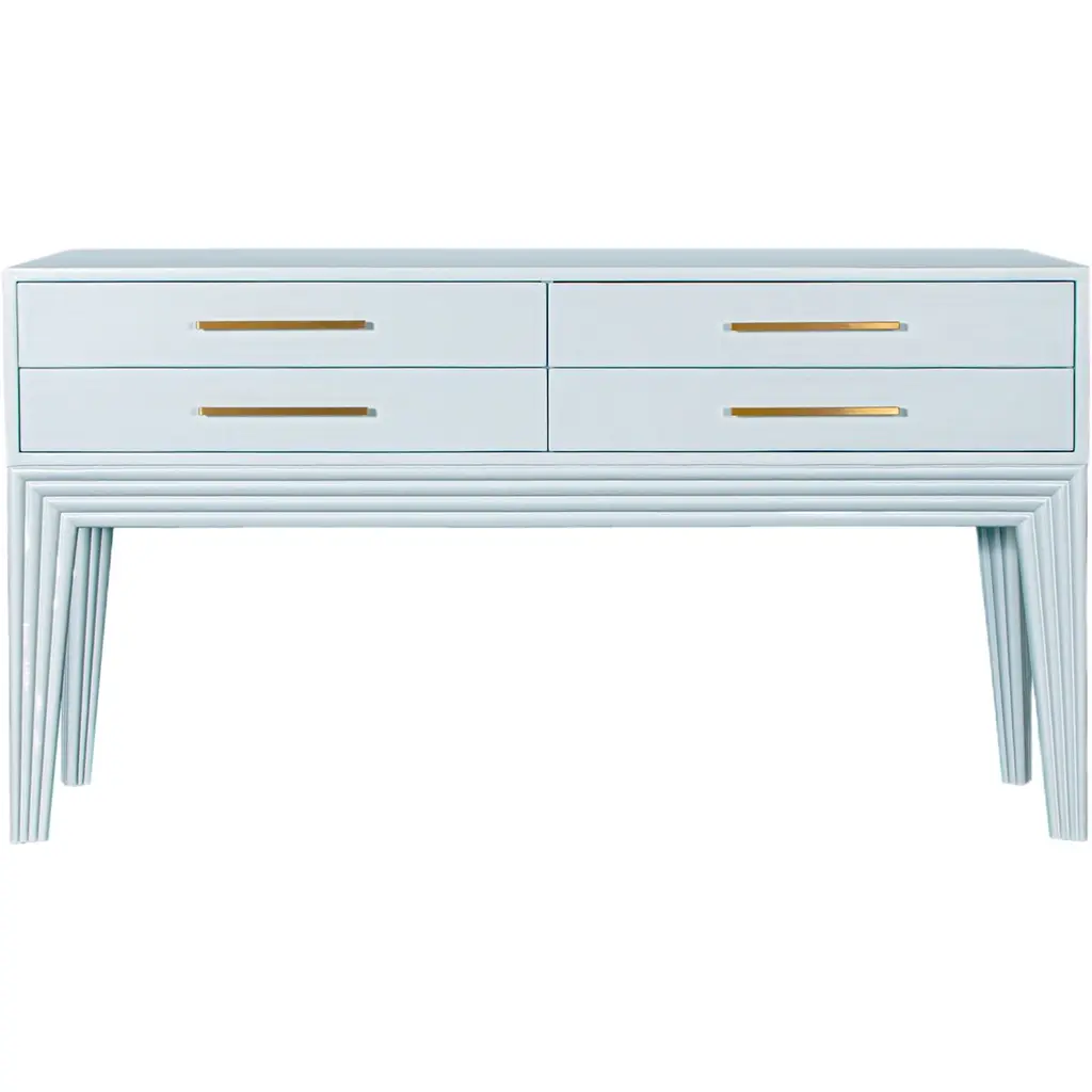 Combining function and style, this console table is expertly crafted with a wood frame and carved hardwood pole-designed legs for a sturdy and elegant look. With four drawers and full extension metal drawer glides, it offers ample storage and easy access. Available in various finishes and multiple hardware options, this eco-friendly piece is a beautiful addition to any room.