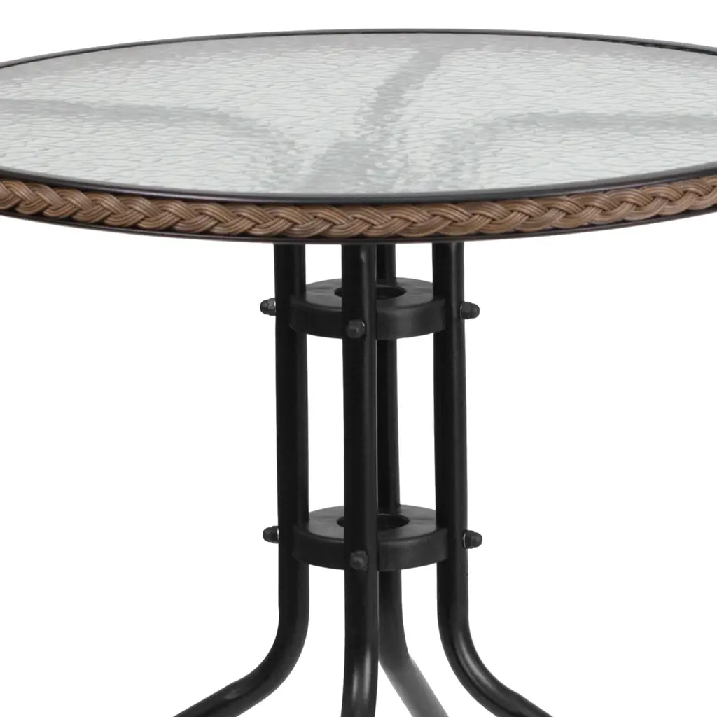 Barker 28'' Round Glass Metal Table With Rattan Edging And 2 Rattan Stack Chairs
