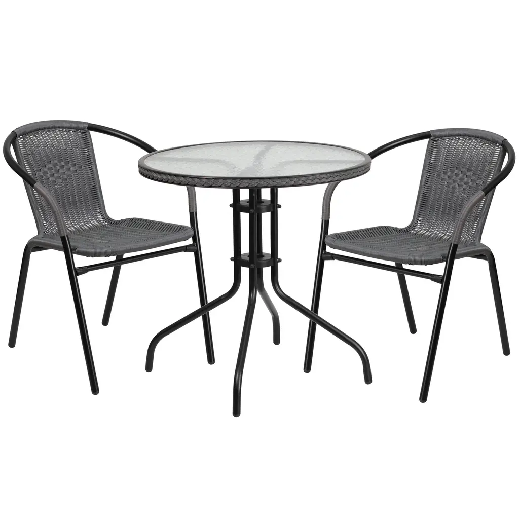 If you love hosting family and friends on your deck or need extra seating for the new dining patio of your cafe, this round table and 2 chair set is just what you need. The table's rippled designer glass top has a smooth surface for keeping items level. The rattan edge band complements the chairs and adds just the right touch for a stylish cohesive look. The lightweight chairs feature a curved back, comfortable rattan seat and integrated arms. Cross braces provide extra stability when sitting and these sturdy chairs hold up to 352 lb. weight capacity. For easy storing and cleaning purposes these chairs stack up to 23 high. This set was designed for all-weather use making it a great option for indoor and outdoor settings. For longevity, care should be taken to protect from long periods of wet weather. Whether you are just starting your business, expanding your "al fresco" seating or springing for the outdoor kitchen you've always wanted, this set will give you the perfect look.