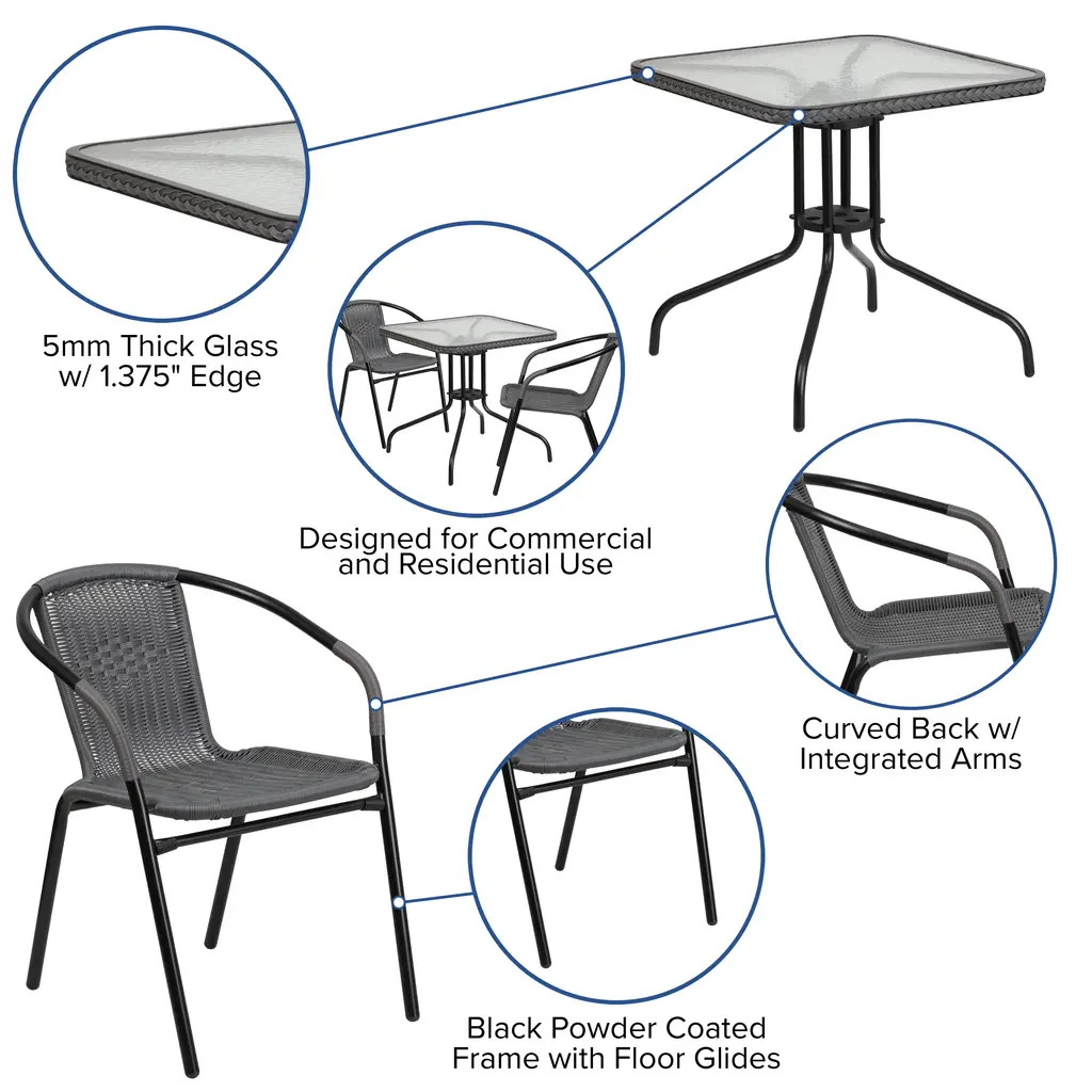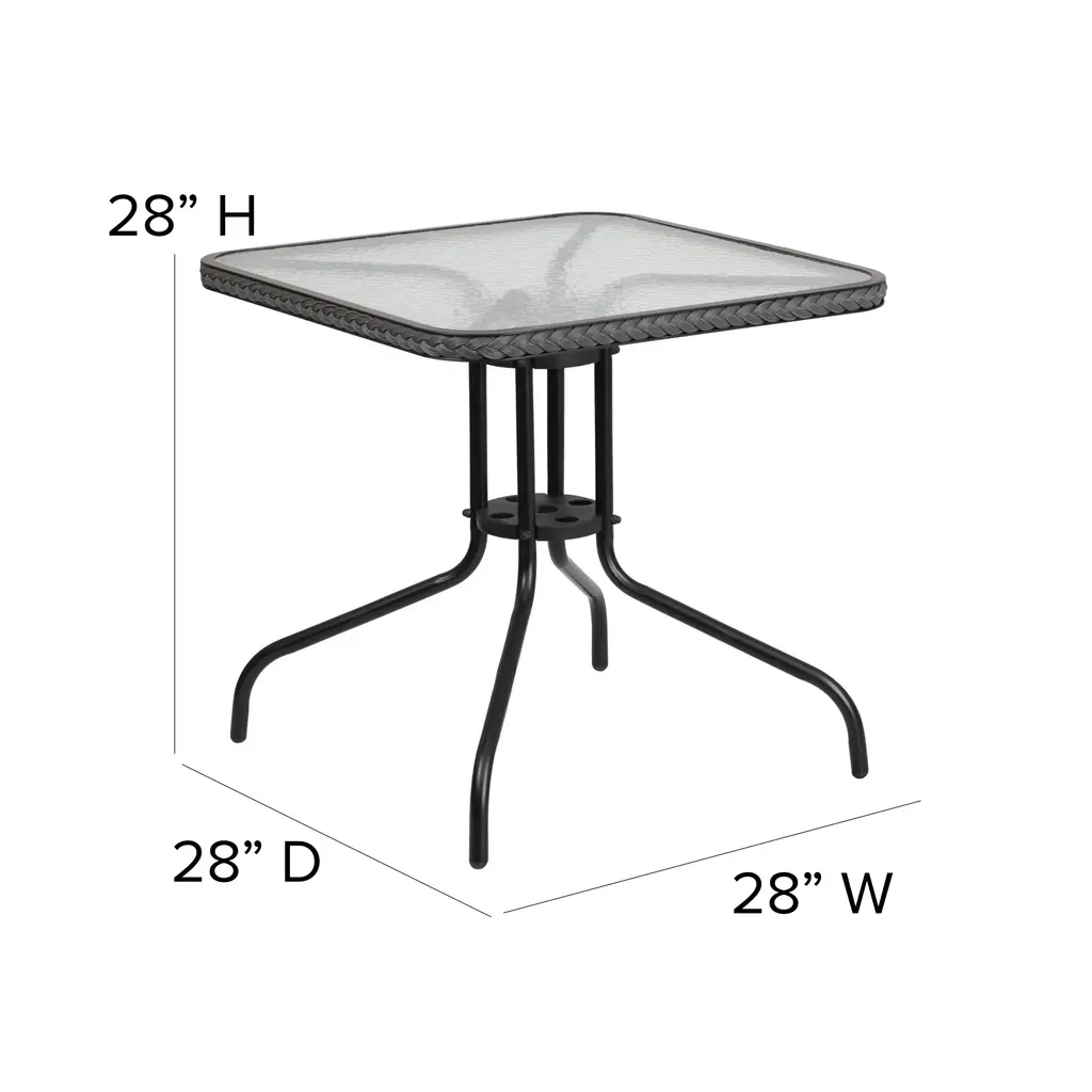 Barker 28'' Square Glass Metal Table With Rattan Edging And 2 Rattan Stack Chairs