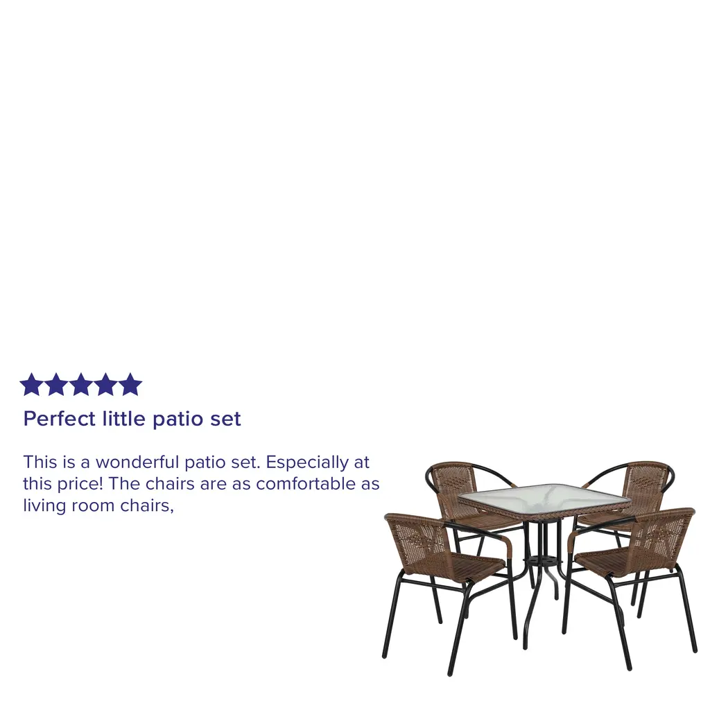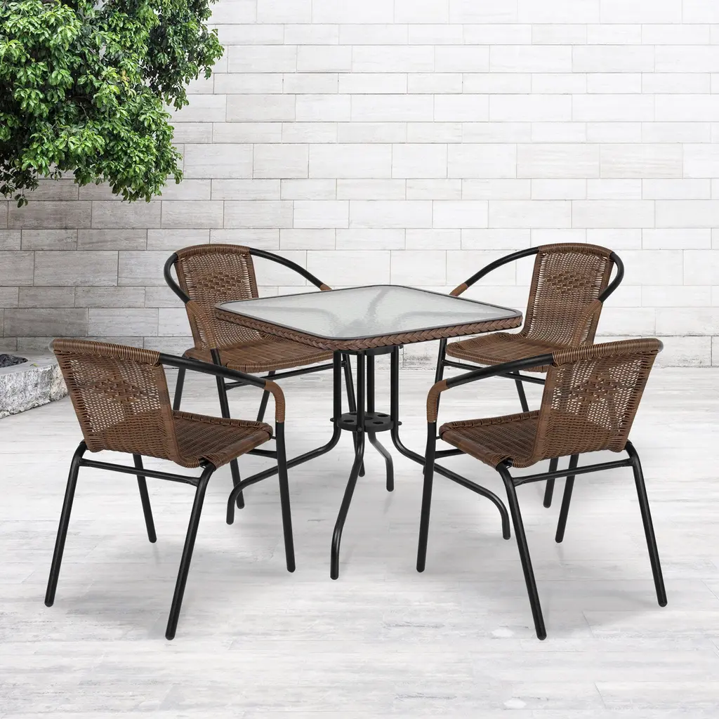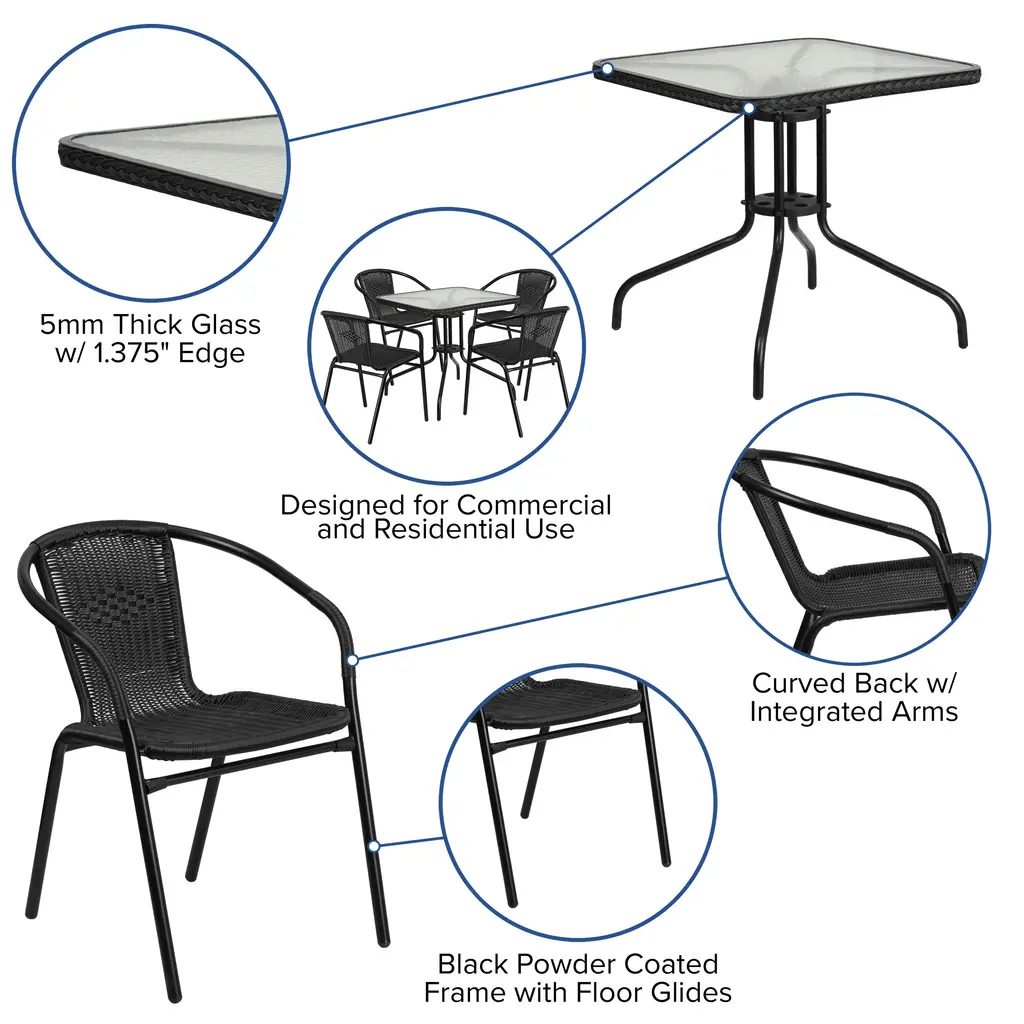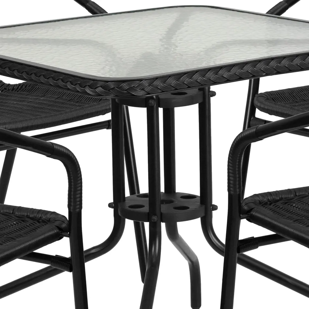 Barker 28'' Square Glass Metal Table With Rattan Edging And 4 Rattan Stack Chairs