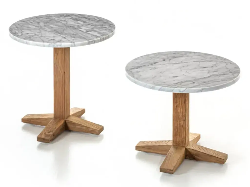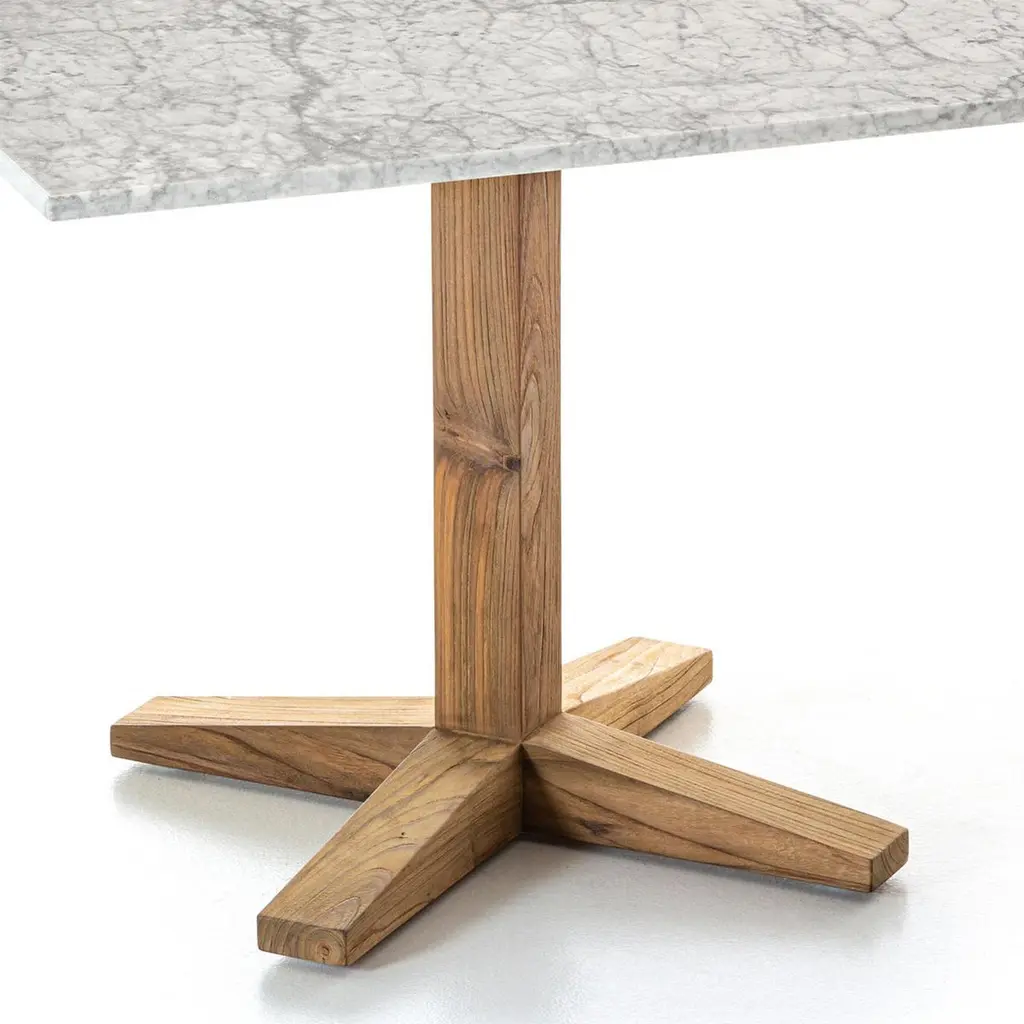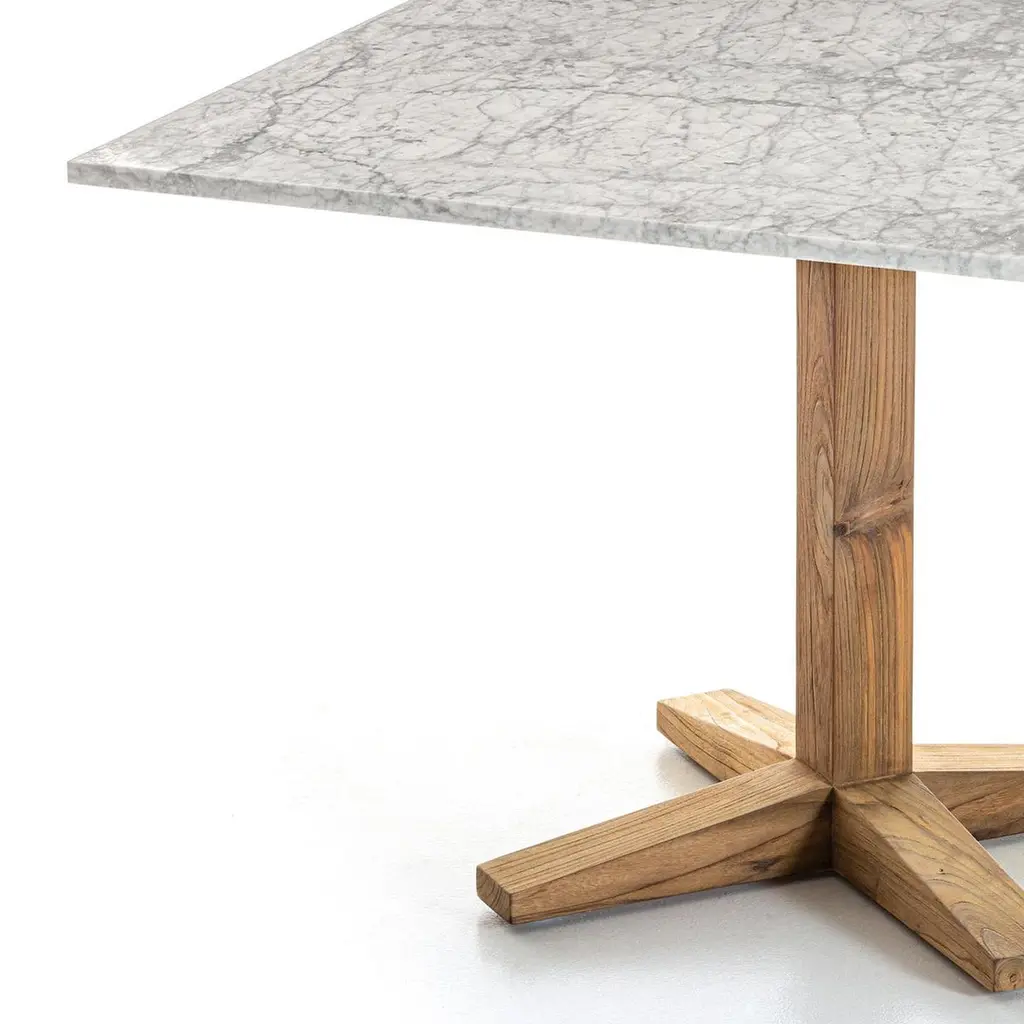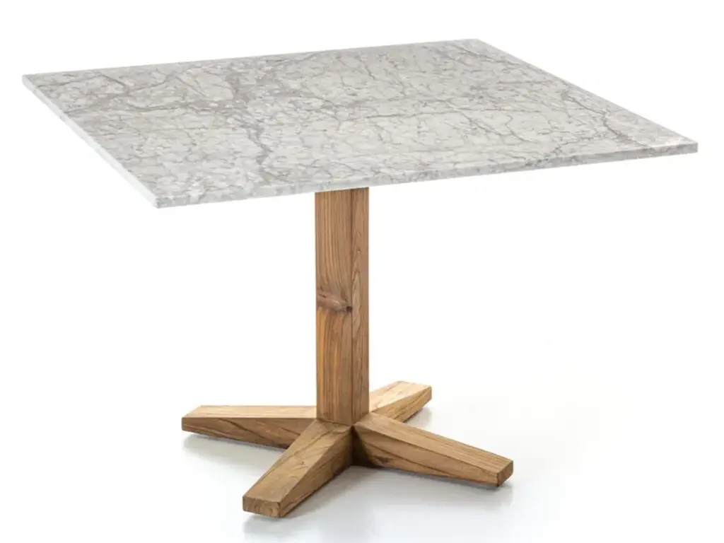 Table square low Barletta with structure in solid teakwood and with polished carrare white marble top.