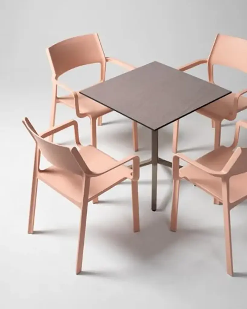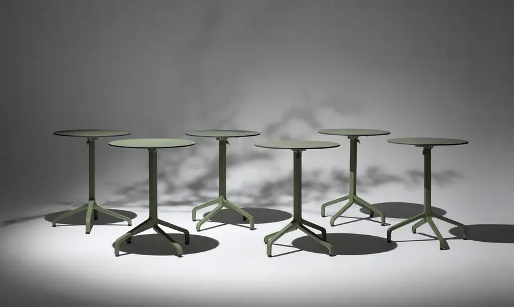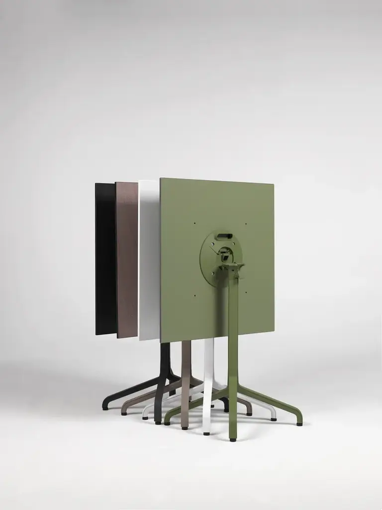 An innovative and highly functional base for contract tables, with a coated alu-minium 4-foot central leg, for professional use.In the mini version, it is combined with Ø60, Ø70, 60x60 and 70x70cm tops that can be tilted and stacked horizontally, but it can also support Ø80 and 80x80 cm fixed tops. The leg with offset feet makes it really easy to stack the tables to save space and/or for cleaning, and just as easily allows them to be quickly used again. The outcome is extreme practicality and flexibility of use, making Frasca ideal for environments such as bars, restaurants and public spaces.Also available in a maxi version that supports Ø80, Ø90, 80x80 e 90x90 cm fixed tops.