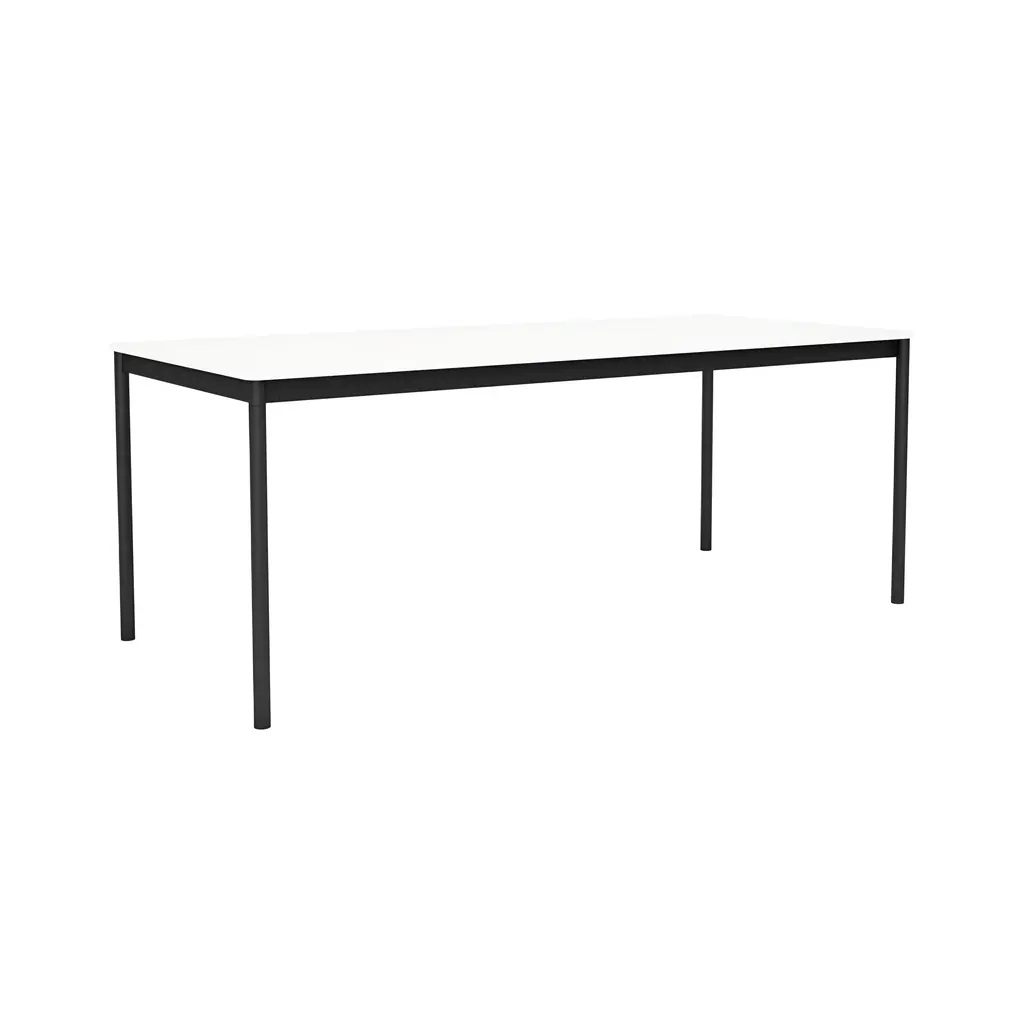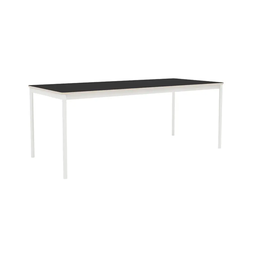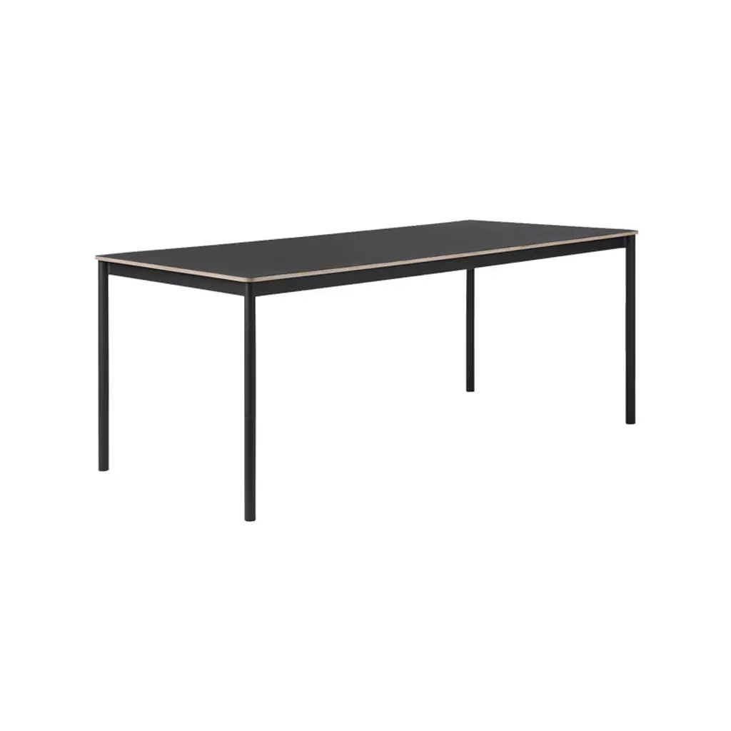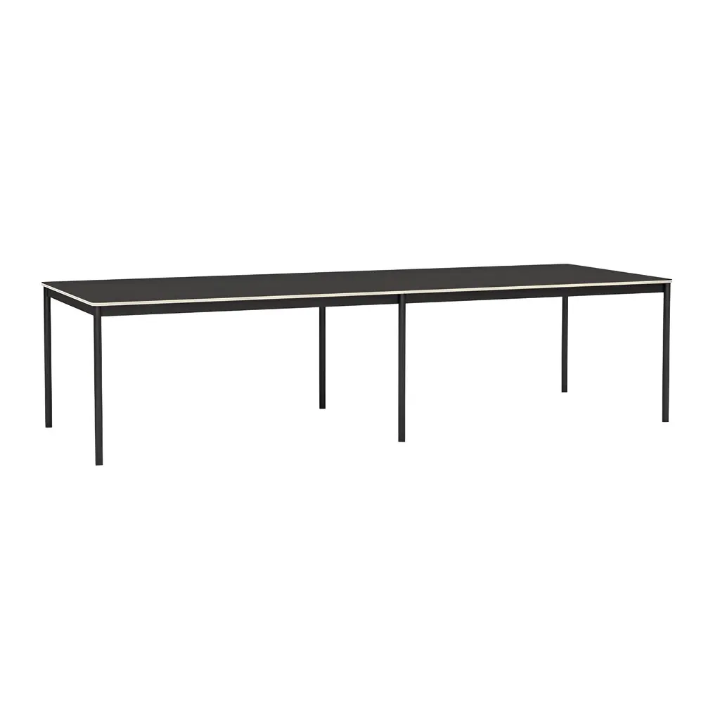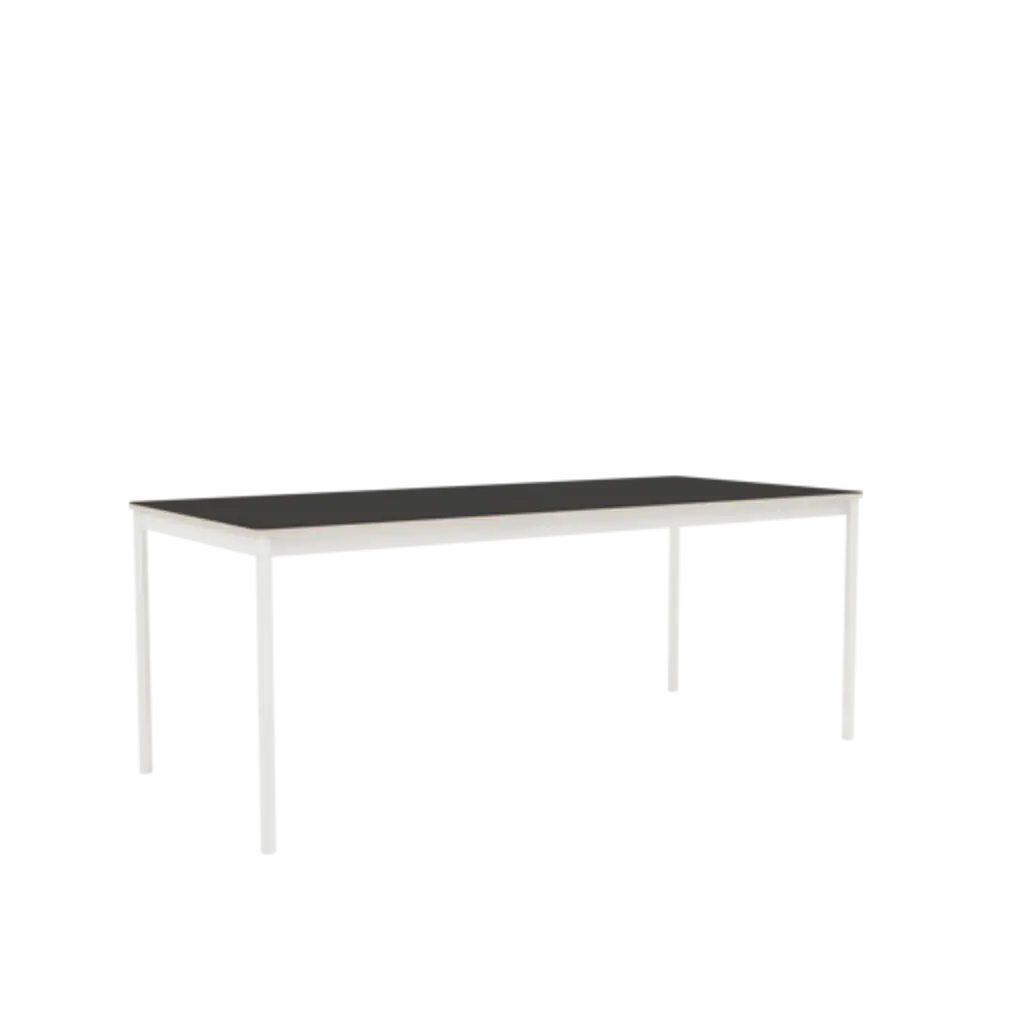 The largest iteration in the Base series expands on Finnish designer Mika Tolvanen's original inspiration, taken from the archetypal table shape. To create a solution with character and yet the versatility to adapt to varied interior styles was as much a priority for Mika as sufficient sturdiness for robust daily duty. The slim and lightweight table belies its appearance with a extruded aluminum frame, its structural strength achieved in an innovative production process. Tabletop in laminate or black lino variations. From Danish maker Muuto, the nearly limitless possibilities for use at home or work.