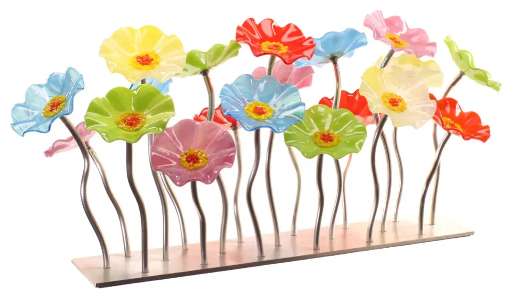 Kiln formed glass flowers are screwed onto the end of each aluminum stem and configured in these vibrant colors. The base is shaped in a long rectangle with flowers facing in all directions making it a perfect table centerpiece. Each piece is unique. Exact arrangement and colors may vary slightly.