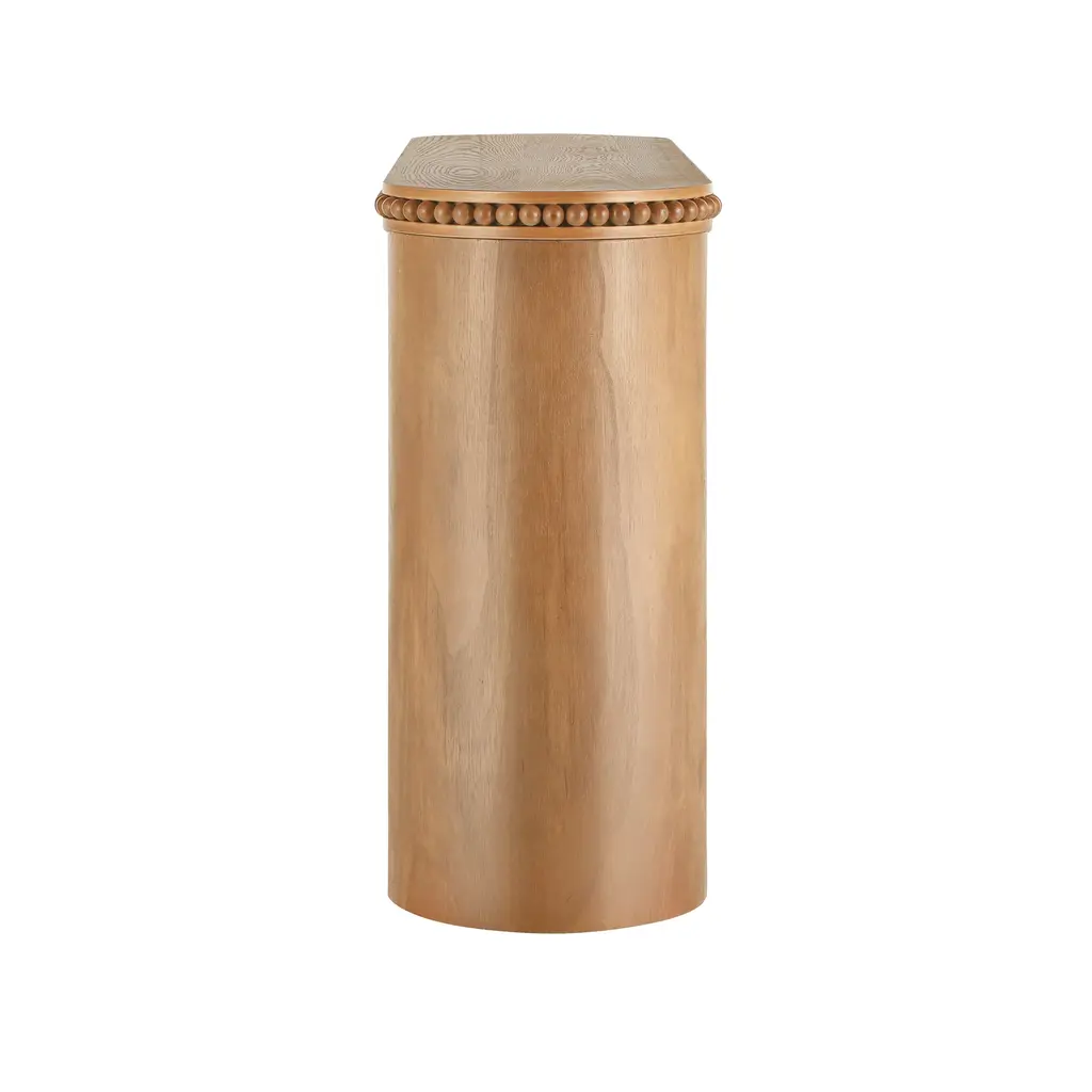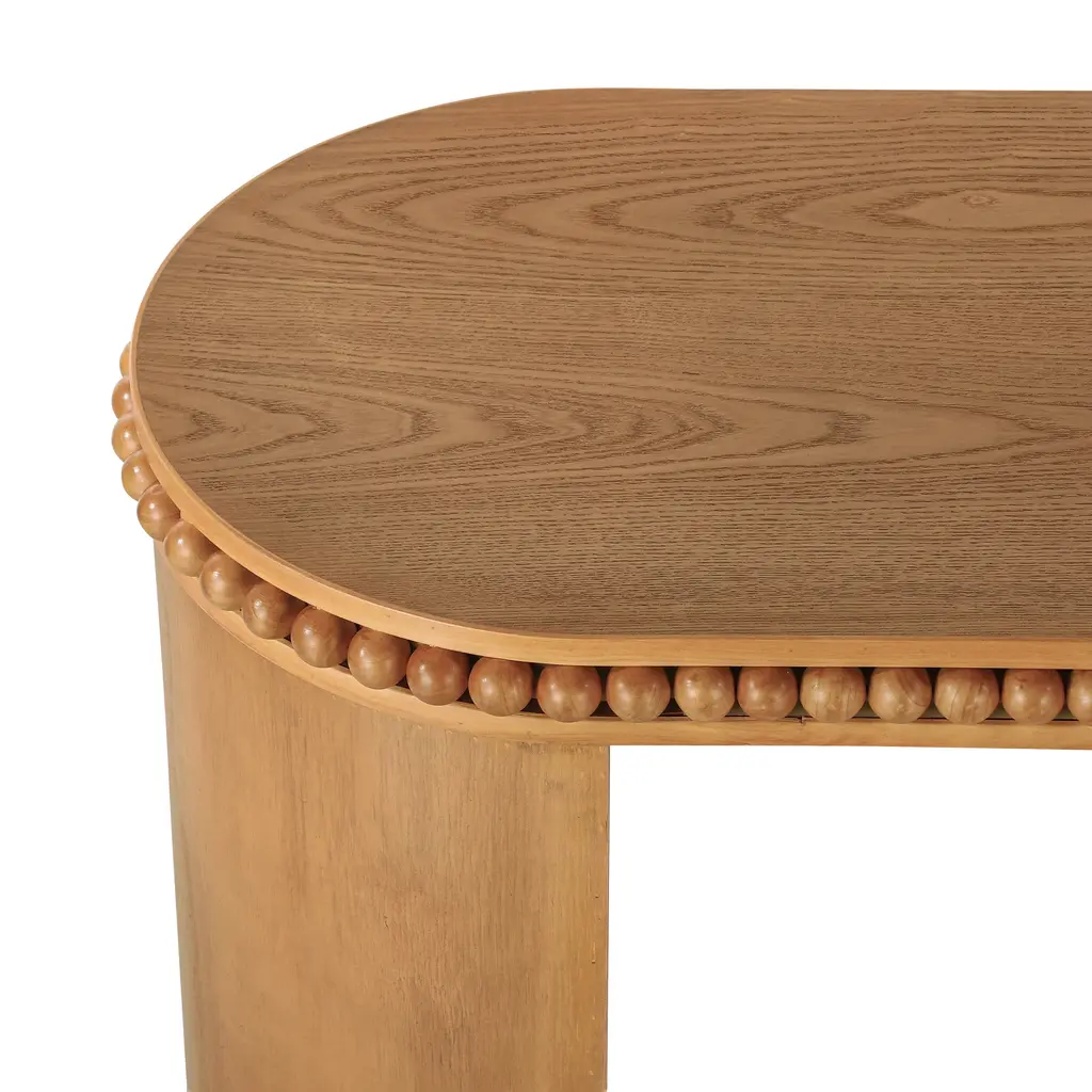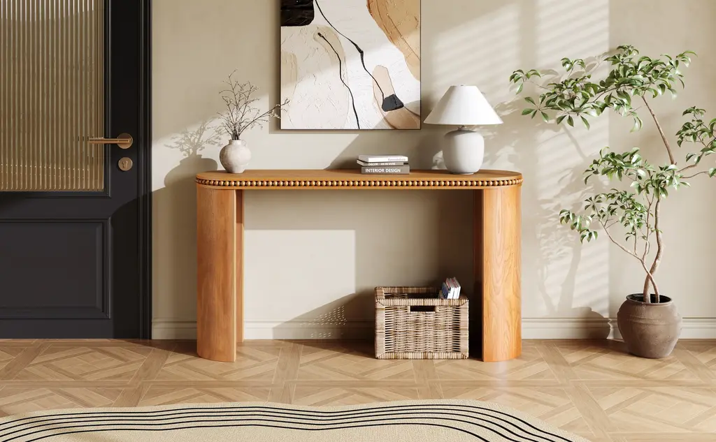 Elegant Beaded Detailing and Clean Silhouette: Featuring a gently curved profile and a decorative beaded trim along the tabletop, this console table blends classical charm with minimalist elegance—perfect for refined spaces. Reversible Curved Column Legs – Customizable Look: The unique curved legs can be installed facing inward or outward, allowing you to personalize the table’s look based on your space or taste—easy DIY-friendly design. Real Wood Veneer with Natural Texture: Crafted from engineered wood with a real wood veneer finish, this table showcases beautiful natural grain patterns that deliver the look of solid wood with everyday durability. Sturdy and Sculptural Base Design: The thick, curved legs not only create a graceful visual flow but also provide a solid, stable base—balancing beauty and function in one elegant piece. Perfect for Entryway Display or Decor: Its compact size and eye-catching design make it ideal for showcasing candles, vases, or framed art in an entryway, hallway, or behind a sofa.